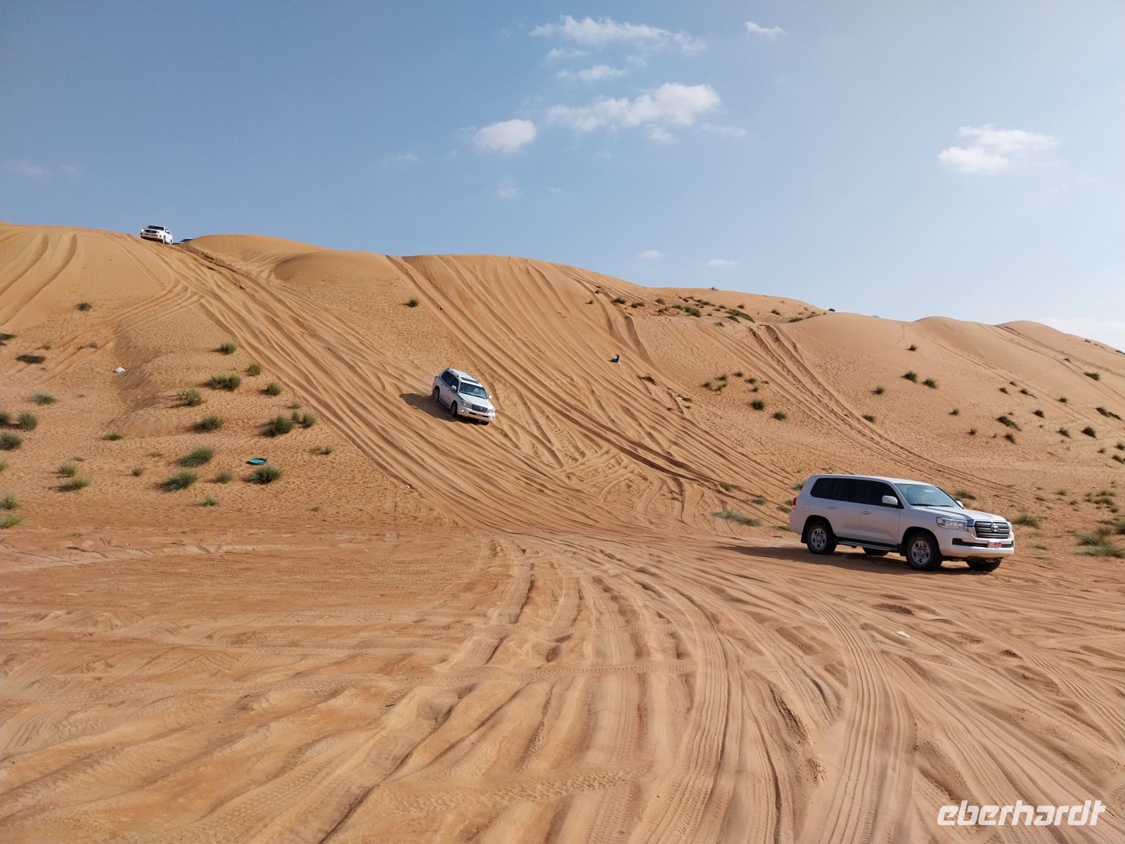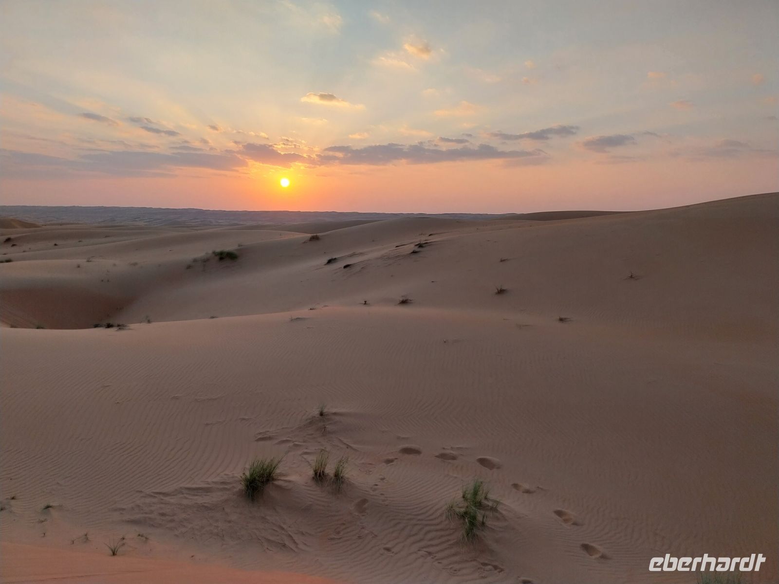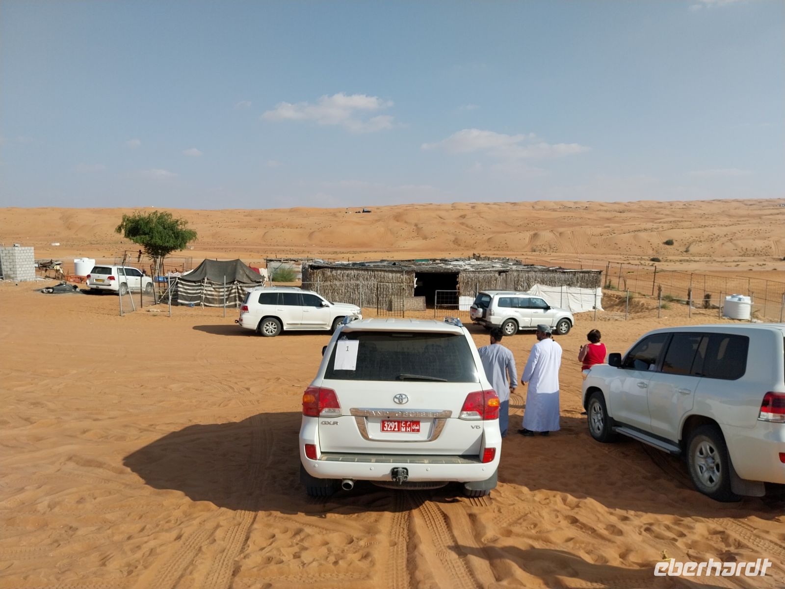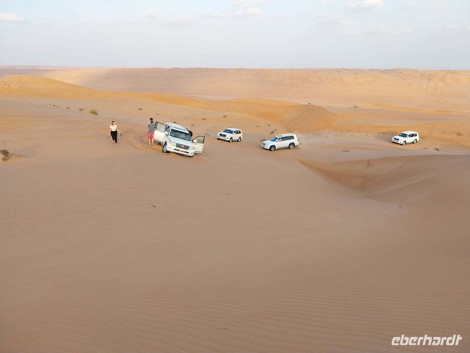 Nun geht es mit unseren Allradwagen hinein in das rotbraune Sandmeer der Wahiba Sands. Nach etwas Dune Bushing halten wir an einem „Beduin House“ wo wir traditionell mit Kardamomkaffee und Datteln bewirtet werden. Die kommende Nacht werden wir in der Wüste im Thousand Nights Camp verbringen. Dieses befindet sich etwa 40 km tief in der Wahiba Sands. So haben wir bis zum Wüstencamp eine interessante Fahrt durch die Dünentäler. Nach dem Check-In steigen wir wieder in unsere Jeeps, um auf einen möglichst hohen Punkt in der Dünenlandschaft zu gelangen. Ziel ist ein exklusiver Platz für den Sonnenuntergang. Allerdings haben einige Fahrzeuge Mühe im tiefen Sand und ein Jeep steckt so tief fest, dass es fast eine Stunde braucht, um ihn wieder in Gang zu bringen. In der Zwischenzeit sitzen wir entspannt auf „unserer“ Düne und genießen einen romantischen Sonnenuntergang.