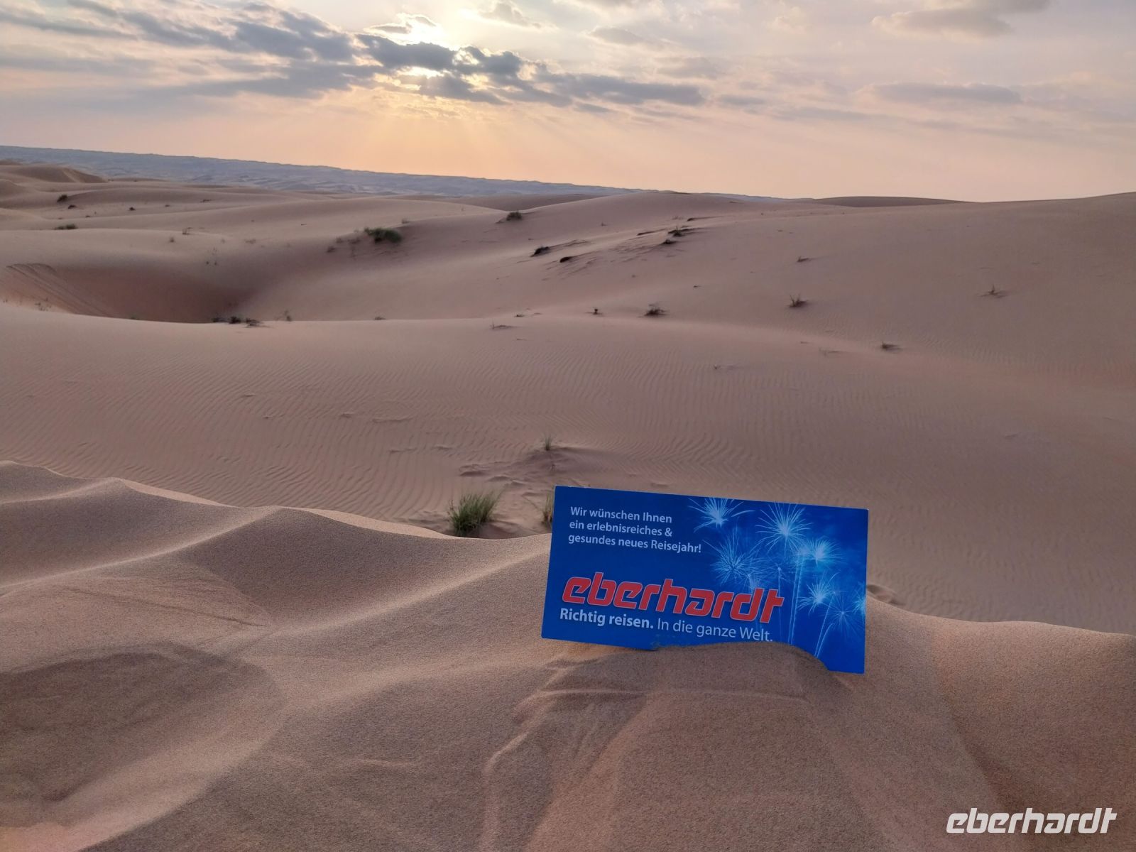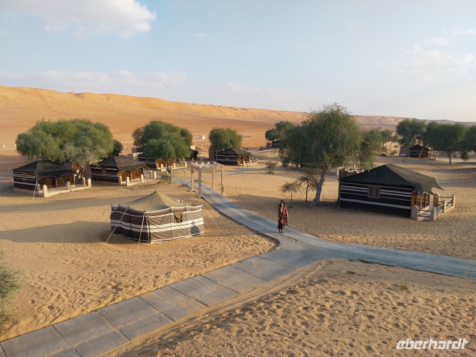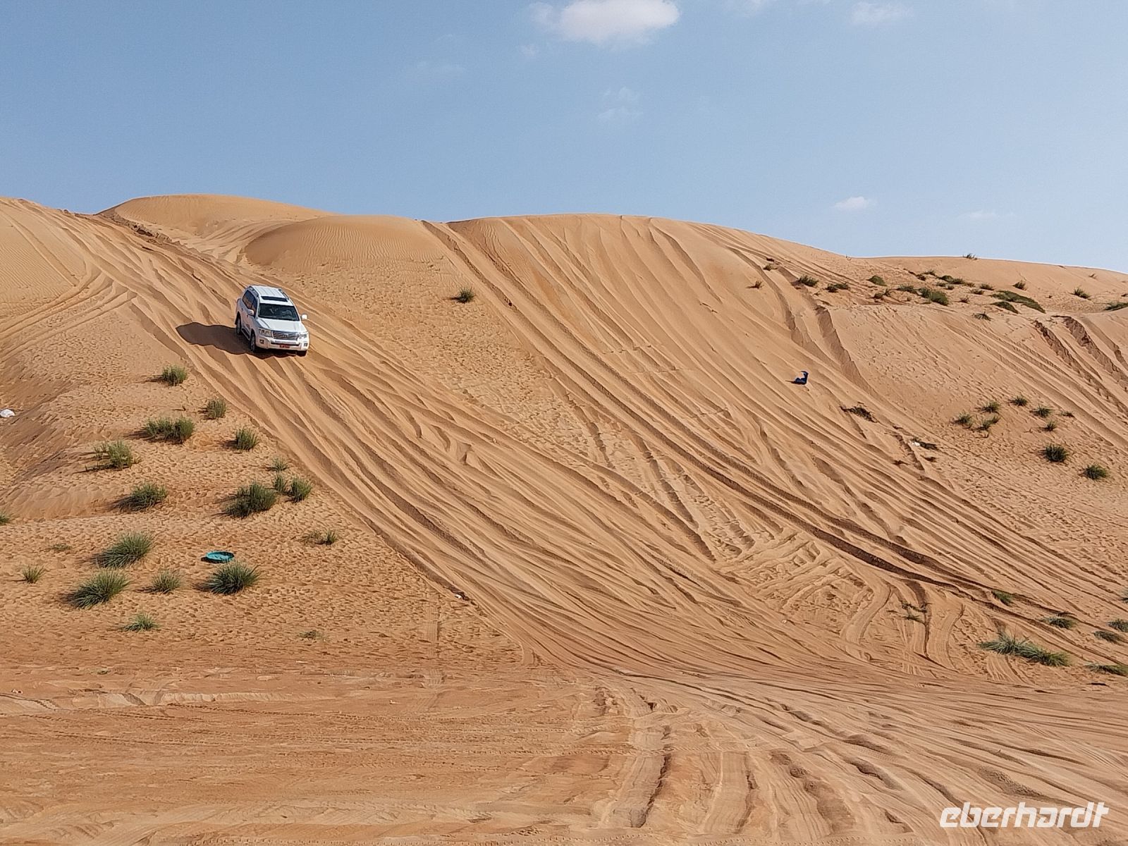 Nun geht es mit unseren Allradwagen hinein in das rotbraune Sandmeer der Wahiba Sands. Nach etwas Dune Bushing halten wir an einem „Beduin House“ wo wir traditionell mit Kardamomkaffee und Datteln bewirtet werden. Die kommende Nacht werden wir in der Wüste im Thousand Nights Camp verbringen. Dieses befindet sich etwa 40 km tief in der Wahiba Sands. So haben wir bis zum Wüstencamp eine interessante Fahrt durch die Dünentäler. Nach dem Check-In steigen wir wieder in unsere Jeeps, um auf einen möglichst hohen Punkt in der Dünenlandschaft zu gelangen. Ziel ist ein exklusiver Platz für den Sonnenuntergang. Allerdings haben einige Fahrzeuge Mühe im tiefen Sand und ein Jeep steckt so tief fest, dass es fast eine Stunde braucht, um ihn wieder in Gang zu bringen. In der Zwischenzeit sitzen wir entspannt auf „unserer“ Düne und genießen einen romantischen Sonnenuntergang.