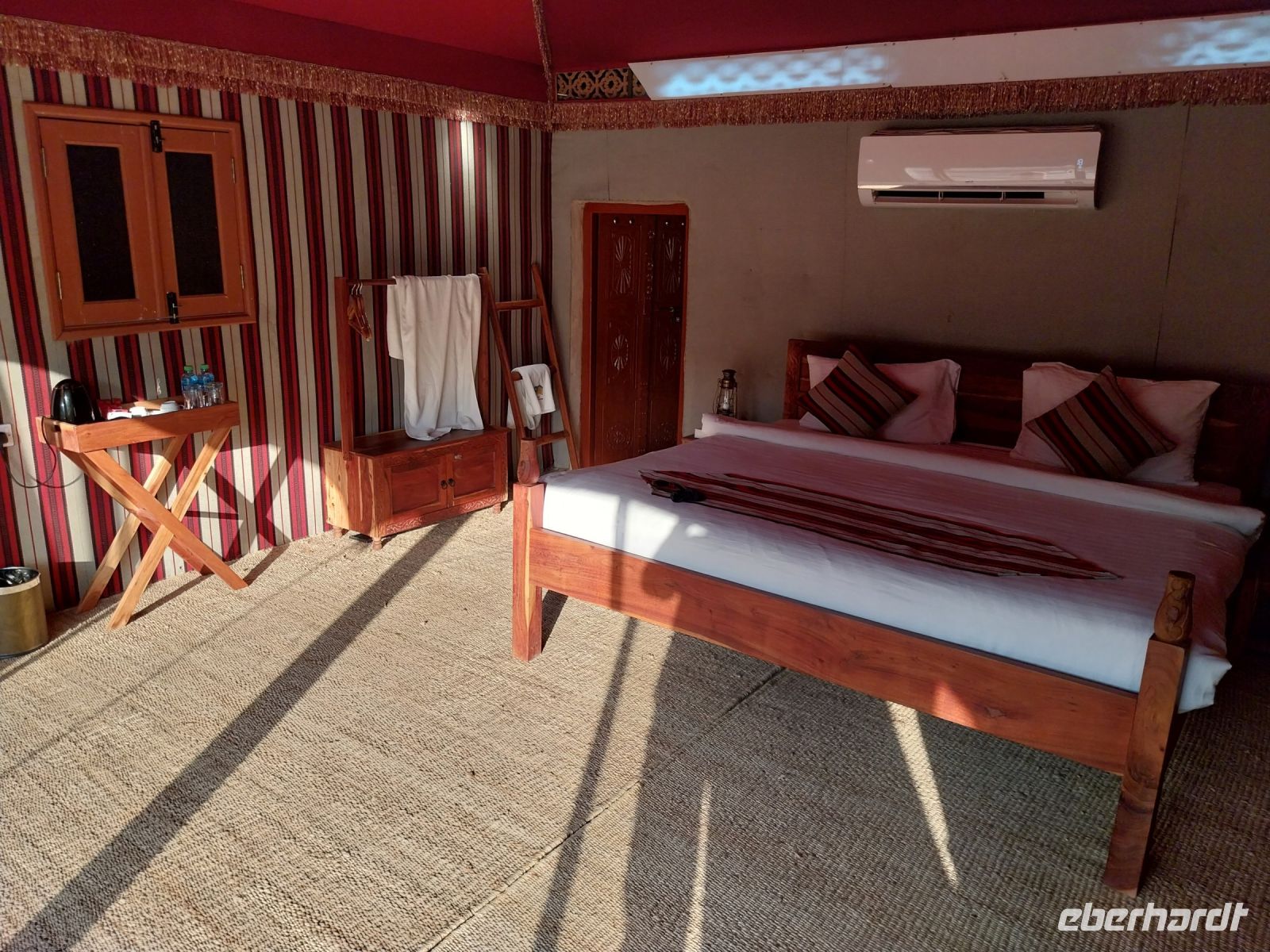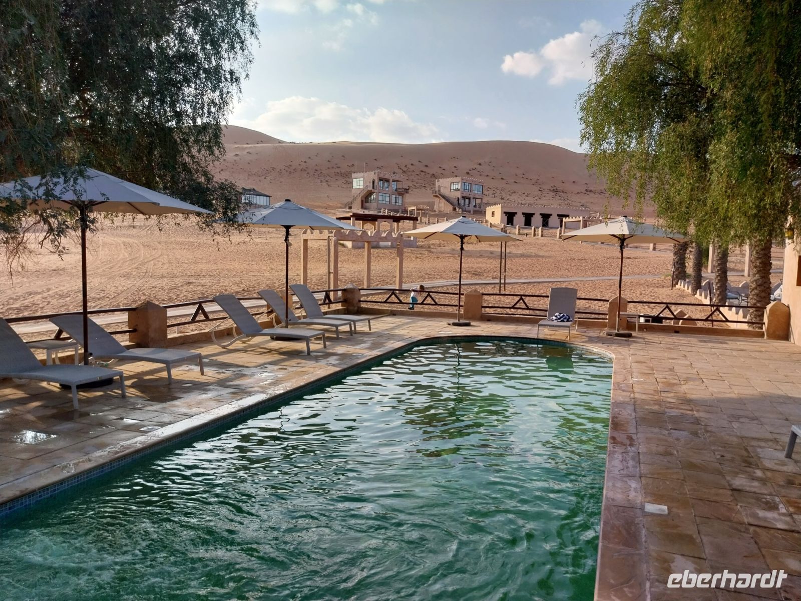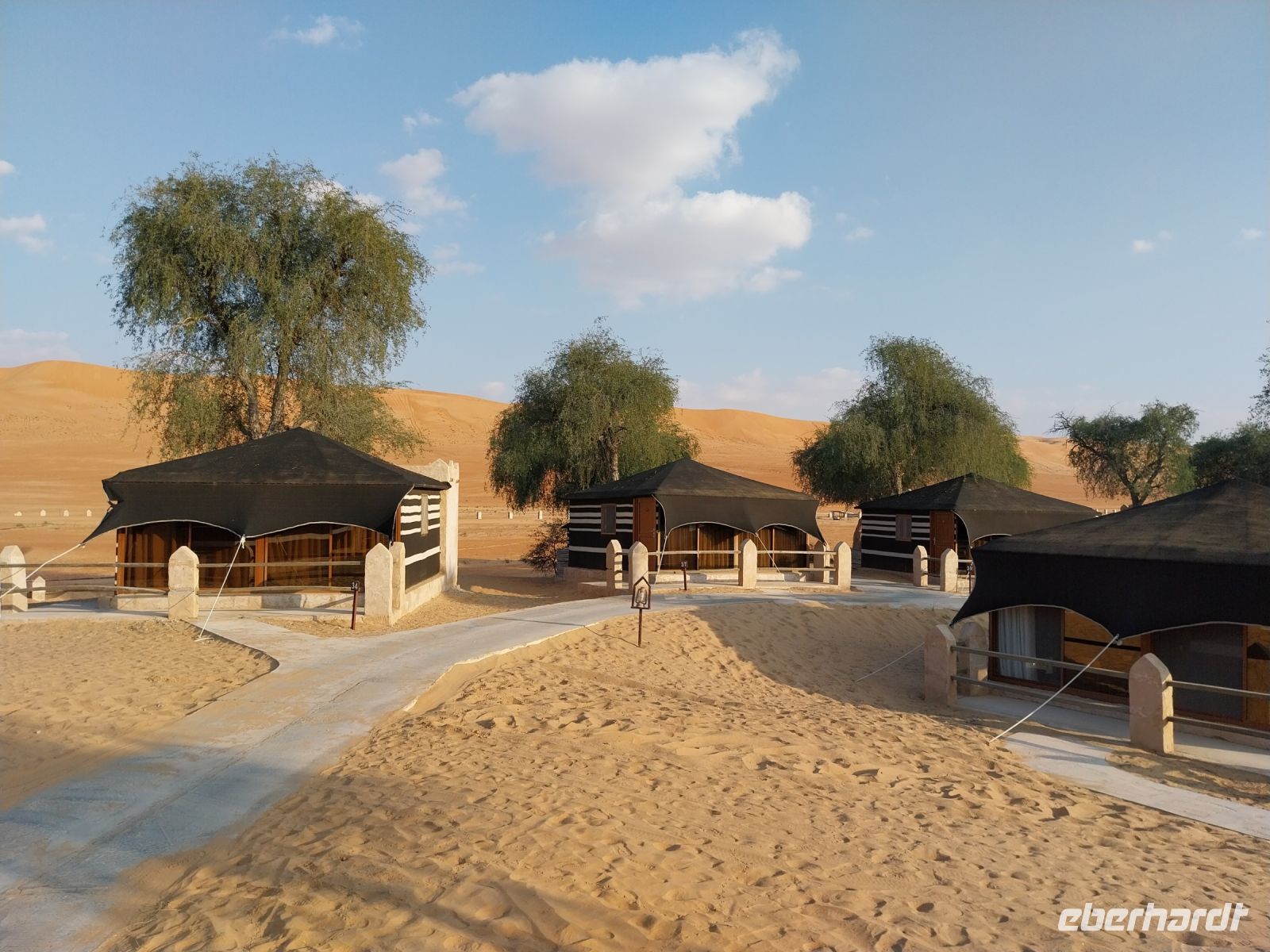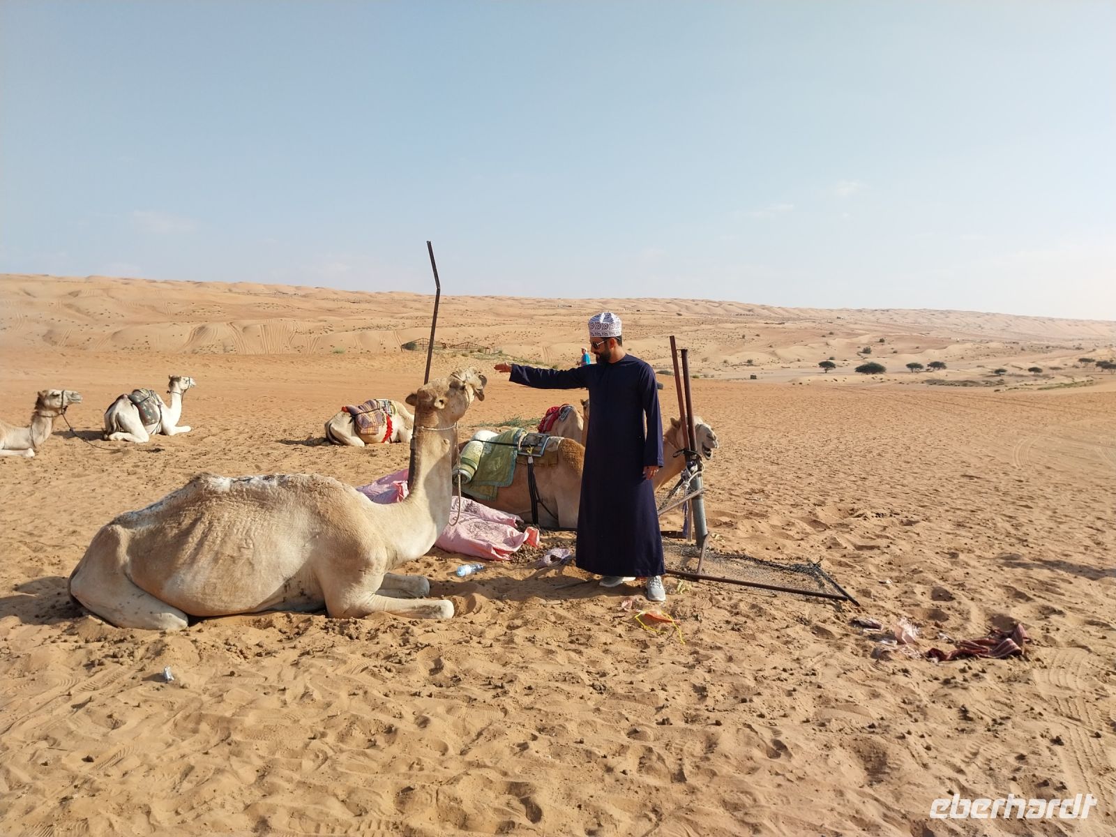 Nun geht es mit unseren Allradwagen hinein in das rotbraune Sandmeer der Wahiba Sands. Nach etwas Dune Bushing halten wir an einem „Beduin House“ wo wir traditionell mit Kardamomkaffee und Datteln bewirtet werden. Die kommende Nacht werden wir in der Wüste im Thousand Nights Camp verbringen. Dieses befindet sich etwa 40 km tief in der Wahiba Sands. So haben wir bis zum Wüstencamp eine interessante Fahrt durch die Dünentäler. Nach dem Check-In steigen wir wieder in unsere Jeeps, um auf einen möglichst hohen Punkt in der Dünenlandschaft zu gelangen. Ziel ist ein exklusiver Platz für den Sonnenuntergang. Allerdings haben einige Fahrzeuge Mühe im tiefen Sand und ein Jeep steckt so tief fest, dass es fast eine Stunde braucht, um ihn wieder in Gang zu bringen. In der Zwischenzeit sitzen wir entspannt auf „unserer“ Düne und genießen einen romantischen Sonnenuntergang.