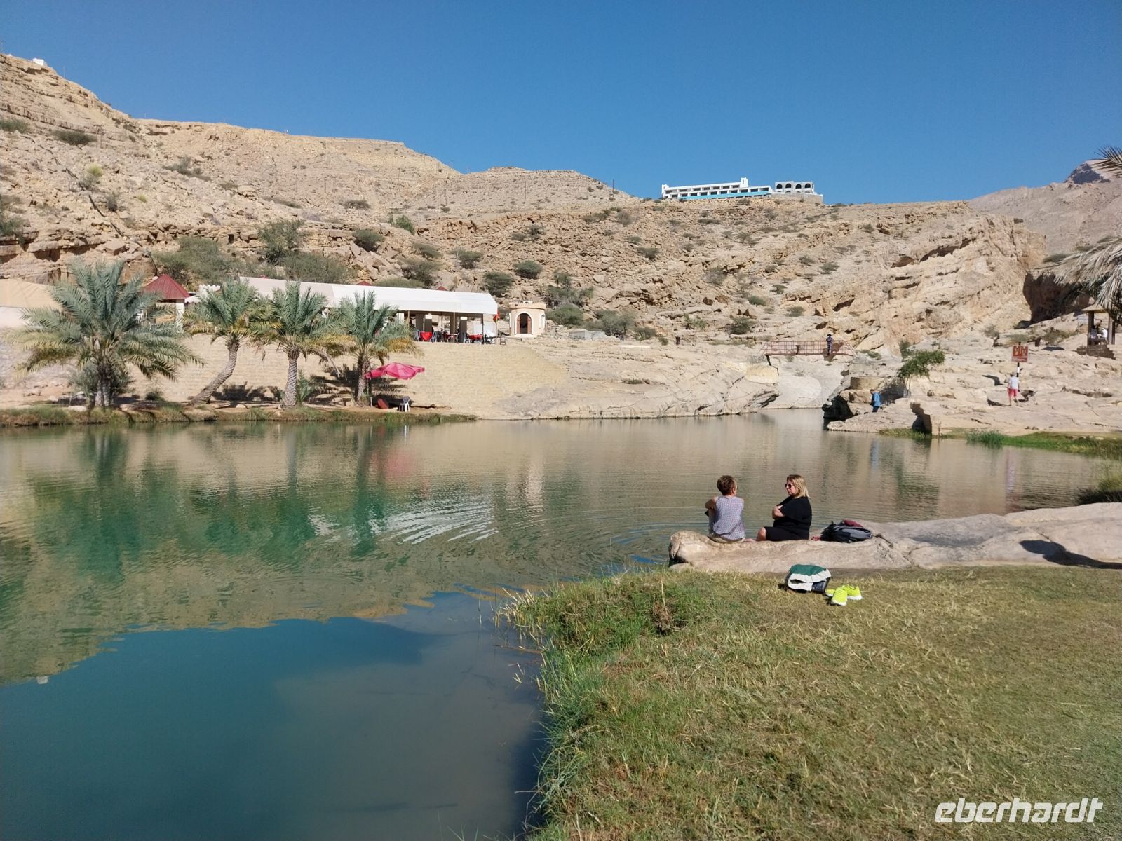 Die Oase Nakhl, unser nächstes Ziel liegt abseits der Küste. Am Fuße des Hajargebirges befindet sich inmitten der Oase die Festung von Nakhl auf einem etwa 60 Meter hohen Felsen. Von oben haben wir einen wunderschönen Ausblick auf zahlreiche Dattelpalmen und die naheliegenden Berge. Am Rande der Oase tritt eine heiße Quelle aus den Bergen. Man nennt sie Ain Thowarah, ein netter Platz für unser Picknick und nochmals für ein Fußbad mit Pediküre.