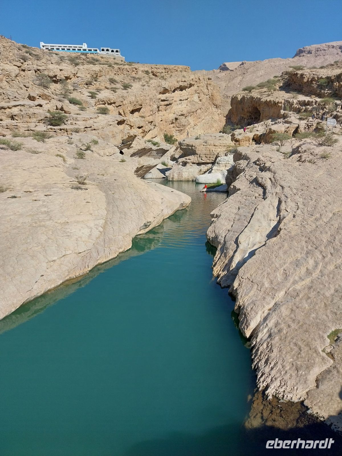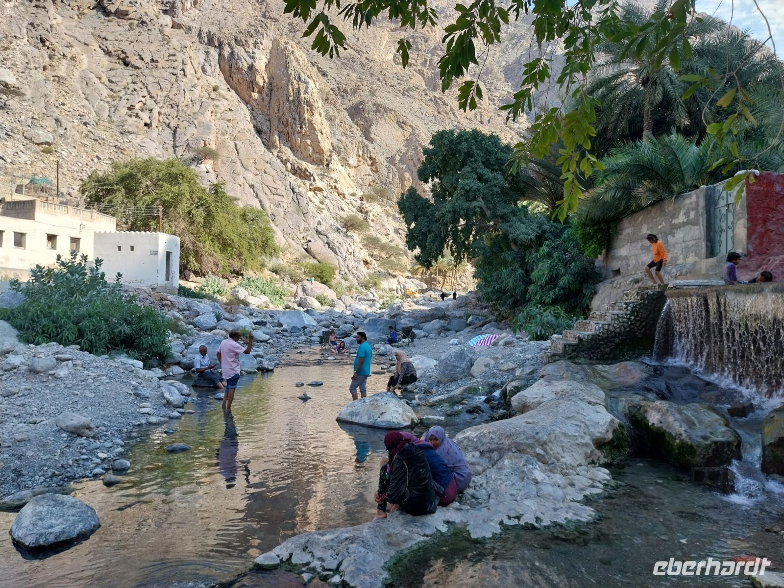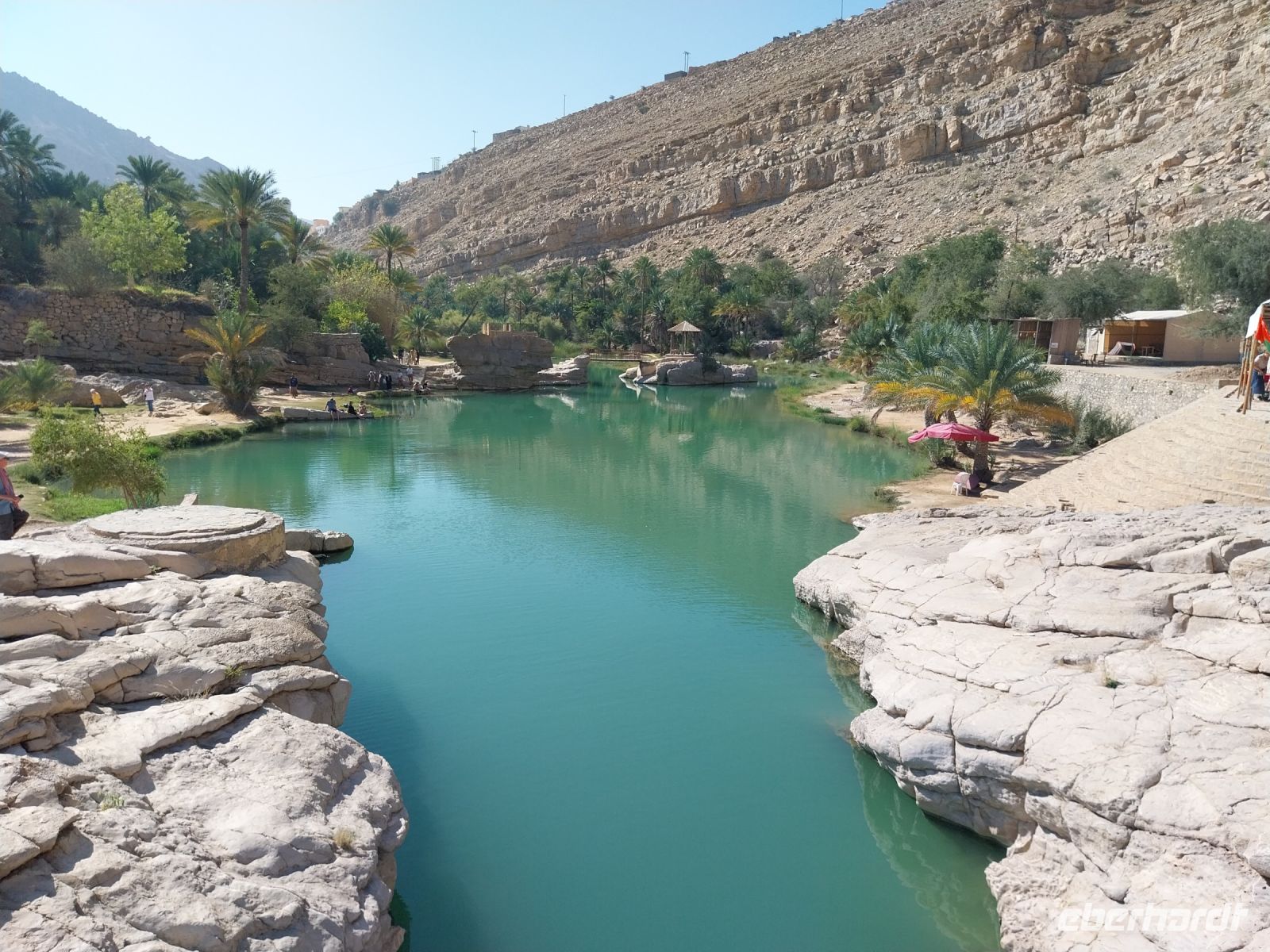 Es ist kalt geworden, aber bald wird die Morgensonne die Temperaturen auf angenehme Werte steigen lassen. Es folgen noch einmal so 40 Kilometer Wüstenfahrt. Die Sonne steht noch tief, was dazu führt, dass die langen Schatten der Sanddünen für eine wunderschöne Kulisse sorgen. Nach dem Verlassen der Wahiba Sands muss erst einmal der Reifendruck unserer Fahrzeuge wieder auf Normalwerte gebracht werden. Eben noch Wüste sind wir nun ein paar Minuten später wieder in den Bergen des Hajar Gebirges. Hinein geht es in die Schlucht des Wadi Bani Khalid. In diesem von steil abfallenden Bergen gesäumten Tal befinden sich blau schimmernde Wasserpools, die zum Schwimmen und Verweilen einladen. Wer seine Füße in das angenehm warme Wasser hält, bekommt von den Putzerfischen eine Gratispediküre ?. Gut ist, dass wir schon am Morgen hier sind. Es kommen nach und nach immer mehr Besucher in dieses beliebte Wadi.