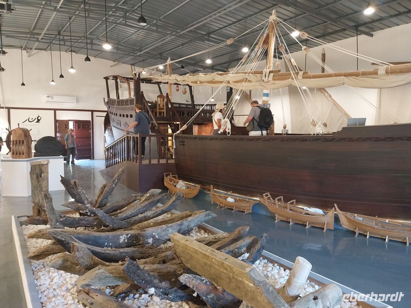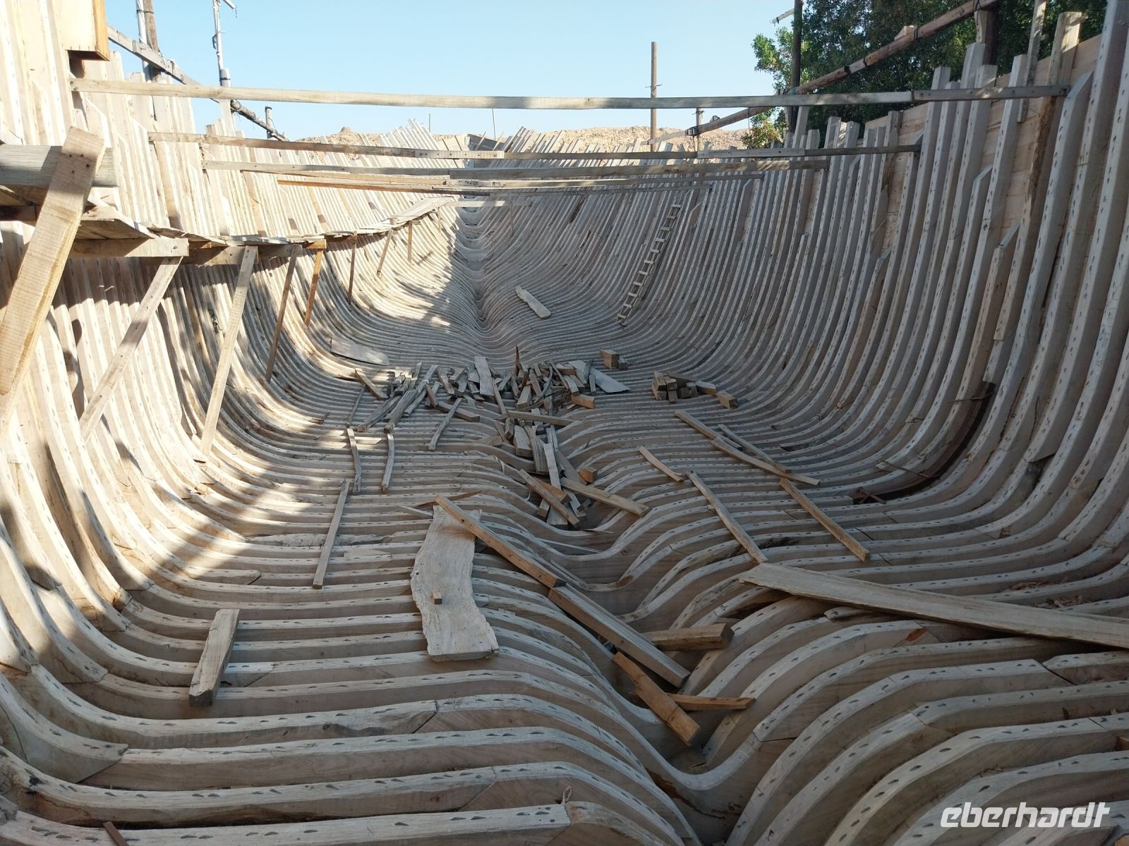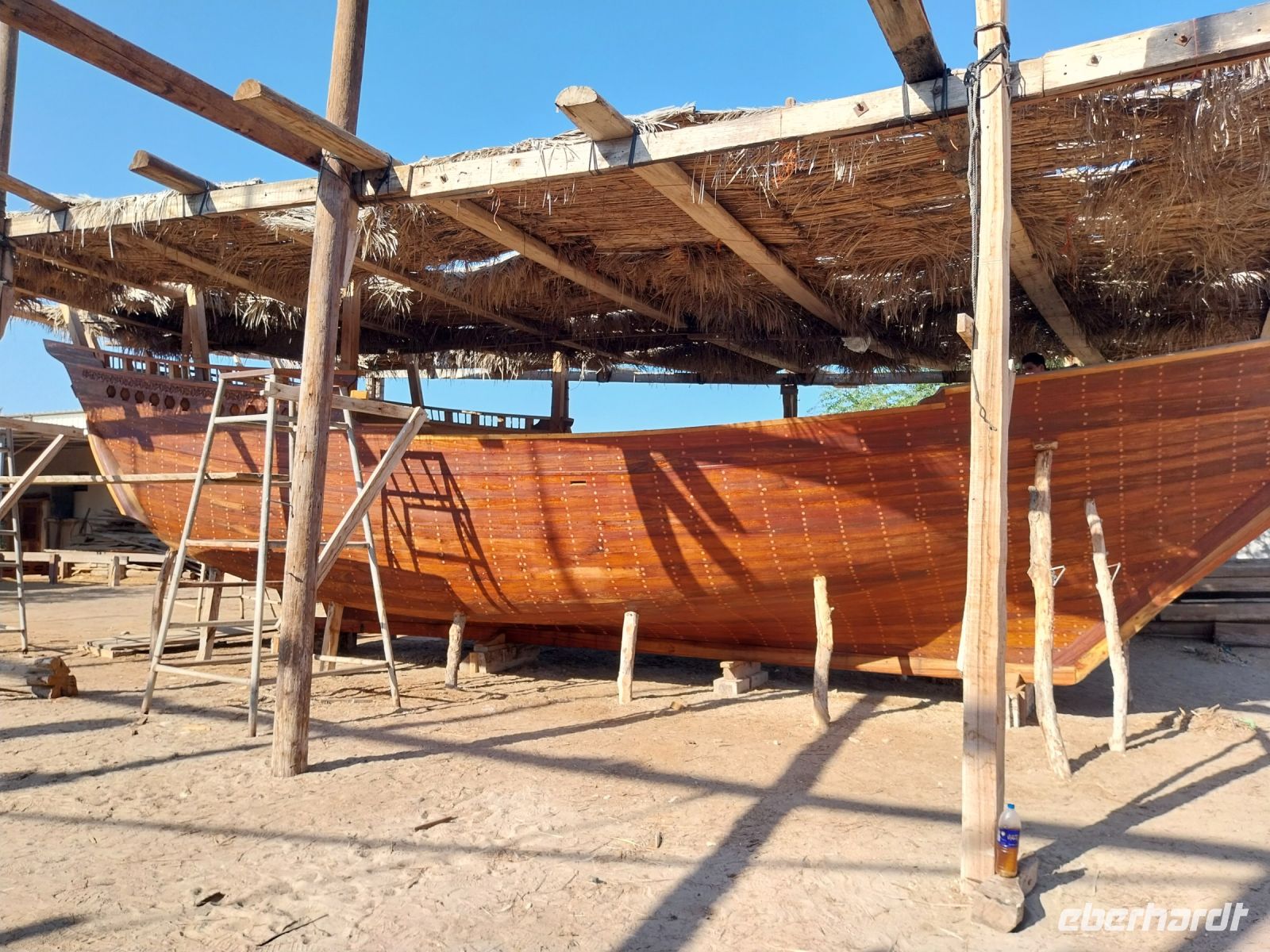 Nach Wüste, Berge und grünem Wadi wenden wir uns mittags der Küste zu. In Sur an der Lagune neben der Brücke haben wir unser Picknick. Heute hauptsächlich Obst wie Melone, omanische Bananen und Datteln…also leichte Kost angesichts dessen, dass uns heute Abend ein üppiges Buffet erwartet. Nicht weit nebenan besuchen wir die sogenannte Dhauwerft. „Werft“ ist sicherlich etwas übertrieben, aber immerhin befinden sich zwei Dhaus im Bau und wir bekommen einen Eindruck, wie die traditionellen Holzschiffe gebaut werden. Es ist eine der wenigen Manufakturen auf der wenigen Orte auf der Arabischen Halbinsel, wo dieses Handwerk noch ausgeübt wird.