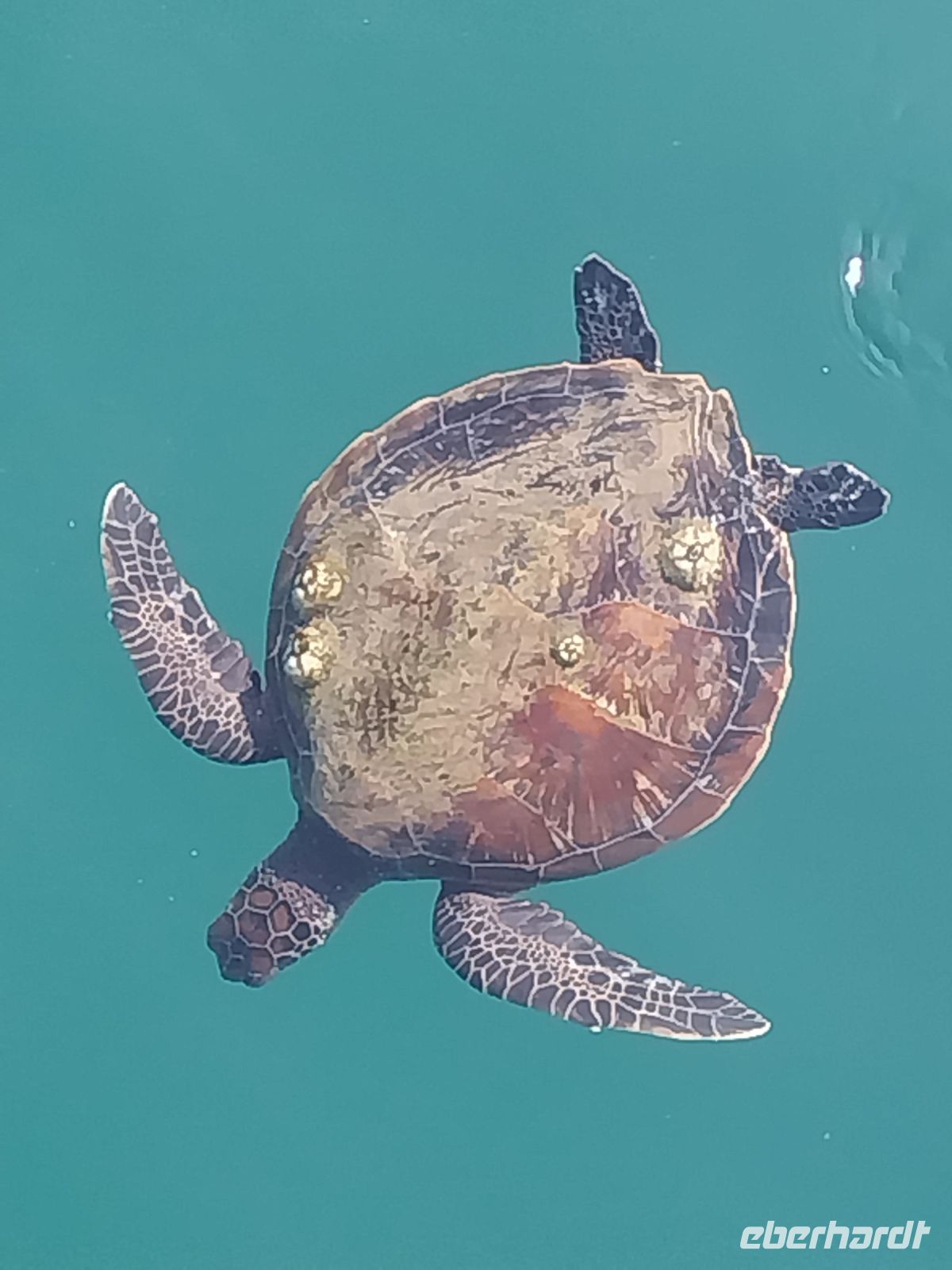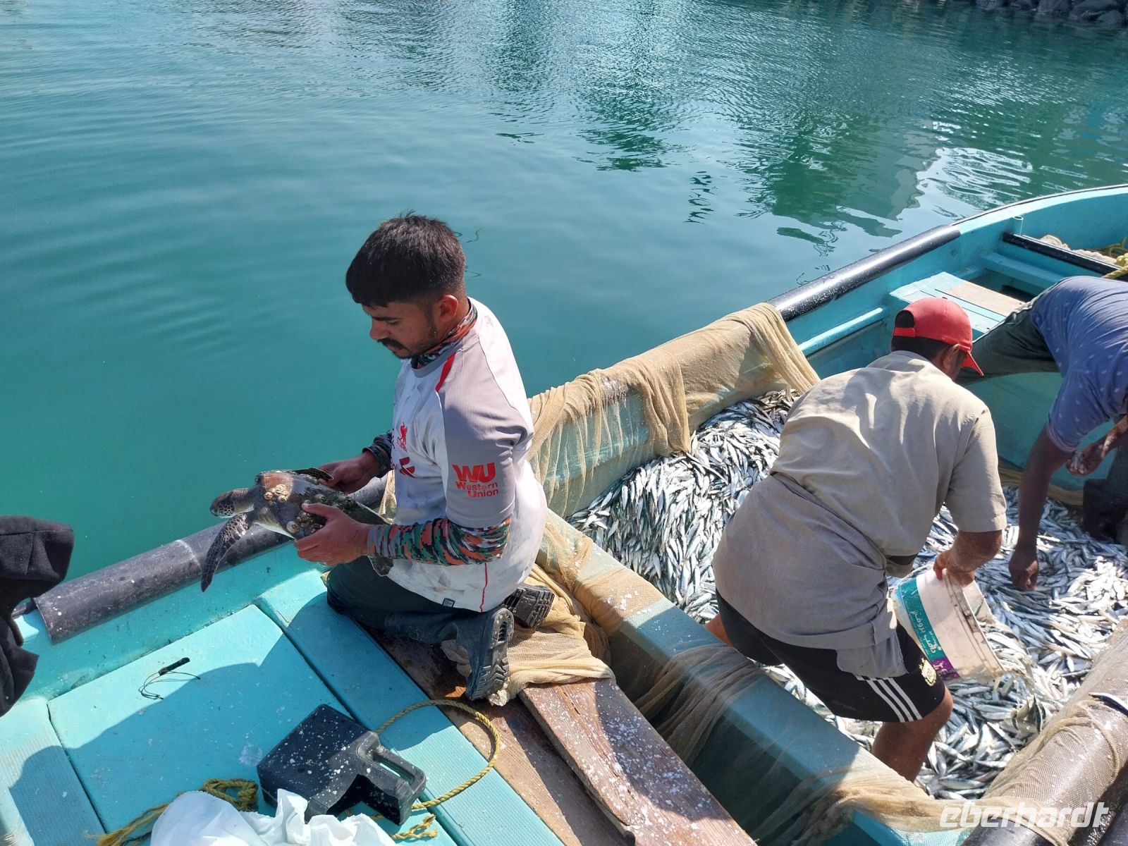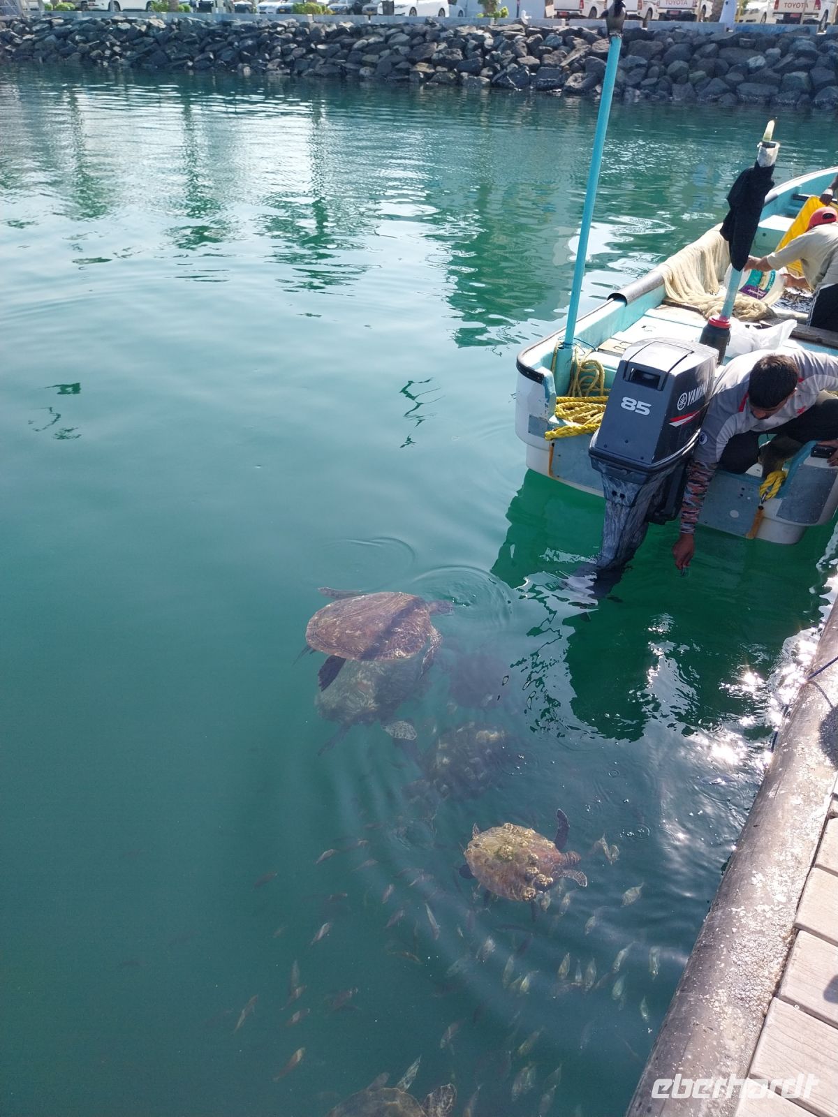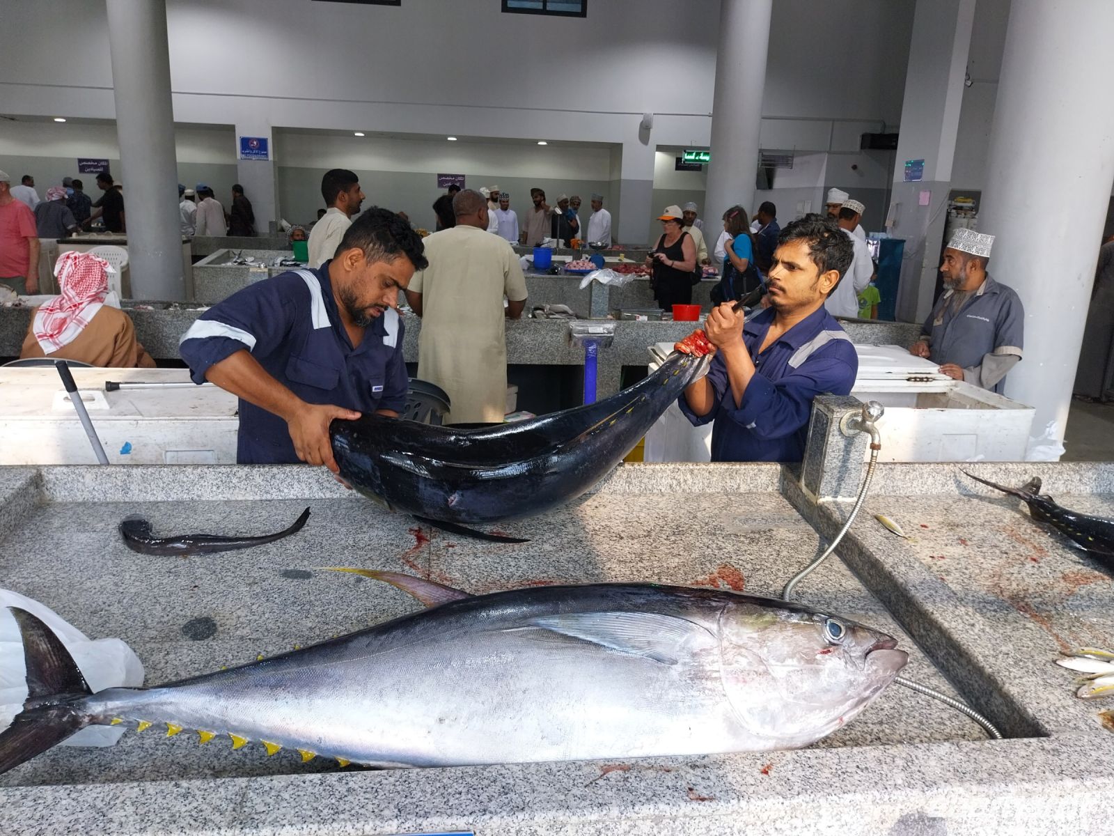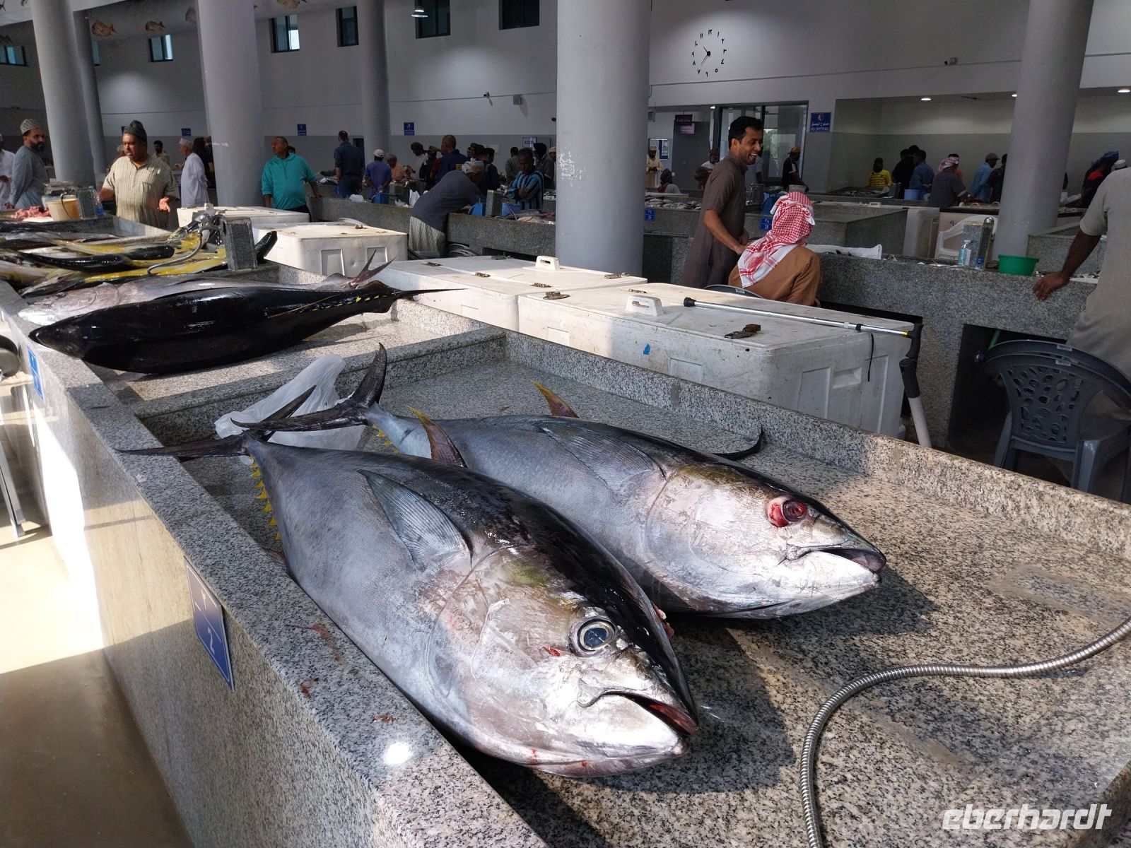Im Küstenort Barka besichtigen wir den großen Fischmarkt. In der modernen klimatisierten Halle werden frisch gefangene Königsmakrelen, Thunfische, Sardinen, Barrakudas, u. a. m. zum Kauf angeboten. Während wir am Steg im Hafen beim Ausladen der Sardinen zuschauen, entdecken wir eine Meeresschildkröte im Hafenbecken. Angelockt von ein paar Sardinen kommen bald noch mehr Schildkröten.