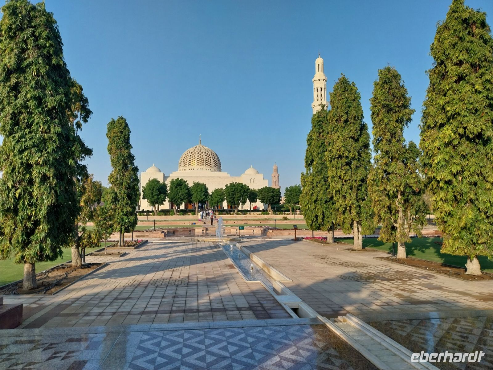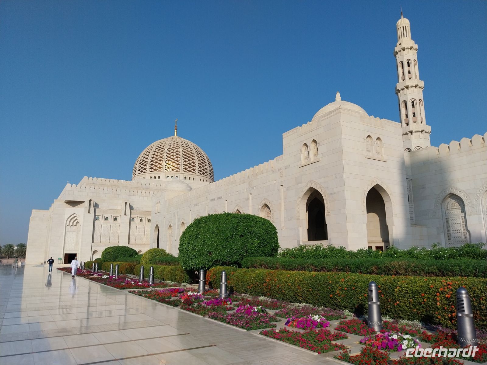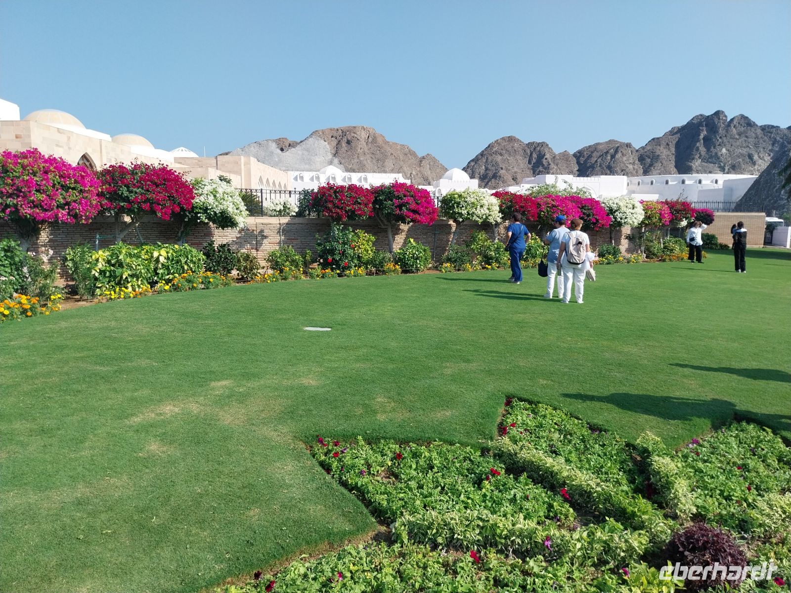 Heute starten wir schon um 8.00 Uhr, damit wir die Große Sultan Qaboos Moschee rechtzeitig vor dem großen Besucherandrang besichtigen können. Neben der Moschee in Salalah ist es die einzige Moschee im Oman, welche für Nichtmuslime zugänglich ist. Nachdem die Frauen nach den Vorgaben des Islam ihre Reize bedeckt haben, betreten wir zunächst den blühenden Garten mit Wasserbächen. Ein Garten, welcher an das Paradies erinnern soll und den frommen Muslim nach dem Tod erwartet. Die riesige Moscheekuppel, polierte Böden aus Carrara-Marmor und der indische Sandstein des Moscheekomplexes strahlen in der Morgensonne. Zunächst betreten wir die Frauengebetshalle, welche 750 Muslima Platz zum Gebet bietet. Anschließend zeigt uns Hussain am Waschplatz, wie sich ein Muslim vor dem Gebet wäscht. In der prächtigen Männergebetshalle bewundern wir den handgeknüpften persischen Teppich aus einem Stück, den riesigen Swarovski-Leuchter sowie die azurblauen Fayencen der Gebetsnische. Da eine Freitagsmoschee oft eine Bildungsstätte ist, befindet sich hier auch eine Bibliothek und ein Bildungszentrum, wo Besucher bei omanischen Tee und Datteln verweilen können. Inzwischen sind auch die Busse eines Kreuzfahrtschiffes angekommen, Zeit zu gehen.