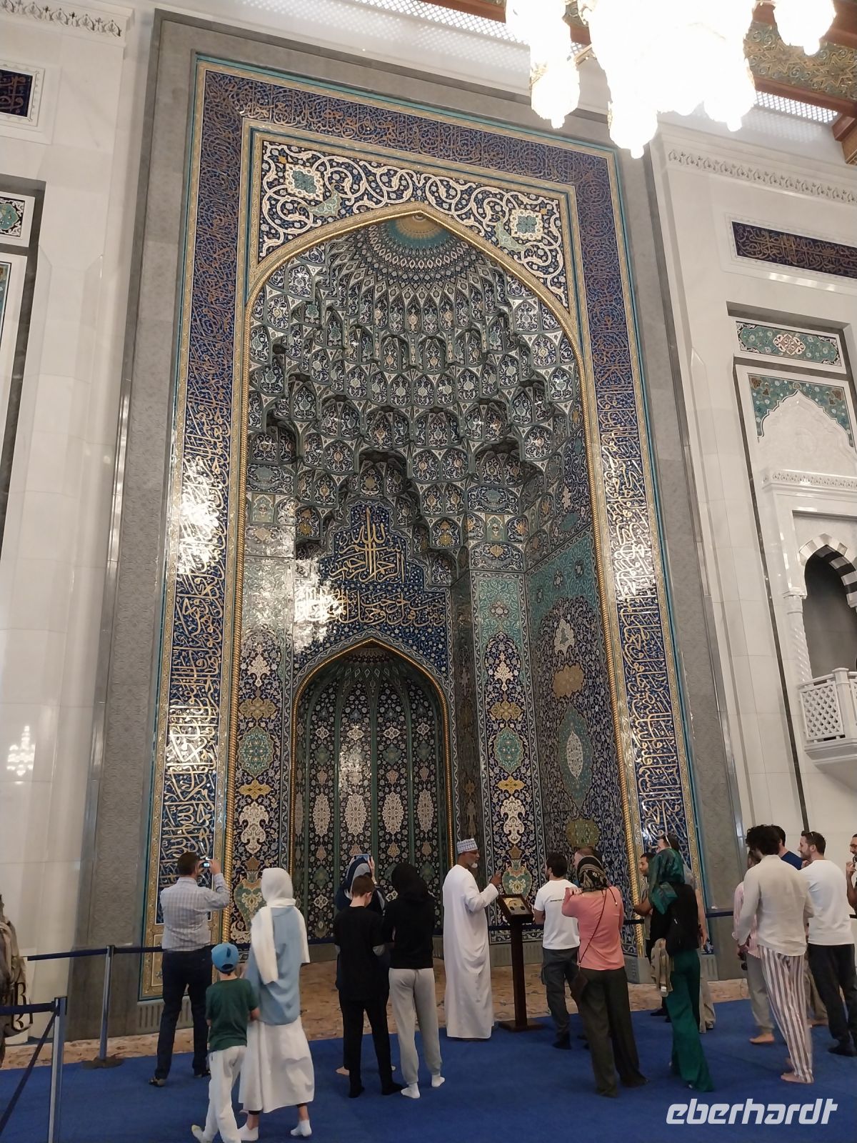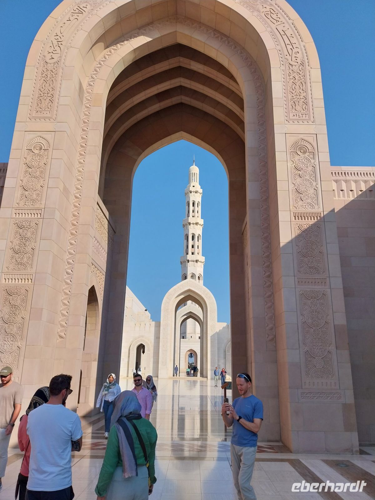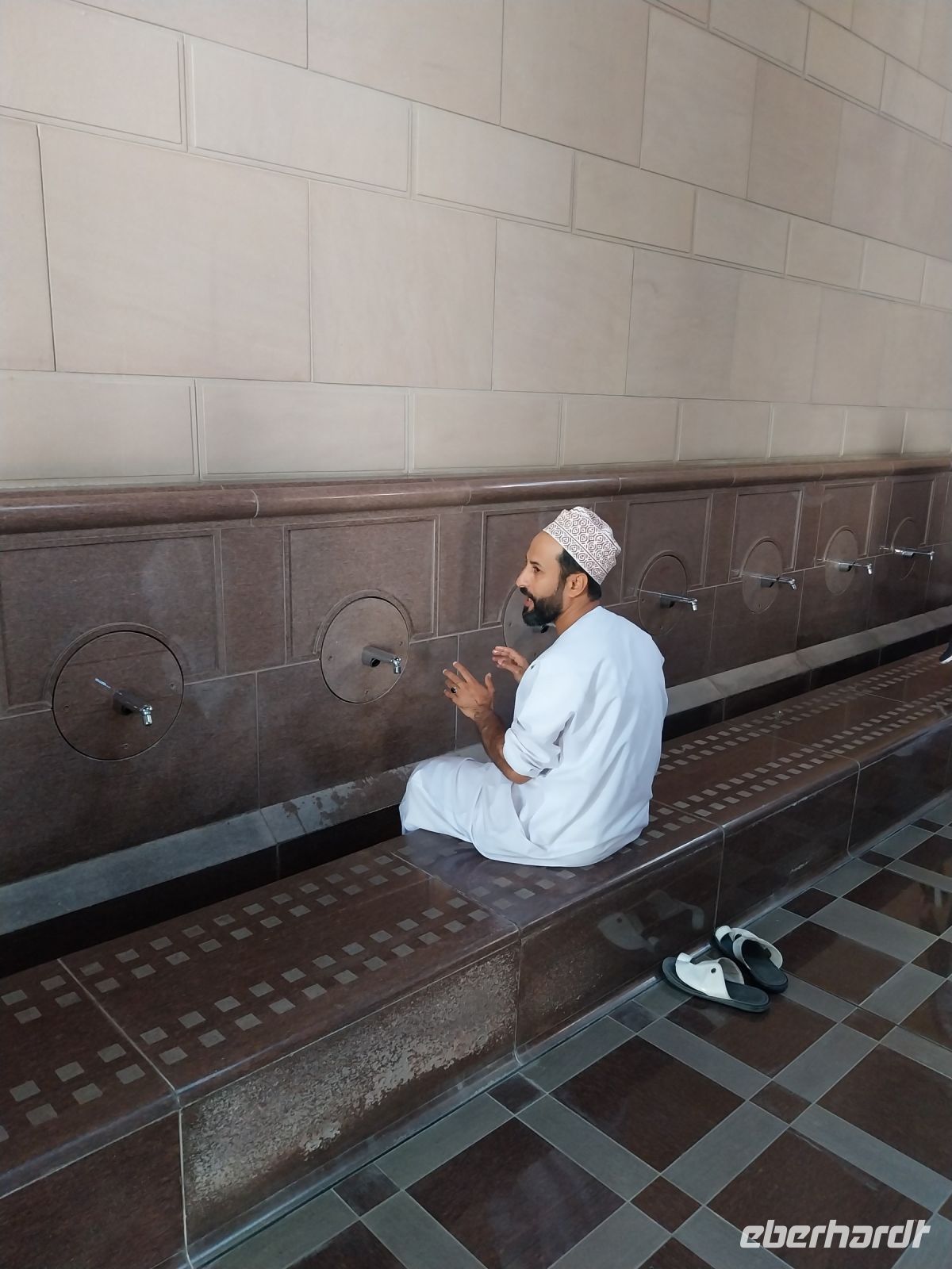 Heute starten wir schon um 8.00 Uhr, damit wir die Große Sultan Qaboos Moschee rechtzeitig vor dem großen Besucherandrang besichtigen können. Neben der Moschee in Salalah ist es die einzige Moschee im Oman, welche für Nichtmuslime zugänglich ist. Nachdem die Frauen nach den Vorgaben des Islam ihre Reize bedeckt haben, betreten wir zunächst den blühenden Garten mit Wasserbächen. Ein Garten, welcher an das Paradies erinnern soll und den frommen Muslim nach dem Tod erwartet. Die riesige Moscheekuppel, polierte Böden aus Carrara-Marmor und der indische Sandstein des Moscheekomplexes strahlen in der Morgensonne. Zunächst betreten wir die Frauengebetshalle, welche 750 Muslima Platz zum Gebet bietet. Anschließend zeigt uns Hussain am Waschplatz, wie sich ein Muslim vor dem Gebet wäscht. In der prächtigen Männergebetshalle bewundern wir den handgeknüpften persischen Teppich aus einem Stück, den riesigen Swarovski-Leuchter sowie die azurblauen Fayencen der Gebetsnische. Da eine Freitagsmoschee oft eine Bildungsstätte ist, befindet sich hier auch eine Bibliothek und ein Bildungszentrum, wo Besucher bei omanischen Tee und Datteln verweilen können. Inzwischen sind auch die Busse eines Kreuzfahrtschiffes angekommen, Zeit zu gehen.