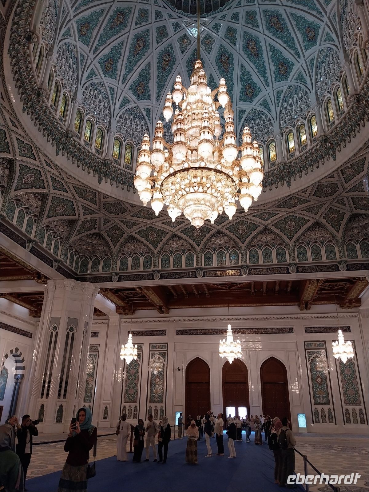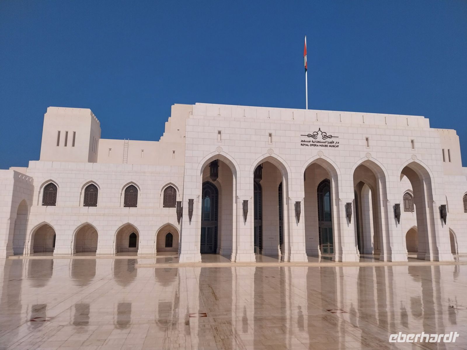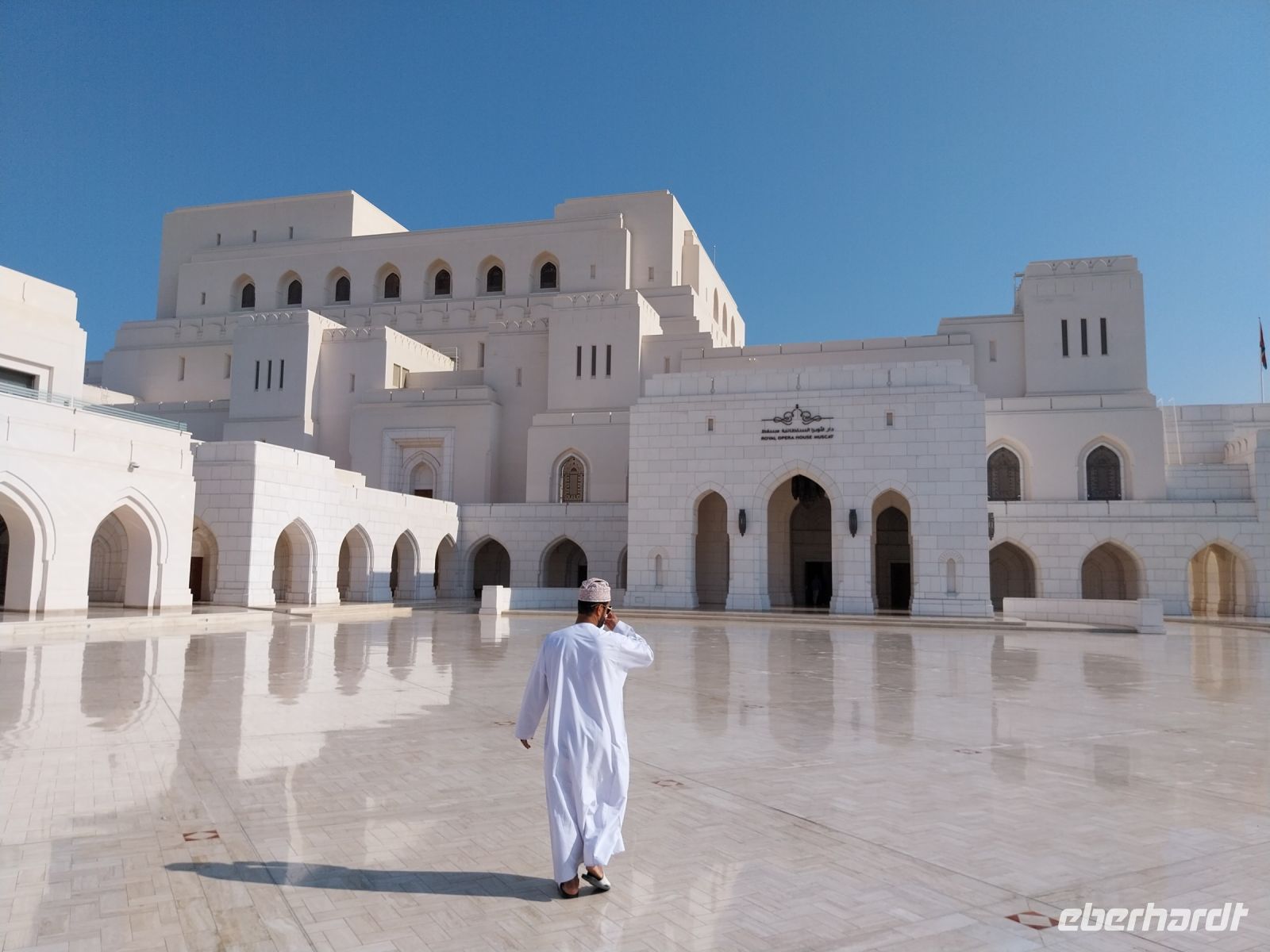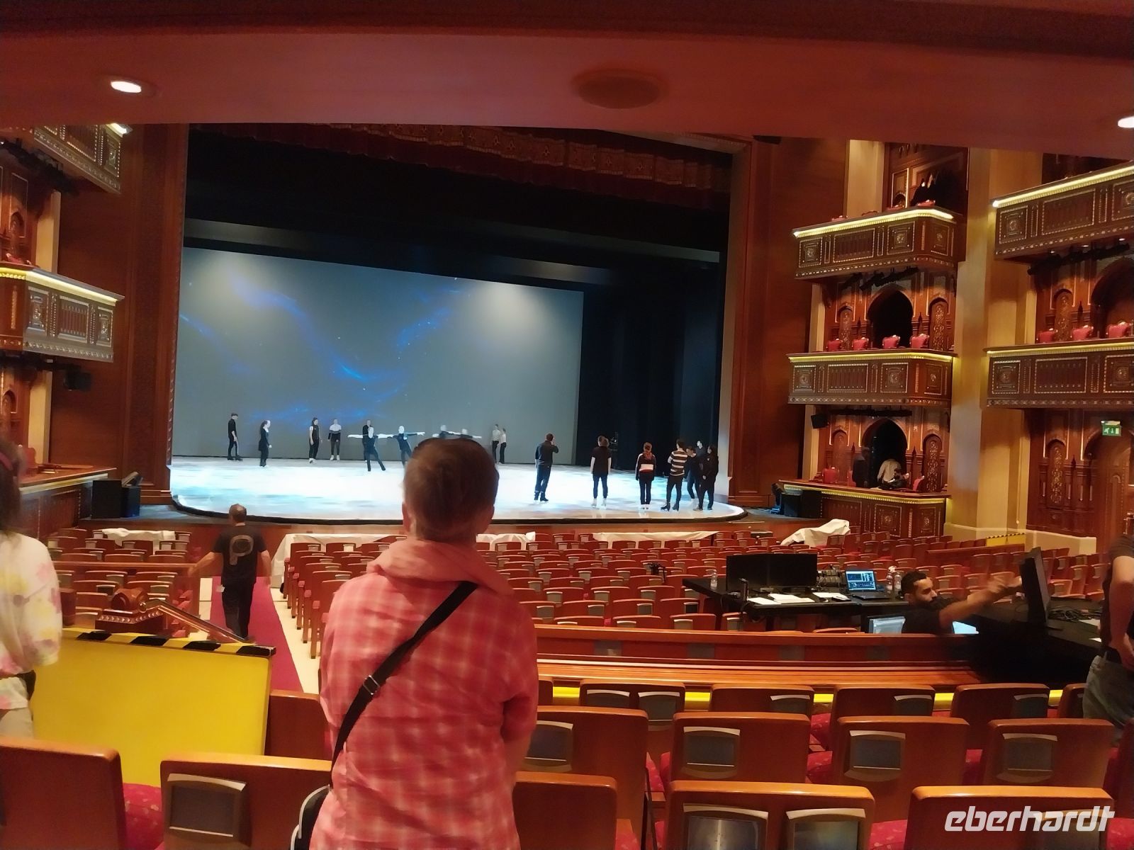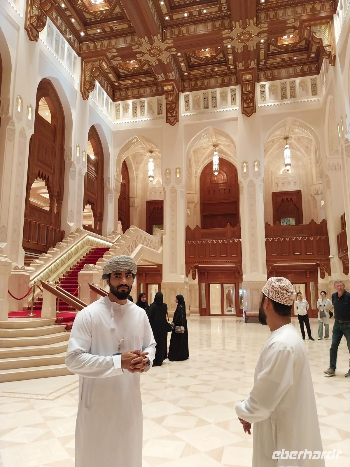 Als Nächstes folgt eine kleine Überraschung: wir besuchen das ROHM, also das Royal Opera House Muscat. Das imposante Opernhaus im Stile einer omanischen Festung zählt zu den größten weltweit und war das erste Opernhaus in der Golfregion. Es ist ein Opernpalast aus edlen Materialien wie Carrara-Marmor und Teakholz. Die Oper ist Prestigeobjekt des 2020 verstorbenen Sultans Qaboos und Ausdruck seiner Liebe für klassische Musik. Leider besuchte er nur ein einziges Mal das Opernhaus. Wir können uns im Rahmen einer Führung ein Bild von der Oper machen. Trotz Proben für die Vorstellung „Symphony on Ice“ dürfen wir auch einen Blick in das Auditorium werfen.