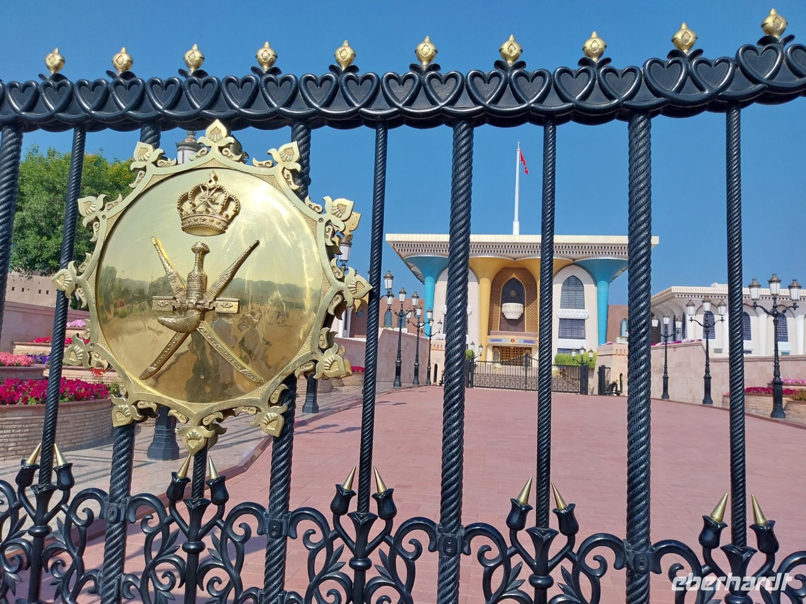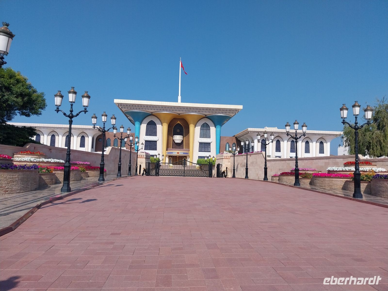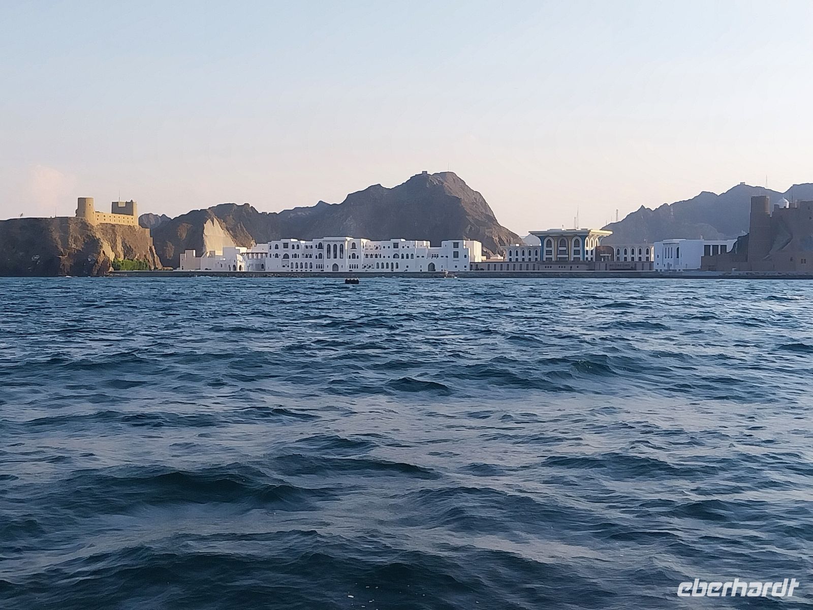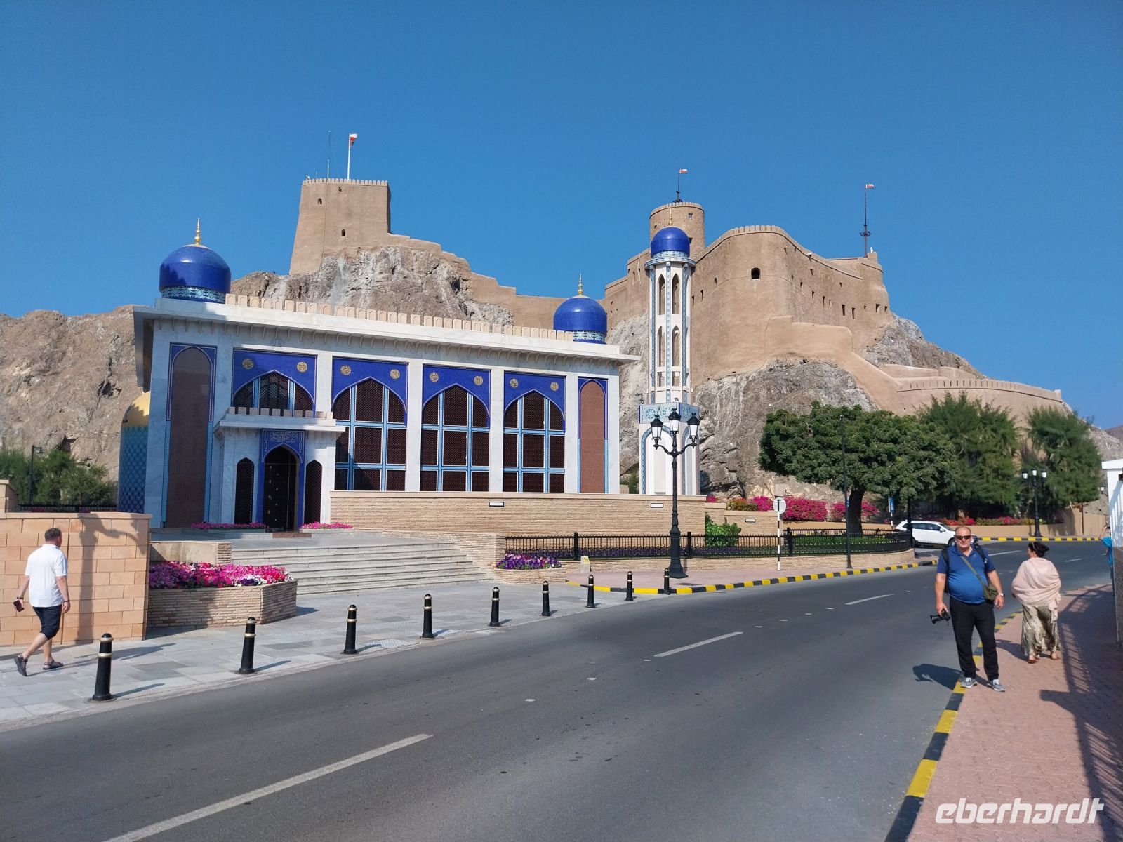 In der nächsten Bucht befindet sich „Old Muscat“, also das alte Muscat. Hier unternehmen wir einen Spaziergang zum Sultanspalast. Sultan Qaboos lies zu Beginn seiner Amtszeit in den 1970er Jahren den Alam-Palast bauen. Er wollte damit ein Zeichen für den Aufbruch des Oman in die Moderne setzen (alam = arab. für Zeichen). Zu Füßen der früheren portugiesischen Festungen Mirani und Jalali führt unser Spaziergang in der warmen Mittagssonne weiter durch Old Muscat mit dem früheren Gouverneurspalast Bait Garaiza und der kleinen blauen Moschee Masjid Al Khor bis zur Seeterrasse des Palastes.