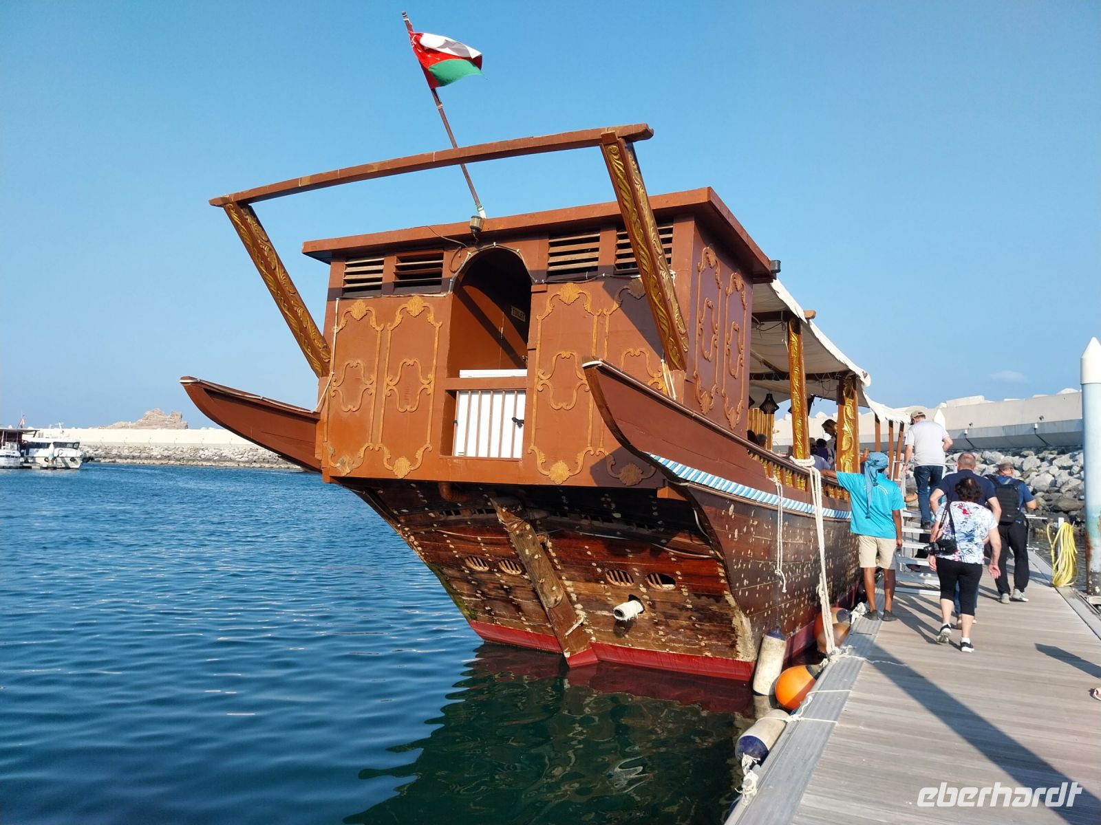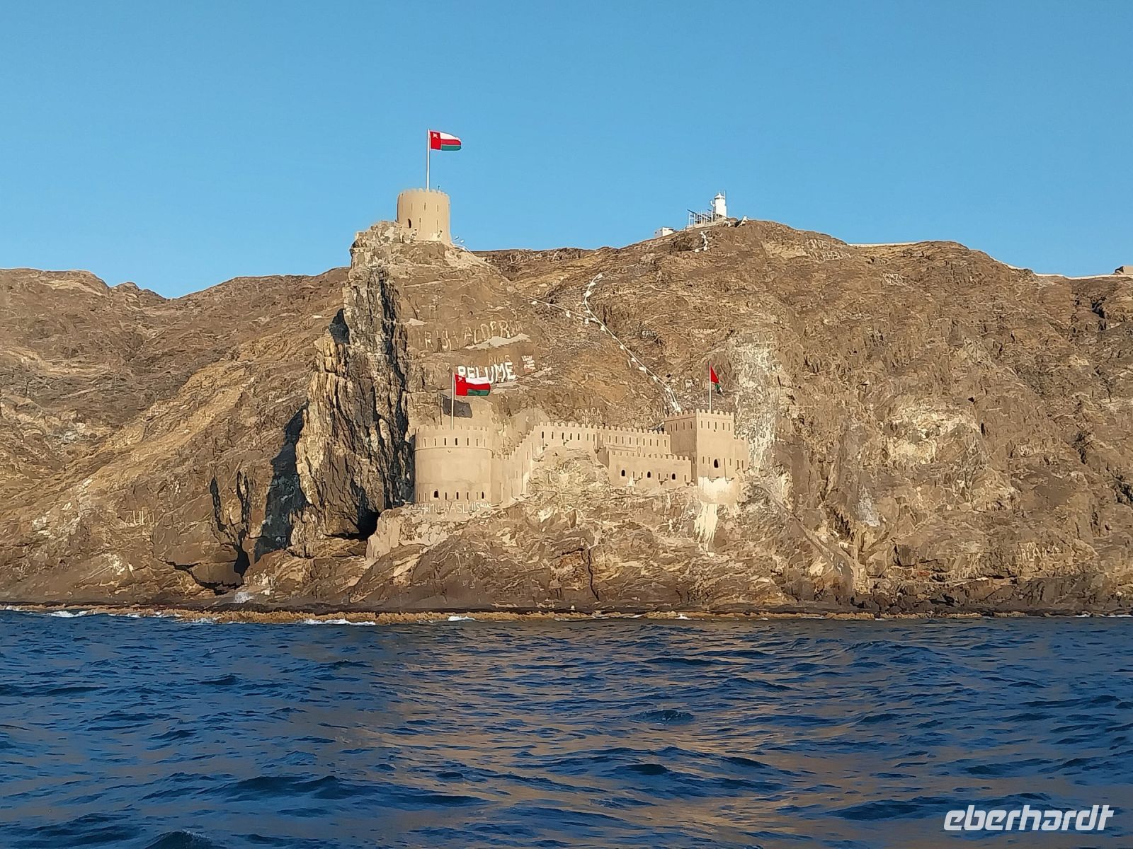 In den Nachmittstunden fahren wir ganz entspannt mit einer traditionellen Dhau entlang der Felsenküste von Muscat. Die in der Werft von Sur gebaute Dhau haben wir exklusiv für uns. Aus dieser Perspektive sehen wir noch einmal das Al Bustan Hotel und Old Muscat.