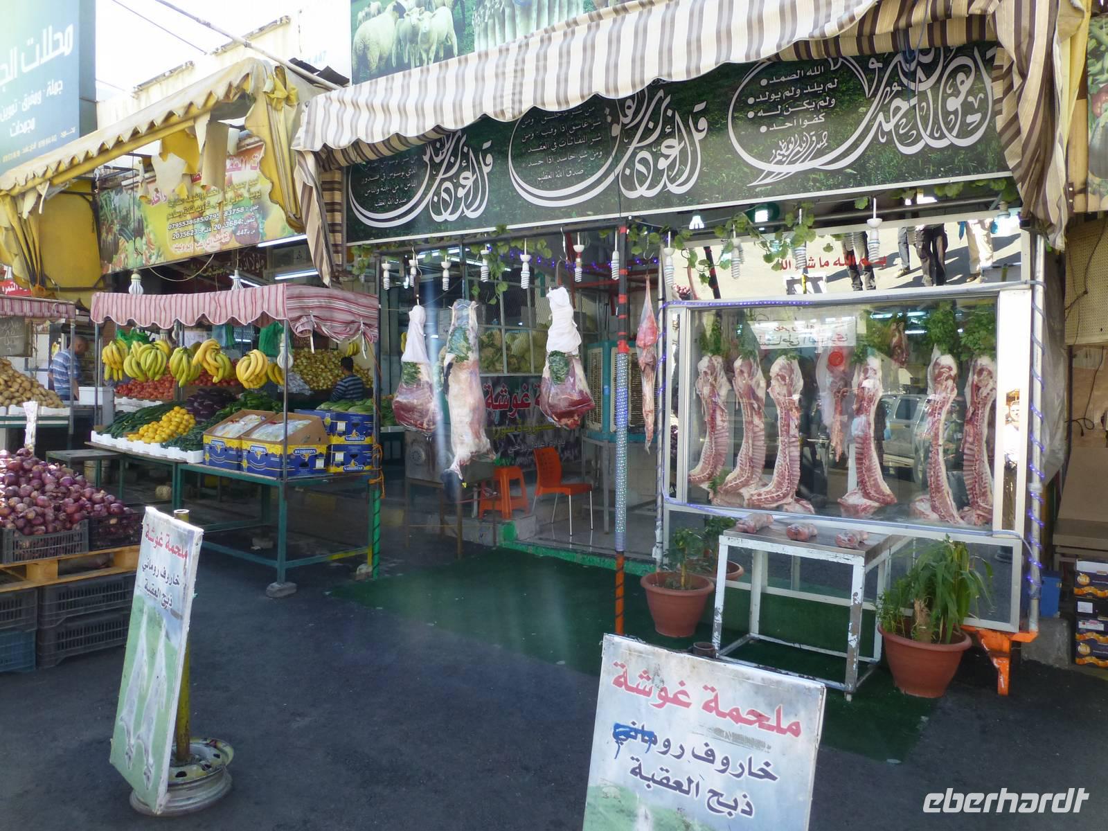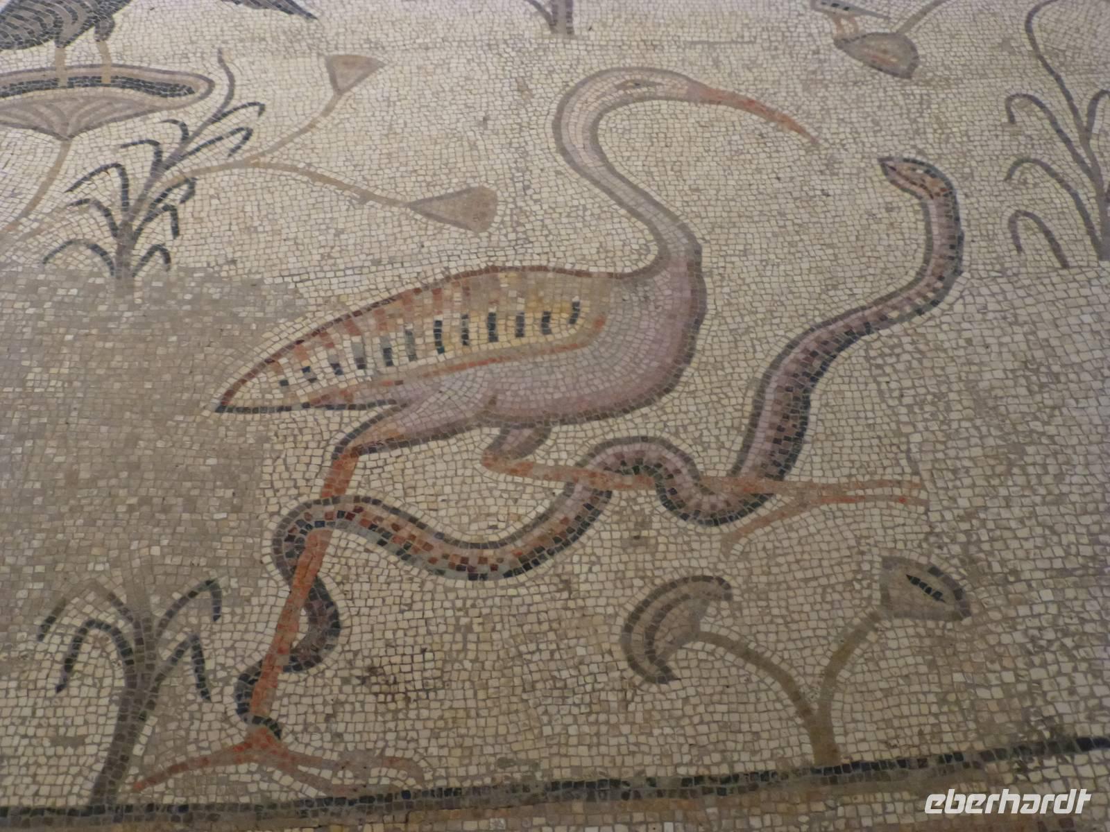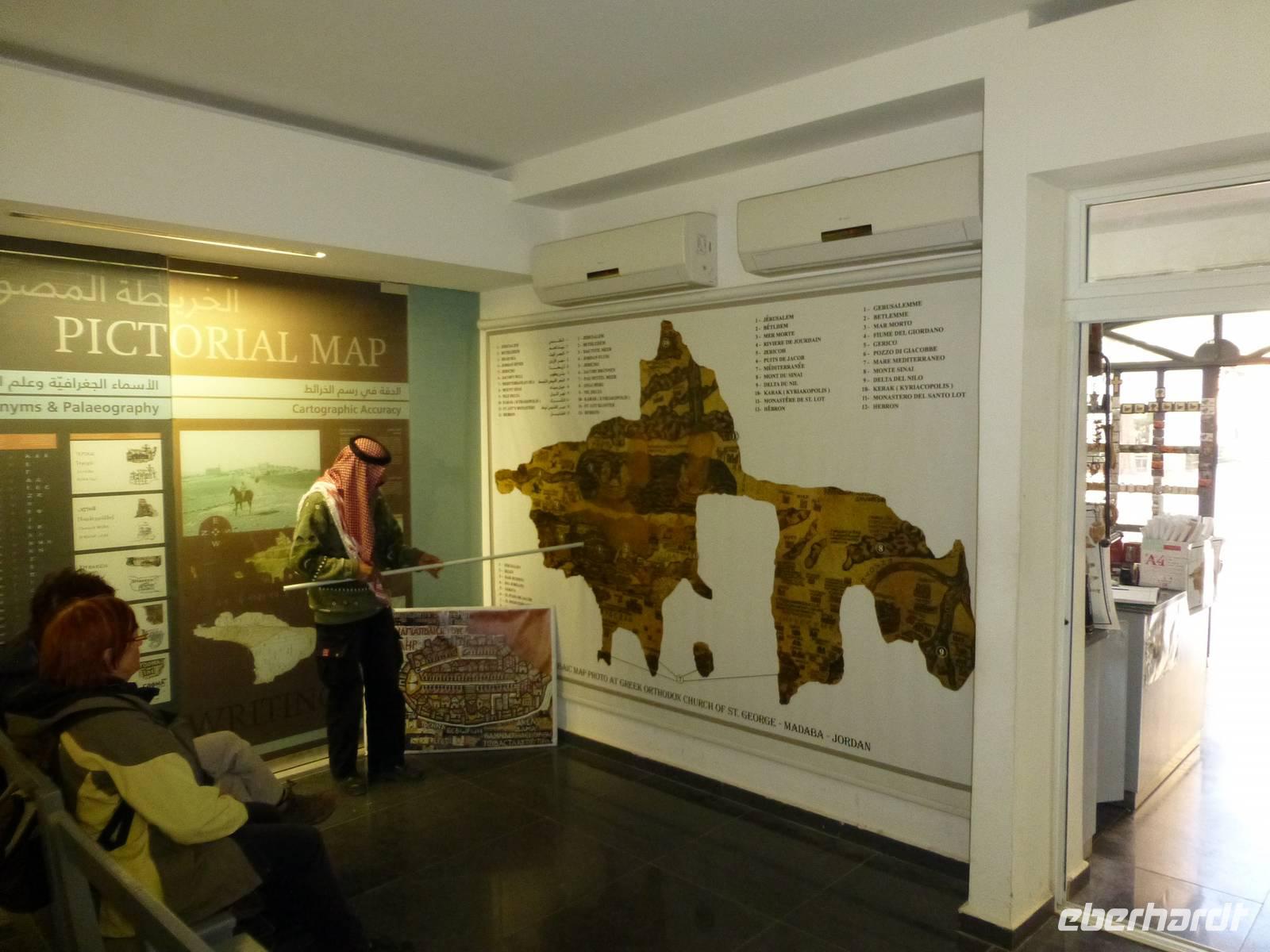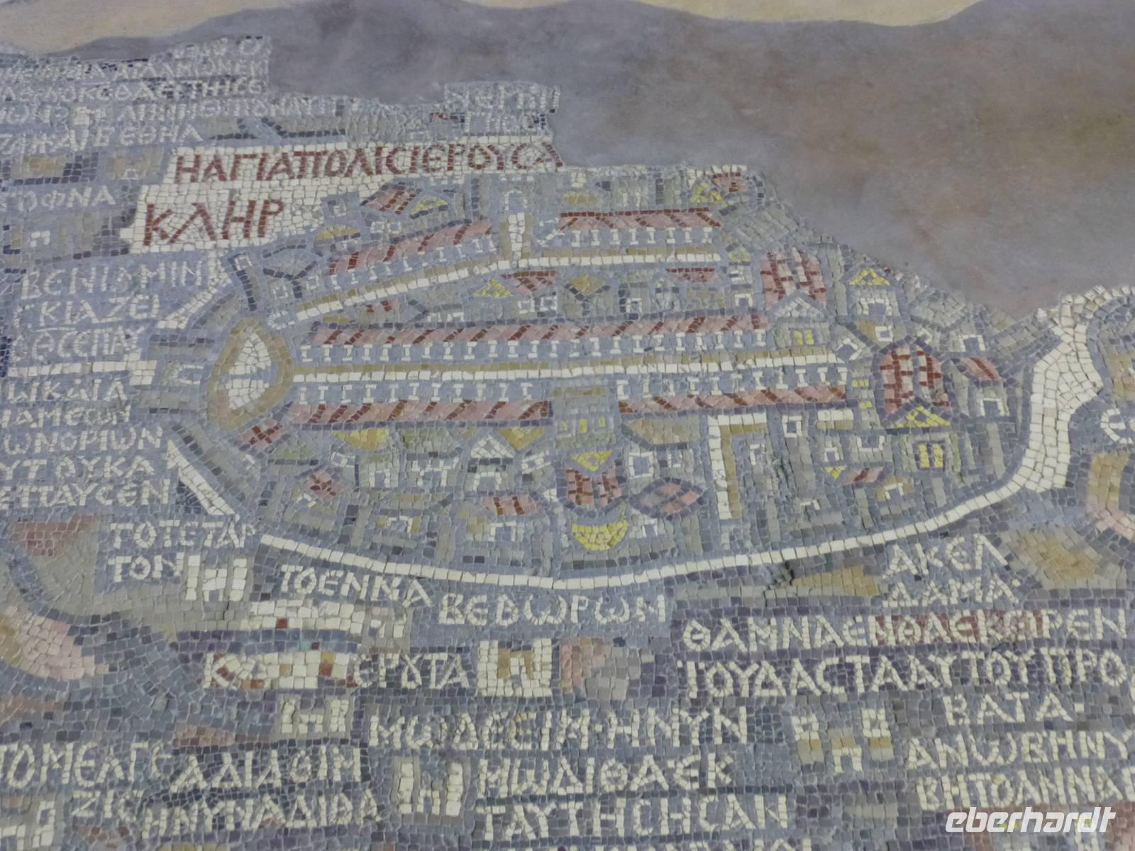 Wir reisen weiter Richtung Amman. Unser erster Halt unterwegs, abgesehen von einer Kaffeepause, ist die Stadt Al-Karak, Über der Altstadt von Al-Karak befindet sich die teilweise restaurierte Burg der Kreuzritter aus dem 12. Jh. Errichtet wurde sie um den Handels- und Pilgerverkehr zwischen Damaskus und Mekka zu kontrollieren. Die Überfälle des Burgherrn auf die Karawanen erregten den Zorn Saladins und er ließ die Burg mehrfach belagern. Schließlich fiel die Burg im Jahre 1188 nach 8-monatiger Belagerung. Von einem Café aus können wir das Treiben auf der Straße beobachten. Die Schule war gerade aus und alle Kinder strömten nach Hause. Zwei mutige Mädchen kommen zu uns und fragen in Englisch wie wir heißen. Durch die engen Gassen von Al-Karak, mit dem arabischen Alltagstreiben, verlassen wir die Stadt um weiter nach Madaba zu fahren. Auf dem Weg passieren wir die Stelle, an welcher sich die Herodes-Burg Macharäus befand. An dieser Stelle soll laut der Bibel Johannes der Täufer von Herodes Antipas, dem Sohn von Herodes dem Großen, geköpft worden sein. Sein Kopf wurde dann auf einem Tablett, auf Wunsch von Salome, der zweite Frau von Herodes Antipas, serviert. Die Geschichte ist natürlich noch etwas länger und jeder kann sie im Matthäus Evangelium 14,1-12 nachlesen. In der Nähe von Madaba befindet sich der Berg Nebo. Hier soll Moses das gelobte Land erblickt haben, betreten konnte er es nicht mehr, da er auf dem Berg starb. Sein Grab wurde bis heute nicht gefunden. Ich lese die den Berg betreffenden Stellen aus der Bibel vor, so erklärt sich eine hier aufgestellte Stele welche eine eherne Schlange darstellen soll. Die Stadt Madaba ist das Zentrum der Mosaikkunst in Jordanien. Das berühmteste Mosaik besichtigen wir in der Kirche St. Georg, einer dreischiffigen griechisch-orthodoxen Basilika. Das Mosaik stellt eine Landkarte von Palästina dar und stammt aus vermutlich aus der zweiten Hälfte des 6. Jh. Ursprünglich bestand das Mosaik aus 2,3 Mio. Steinen, ein Mosaikleger verarbeitet am Tag ca. 200 der Steinchen, da kann man in etwa erahnen was das für eine Arbeit ist. Auf der Karte ist auch das Nil-Delta dargestellt, allerdings in der falschen Fließrichtung, statt von Süd nach Nord ist der Flusslauf von Ost nach West abgebildet. Mahmoud erklärt uns zuerst die Karte an Hand einer Abbildung und anschließend können wir das Original bestaunen. Madaba liegt nicht weit entfernt von der jordanischen Hauptstadt Amman. Durch den dichten Feierabendverkehr brauchen wir eine Weile bis wir unser Hotel, das Regency Palace, erreichen. Zum Abendessen werden wir wieder mit einer hervorragenden Küche belohnt.
