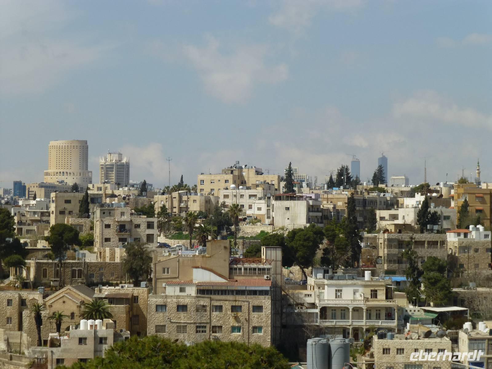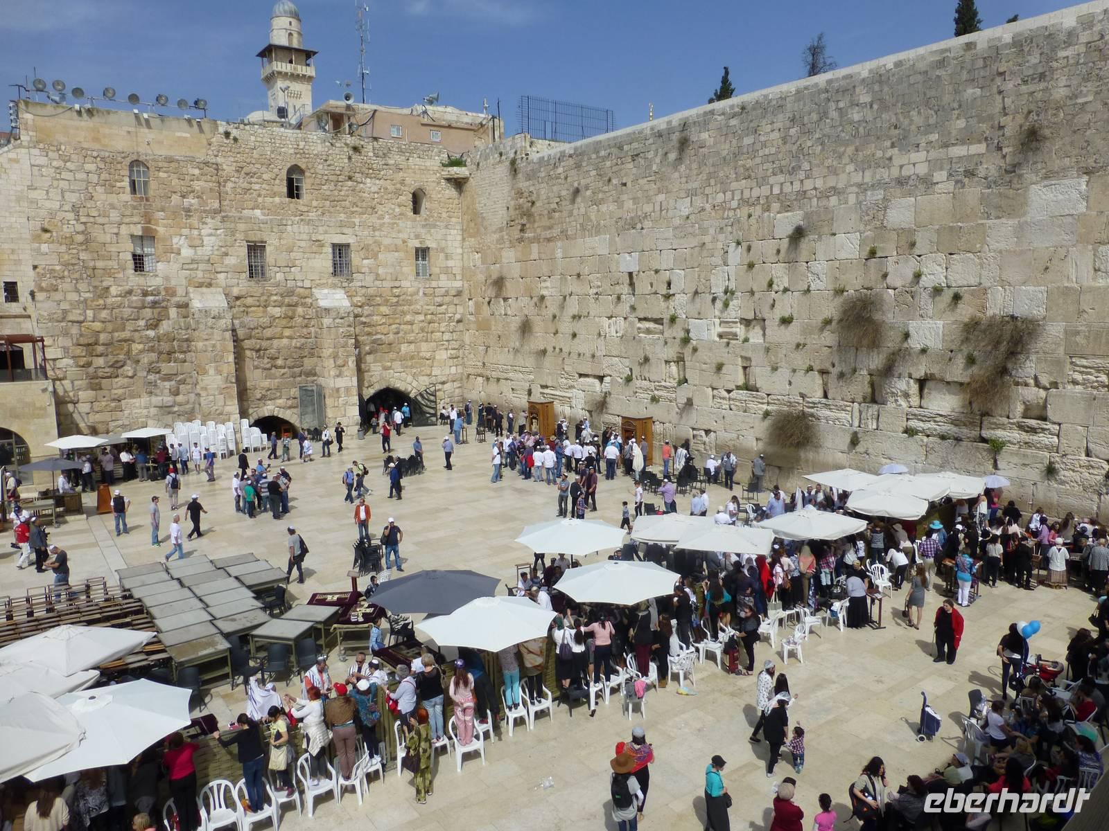 Nach dem Frühstück verlassen wir Nazareth, nicht ohne vom Berg... noch ein Foto von der Stadt zu machen. Unser Weg führt ins Jordantal, entlang der Straße sehen wir unzählige Gewächshäuser und Gemüsefelder. Ein Teil der Strecke legen wir auch im Palästinensischen Autonomiegebiet zurück und streifen dabei auch die Stadt Jericho. Von fast 400 m u.N.N. steigt die Straße dann hinauf nach Jerusalem, die Stadt liegt um die 800 m hoch. Gemeinsam mit Adi haben wir das Programm für heute etwas abgewandelt. Wir beginnen die Besichtigung mit der Klagemauer. Diese ist für alle Juden heute das wichtigste Heiligtum, denn Sie stellen den letzten Rest des 70 n.Chr. von den Römern zerstörten Tempels dar. Männer und Frauen beten an der Klagemauer getrennt. Sehr schön ist, dass wir einige Bar Mitzwa sehen können, das entspricht der Konfirmation in der christlichen Kirche. Dabei geht es sehr ausgelassen zu. Bei den Juden ist der Vater für die Erziehung der Kinder verantwortlich und wenn der Sohn in das Erwachsenenalter eintritt hat der Vater eine Aufgabe weniger zu erfüllen.