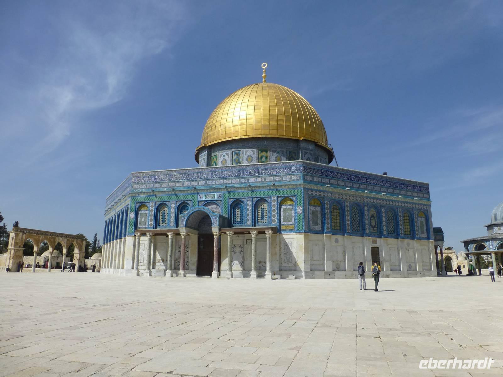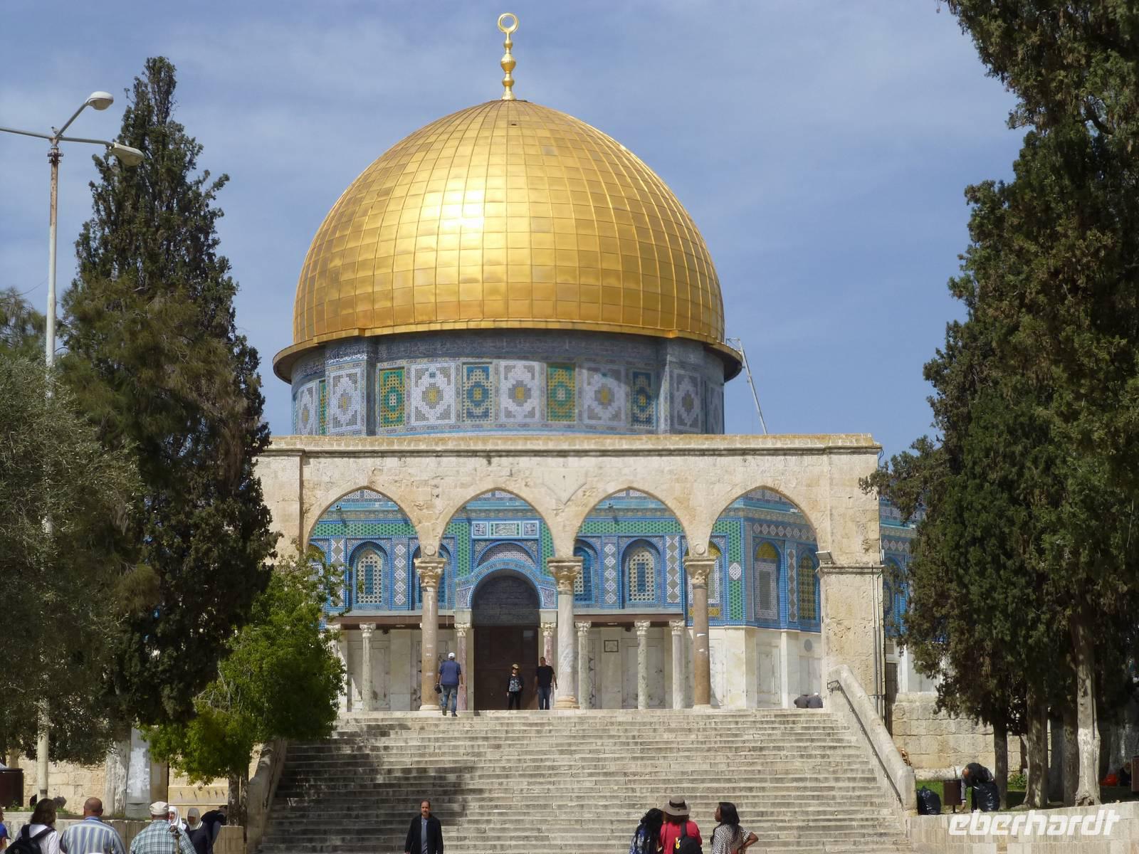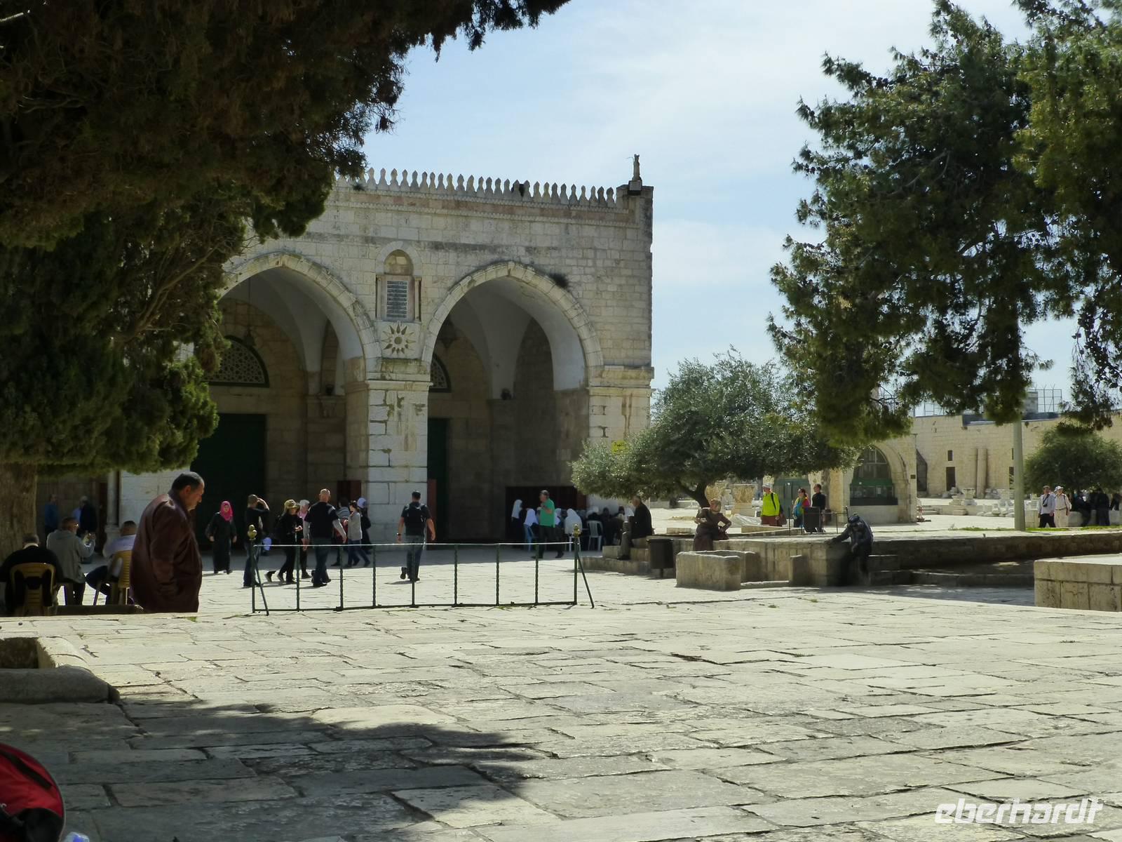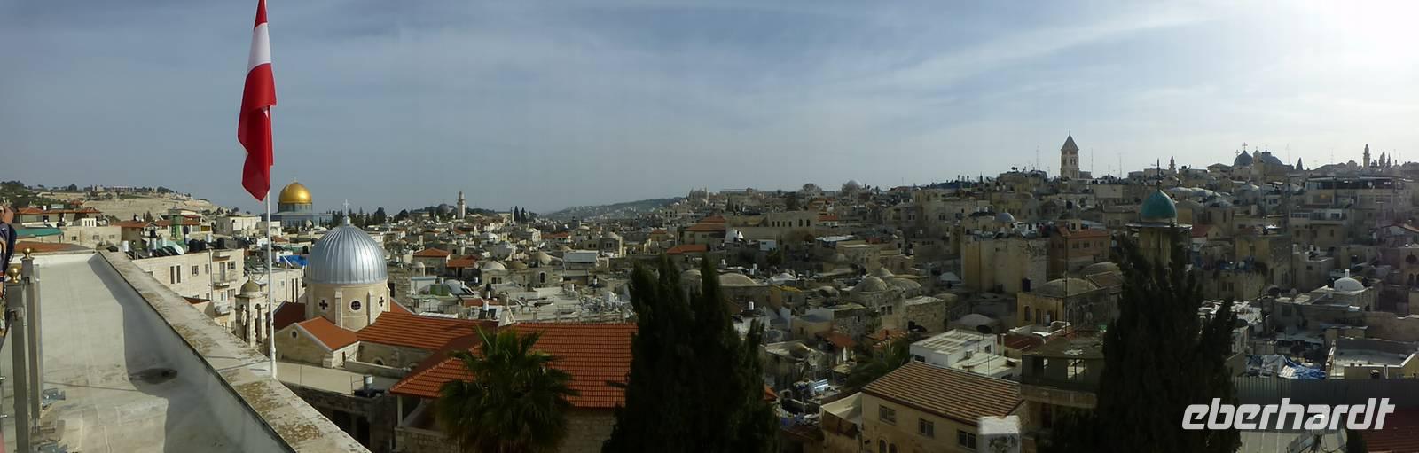 Anschließend besuchen wir den Tempelberg. Dieser zum arabischen Viertel Jerusalems zählend ist für Besucher zweimal am Tag für eine Stunde geöffnet. Wir müssen uns ein Weilchen anstellen, dann gibt es eine Sicherheitskontrolle und anschließend können wir fast eine Stunde auf dem Berg verweilen. Mit dem Felsendom befindet sich das prägnanteste Bauwerk Jerusalems dort oben. An dieser Stelle soll Mohamed seine Himmelfahrt angetreten haben. Neben dem Felsendom befindet sich auch noch die al-Aqsa Moschee auf dem Plateau. Den Leidensweg von Jesus bis zu seiner Kreuzigung verfolgen wir anschließend. Vom Löwentor aus laufen wir die Via Dolorosa entlang. An einigen Station des Kreuzweges machen wir halt und Adi erklärt ausführlich die Geschichte. So an der Stelle der Verurteilung Jesu, dort wo er das Kreuz aufnimmt und in der Geißelungskapelle. Zwischendurch machen wir einen Stopp auf dem Dach des Österreichischen Pilgerhospiz, von welchen man einen schönen Blick über Teile der Altstadt hat. Als wir auf der Dachterrasse ankommen beginnt der Ruf der Muezzine von den Minaretten der Moscheen im muslimischen Viertel Jerusalems. Letzte Station auf der Via Dolorosa ist die Grabeskirche. Sie stellt das Hauptheiligtum der Christen dar und umfasst den Golgatafelsen als Stelle der Kreuzigung und das leere Grab des Auferstandenen. Wir besichtigen die Kirche und können, da wenig Menschen anwesend sind, auch unproblematisch das Grab besuchen. Nach so viel Geschichte gehen wir über den Basar ins jüdische Viertel, gönnen uns eine Pause und lauschen etwas den Vorbereitungen für ein Konzert am Abend. Das Ende unseres Rundgangs ist dann an der Zionskirche, in deren Nähe sich auch der Abendmahlssaal befindet.
