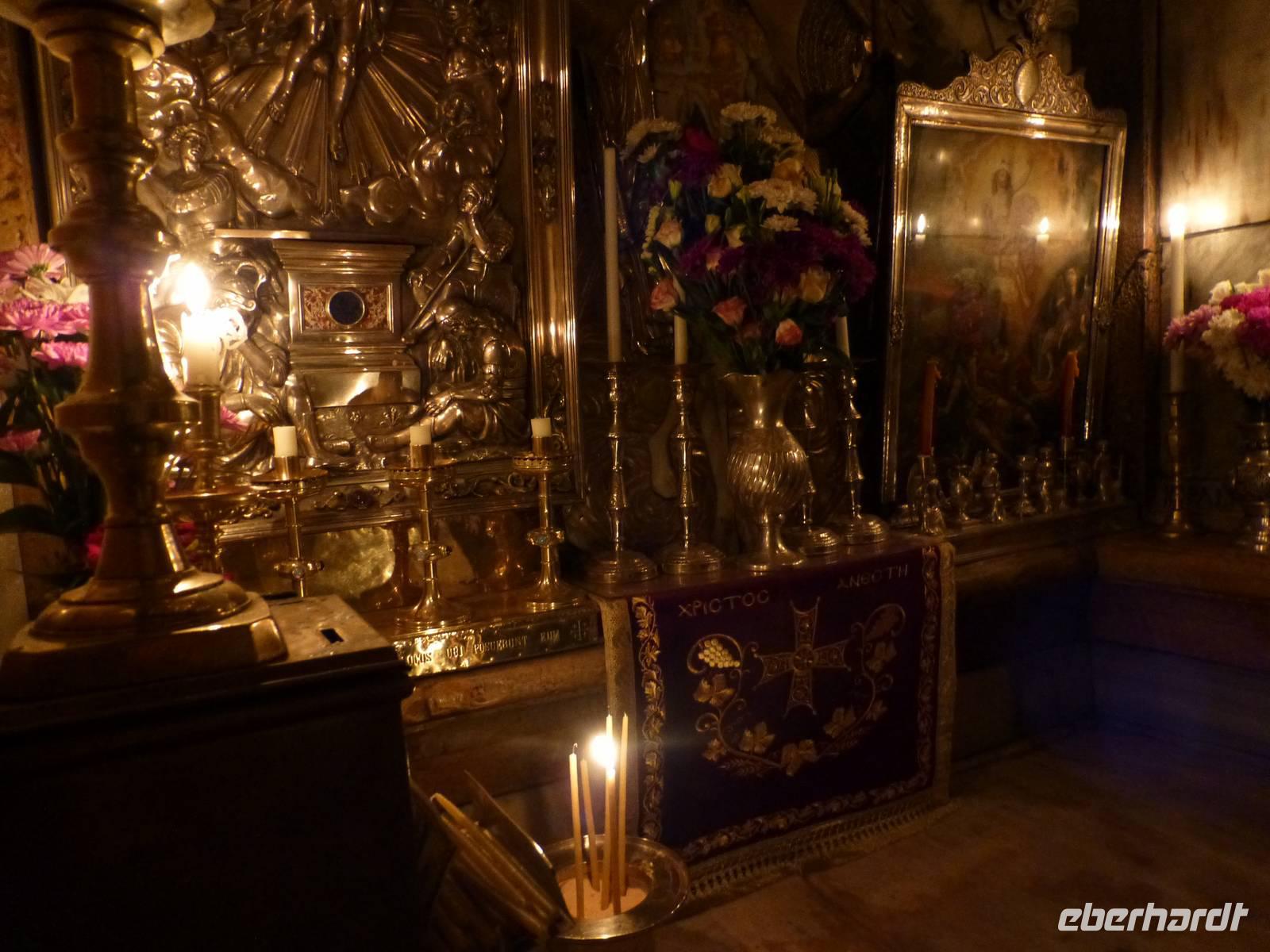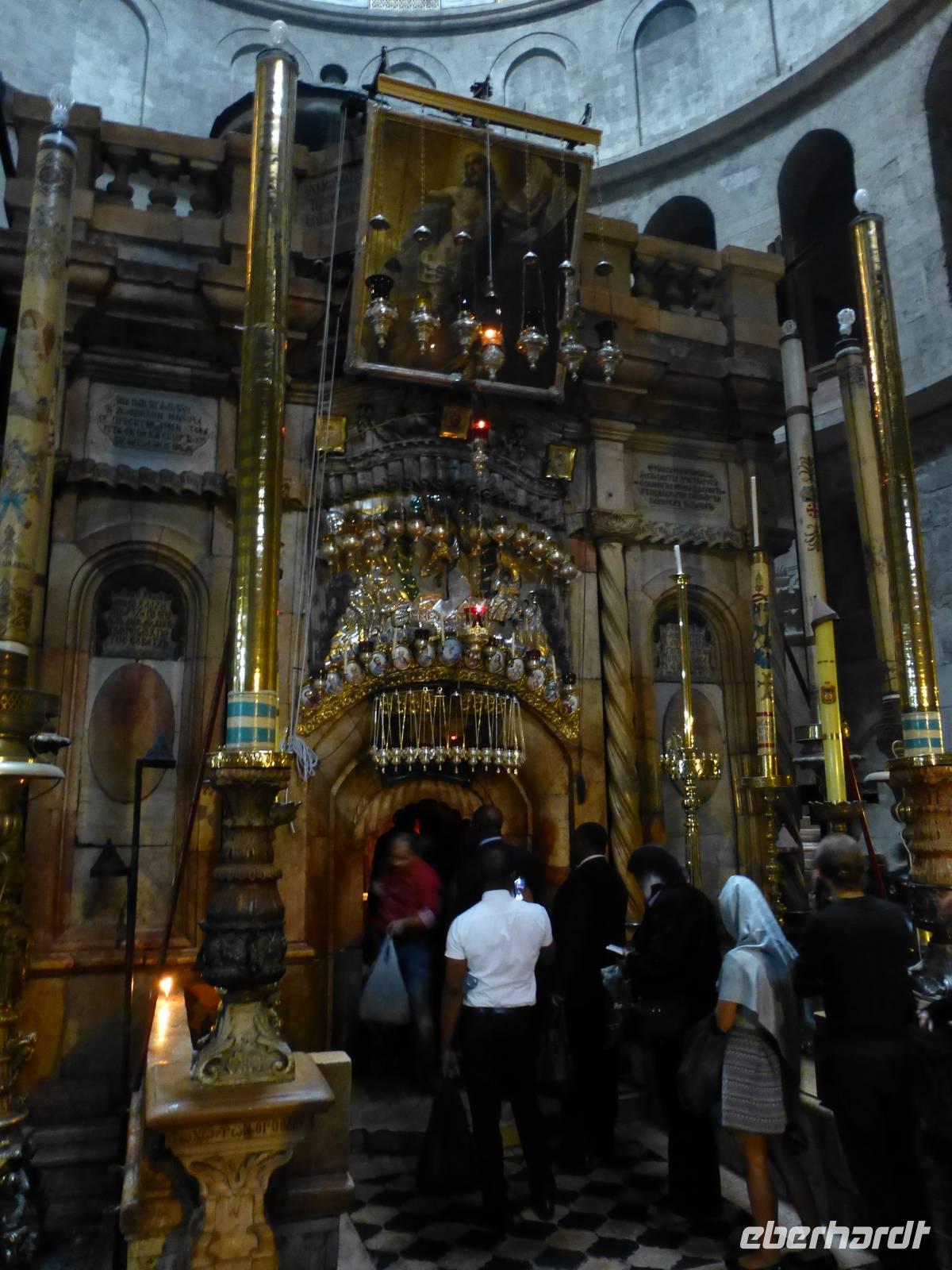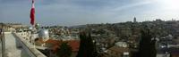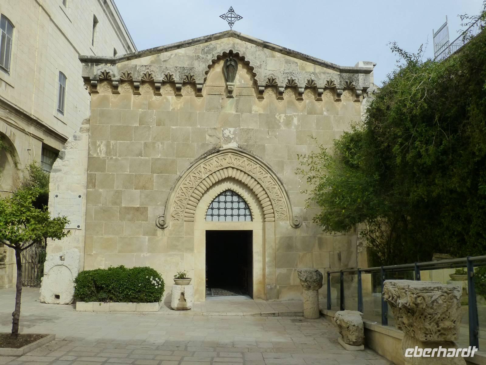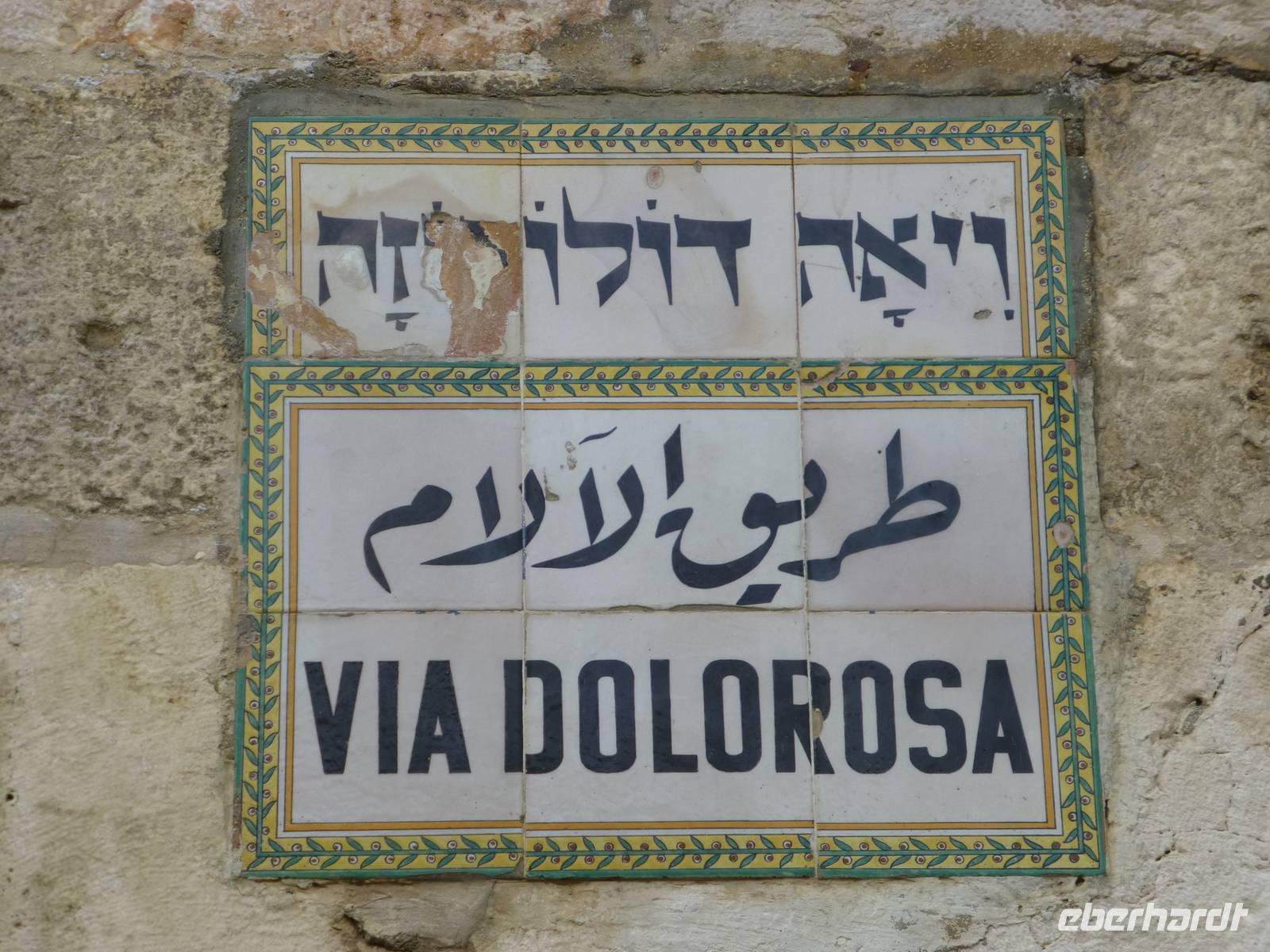 Anschließend besuchen wir den Tempelberg. Dieser zum arabischen Viertel Jerusalems zählend ist für Besucher zweimal am Tag für eine Stunde geöffnet. Wir müssen uns ein Weilchen anstellen, dann gibt es eine Sicherheitskontrolle und anschließend können wir fast eine Stunde auf dem Berg verweilen. Mit dem Felsendom befindet sich das prägnanteste Bauwerk Jerusalems dort oben. An dieser Stelle soll Mohamed seine Himmelfahrt angetreten haben. Neben dem Felsendom befindet sich auch noch die al-Aqsa Moschee auf dem Plateau. Den Leidensweg von Jesus bis zu seiner Kreuzigung verfolgen wir anschließend. Vom Löwentor aus laufen wir die Via Dolorosa entlang. An einigen Station des Kreuzweges machen wir halt und Adi erklärt ausführlich die Geschichte. So an der Stelle der Verurteilung Jesu, dort wo er das Kreuz aufnimmt und in der Geißelungskapelle. Zwischendurch machen wir einen Stopp auf dem Dach des Österreichischen Pilgerhospiz, von welchen man einen schönen Blick über Teile der Altstadt hat. Als wir auf der Dachterrasse ankommen beginnt der Ruf der Muezzine von den Minaretten der Moscheen im muslimischen Viertel Jerusalems. Letzte Station auf der Via Dolorosa ist die Grabeskirche. Sie stellt das Hauptheiligtum der Christen dar und umfasst den Golgatafelsen als Stelle der Kreuzigung und das leere Grab des Auferstandenen. Wir besichtigen die Kirche und können, da wenig Menschen anwesend sind, auch unproblematisch das Grab besuchen. Nach so viel Geschichte gehen wir über den Basar ins jüdische Viertel, gönnen uns eine Pause und lauschen etwas den Vorbereitungen für ein Konzert am Abend. Das Ende unseres Rundgangs ist dann an der Zionskirche, in deren Nähe sich auch der Abendmahlssaal befindet.