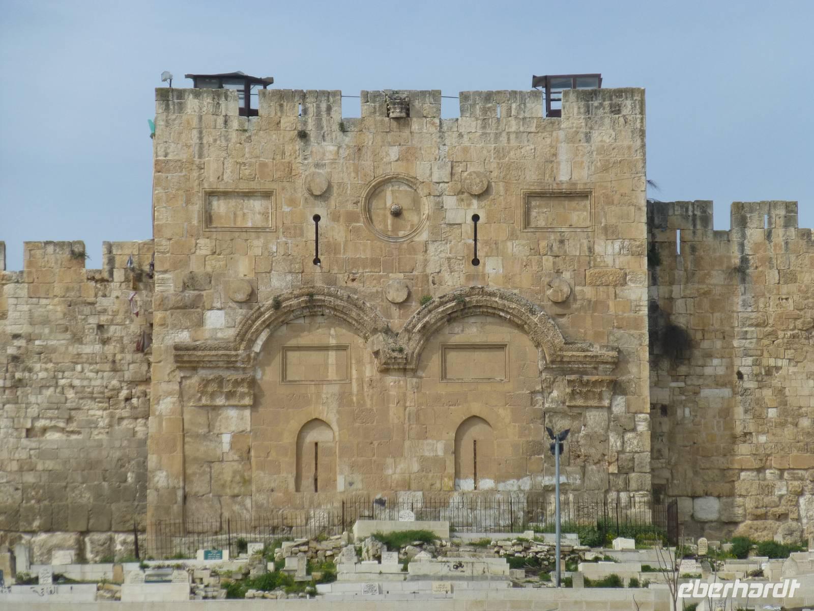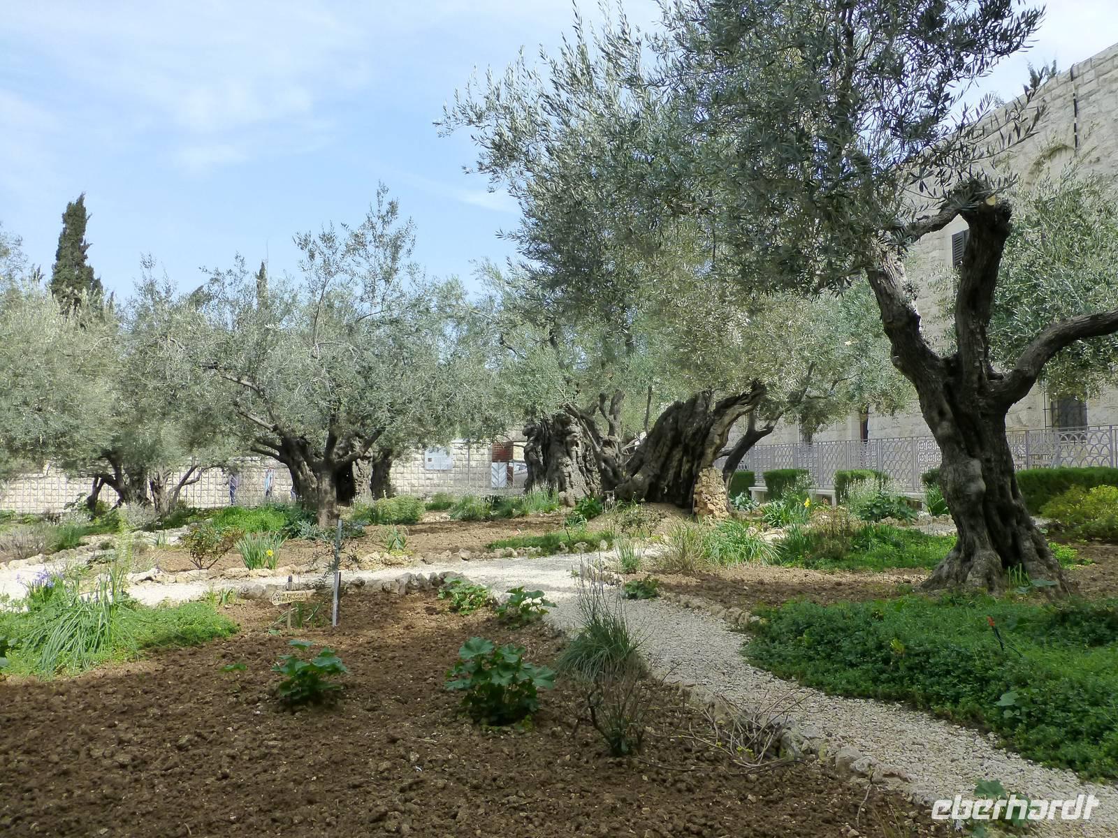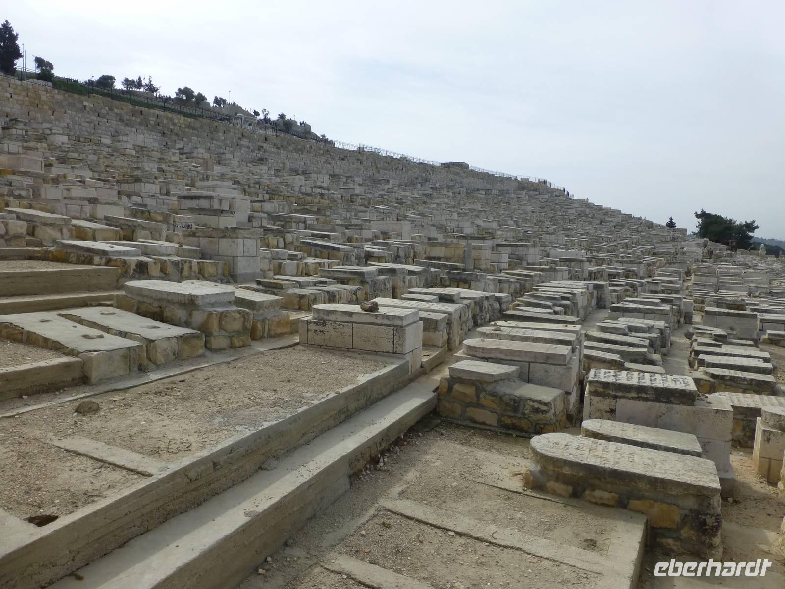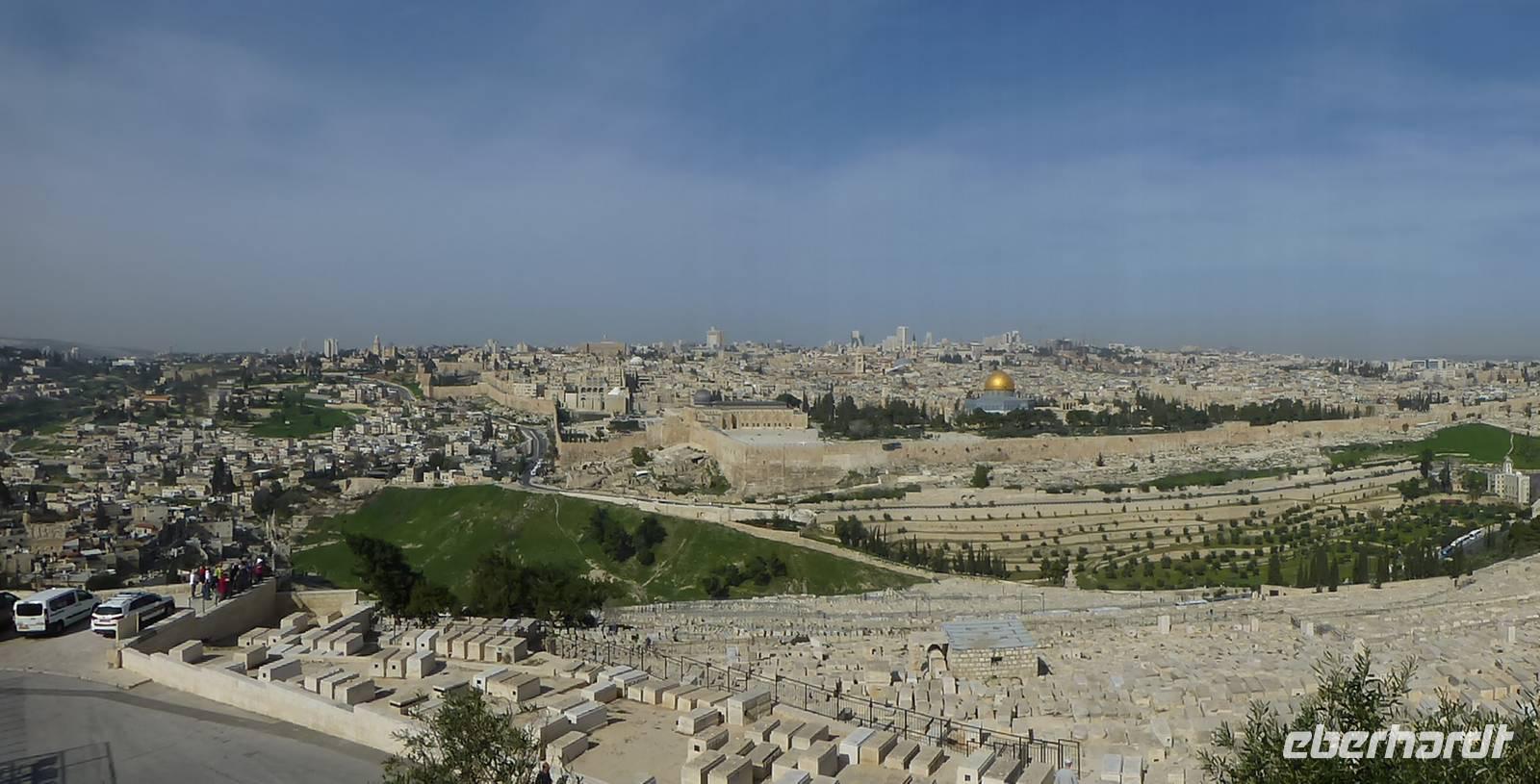 Zuerst fahren wir heute auf den Ölberg. Von hier hat man einen hervorragenden Blick auf die Altstadt von Jerusalem und vor allem auf den Tempelberg mit dem Felsendom. Dieser glänzt mit seiner goldenen Kuppel in der morgendlichen Sonne. Am Hang des Ölbergs, welcher sich zum Kidron Tal hinzieht, befindet sich ein großer jüdischer Friedhof. Die Gräber sind alle zum Tempelberg ausgerichtet. Der Glaube sagt, dass nach dem Eintreffen des Erlösers die Auferstehung stattfindet, sich die Gräber öffnen und die Auferstandenen durch das, heute zugemauerte, Goldene Tor den Tempelberg betreten. Die Gräber am Ölberg sind sehr begehrt und vor allem auch sehr teuer. Der Name des Ölbergs kommt von den alten Olivenhainen, welche zum Teil auch noch heute vorhanden sind. Zu Fuß gehen wir den Weg hinab in das Kidron Tal, machen einen kurzen Halt an der Pater-Noster Kirche. Hier soll der Ort sein, an welchem Jesus seinen Jüngern das Vaterunser lehrte. Im Tal angekommen besuchen wir den Garten Getsemani mit der sich anschließenden Kirche der Nationen. Früher befand sich hier eine Ölpresse und im Garten sind auch einige sehr alte Olivenbäume zu sehen. Laut biblischer Überlieferung hielt sich Jesus sehr häufig im Garten mit seinen Jüngern auf und wurde hier am Tag vor seiner Kreuzigung verhaftet.