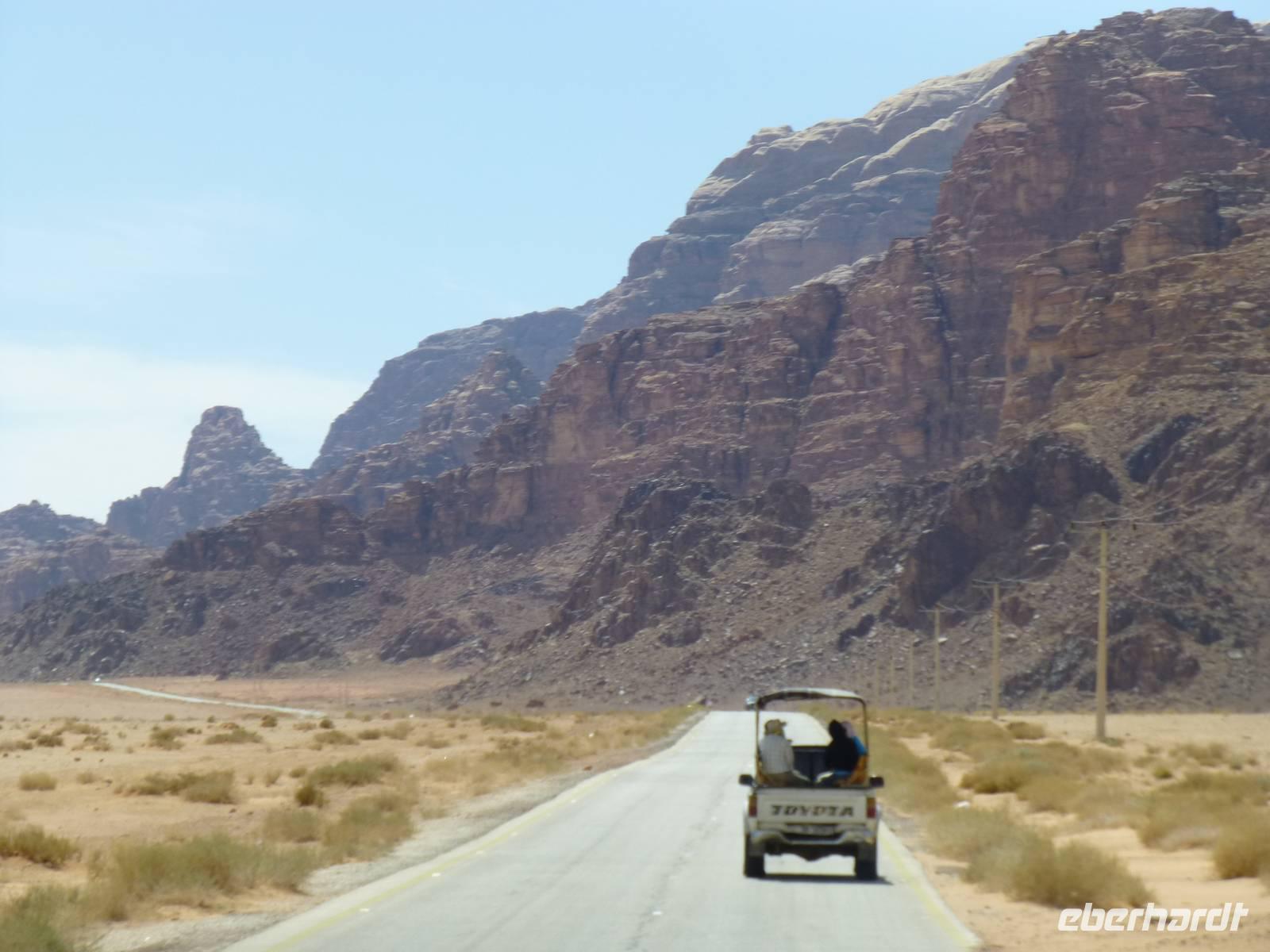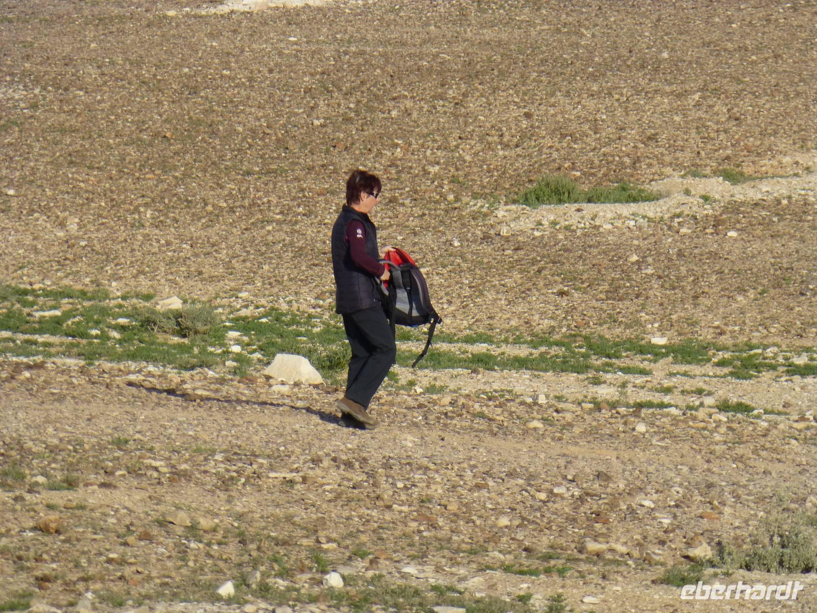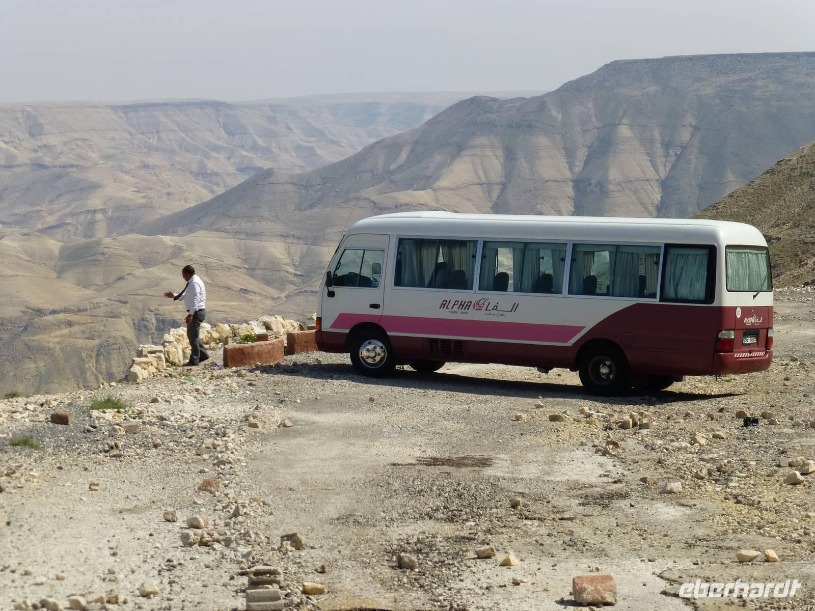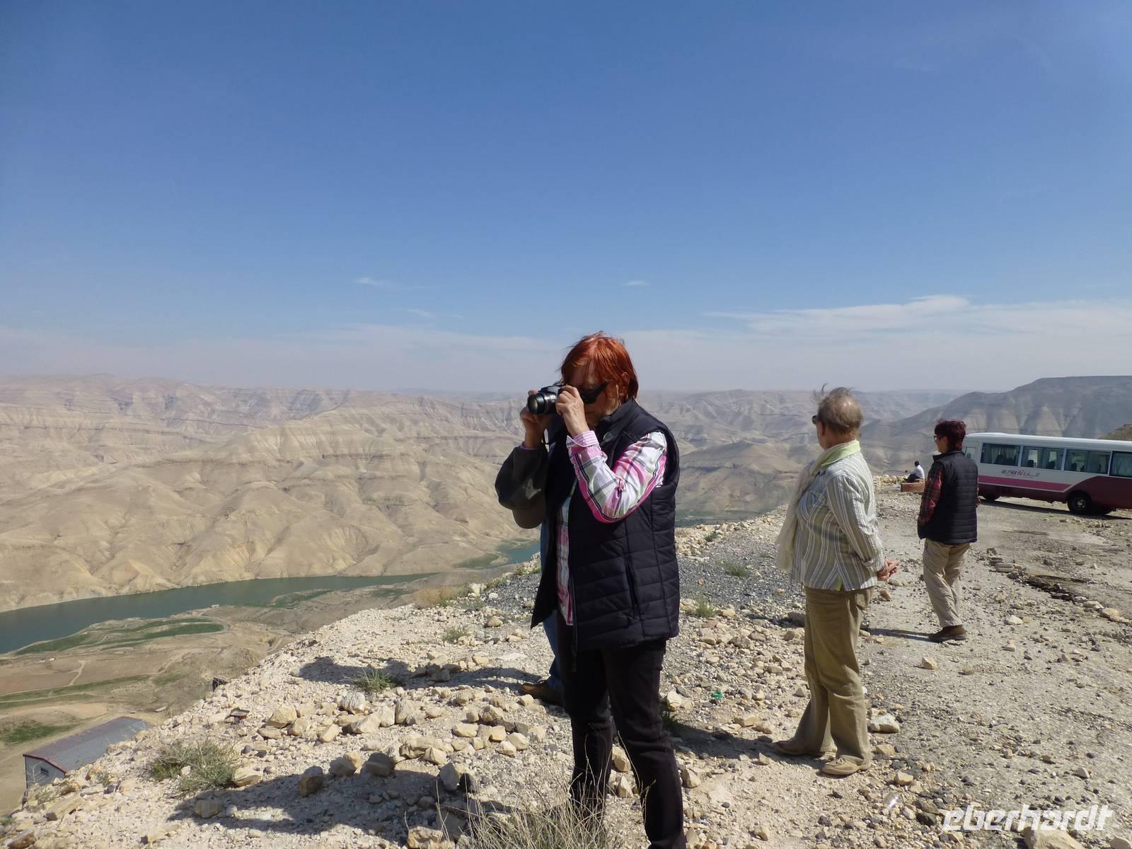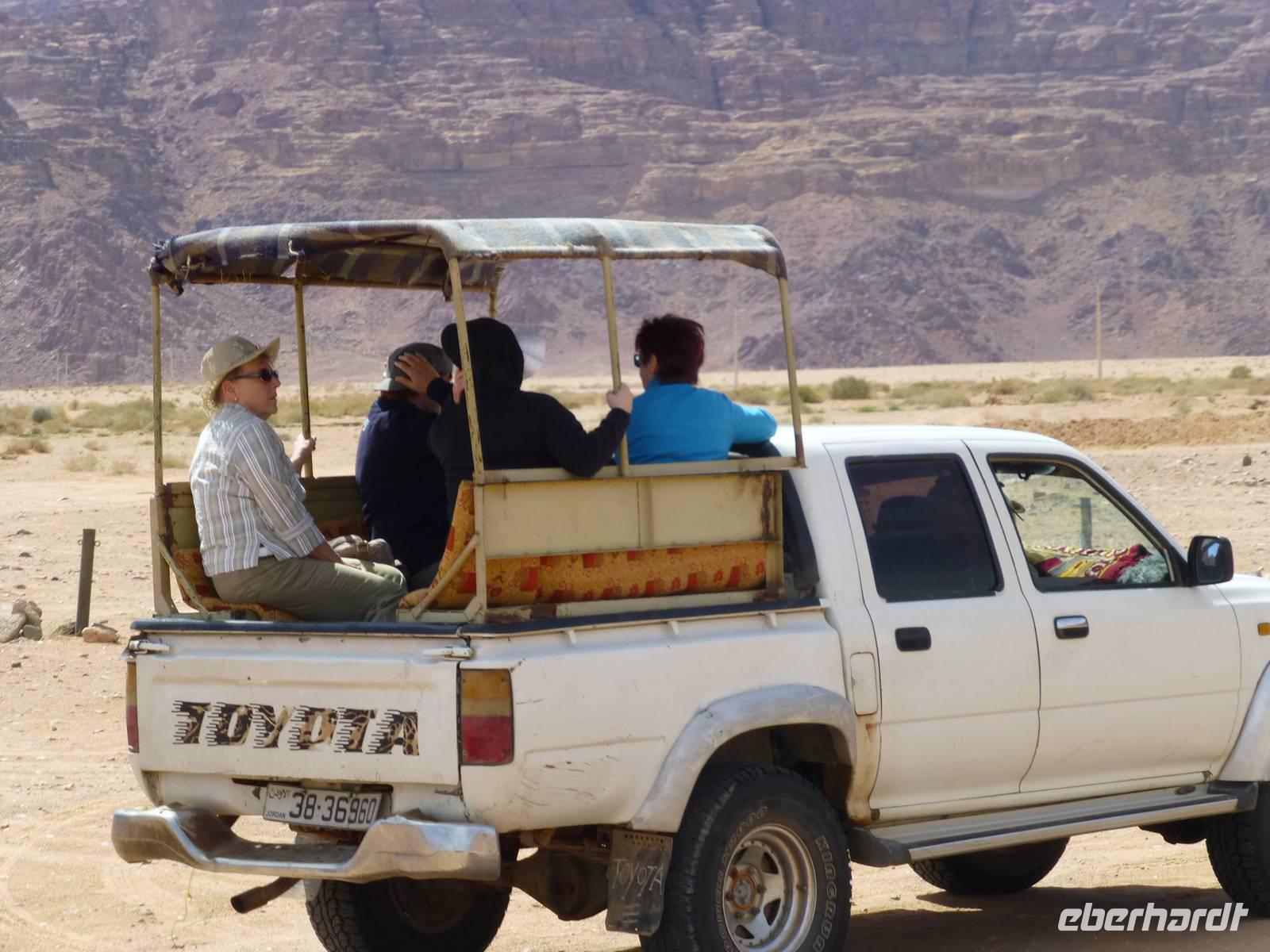 Am Morgen werden wir von Gabi im Hotel abgeholt. Sie betreut uns betreut uns bei Grenzübertritt nach Jordanien auf israelischer Seite. Die Formalitäten sind schnell erledigt. Durch einen Streifen Niemandsland ziehen wir unsere Koffer und in Jordanien werden wir schon mit einem Schild von Eberhardt TRAVEL erwartet. Auch unser jordanischer Reiseleiter Mahmoud wartet bereits. Auch hier geht die Erledigung der Formalitäten zügig und nach nicht mal einer Stunde ist der komplette Grenzübertritt erledigt.