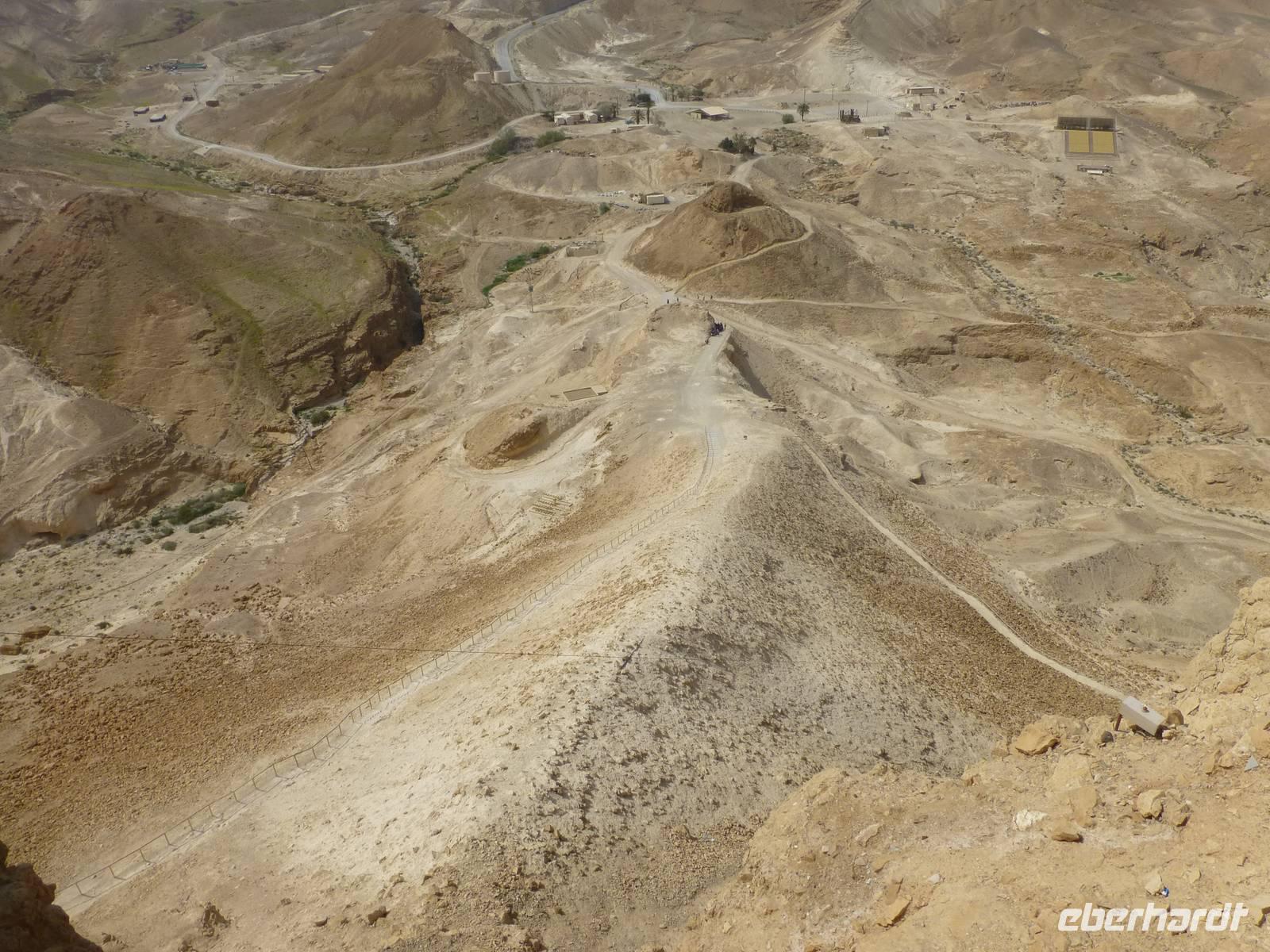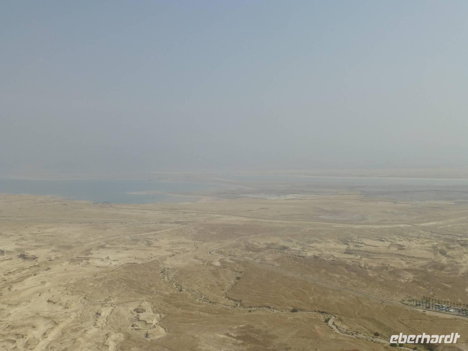 Entlang des Toten Meeres fahren wir weiter zur Festung von Masada. Der Begriff Totes Meer ist eigentlich falsch. Richtiger wäre Salzmeer. Das Wasser des Sees, welches auf Grund der hohen Verdunstung und des geringen Zuflusses pro Jahr 1 m abnimmt ist sehr Mineralhaltig und für viele Hautkrankheiten gesundheitsfördernd. Auf einen Liter Wasser kommen 39 g Salz, 212 g Chlor, 17 g Kalzium, 7,3 g Kalium und 5,1 g Brom.