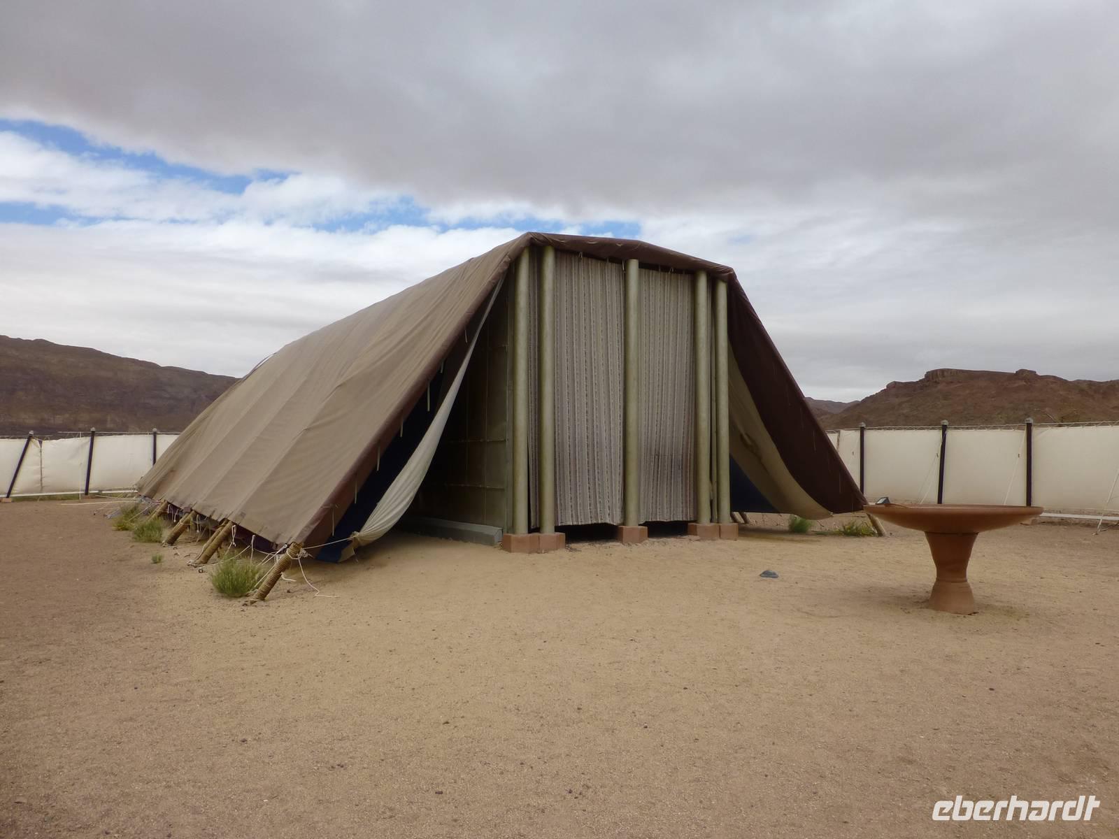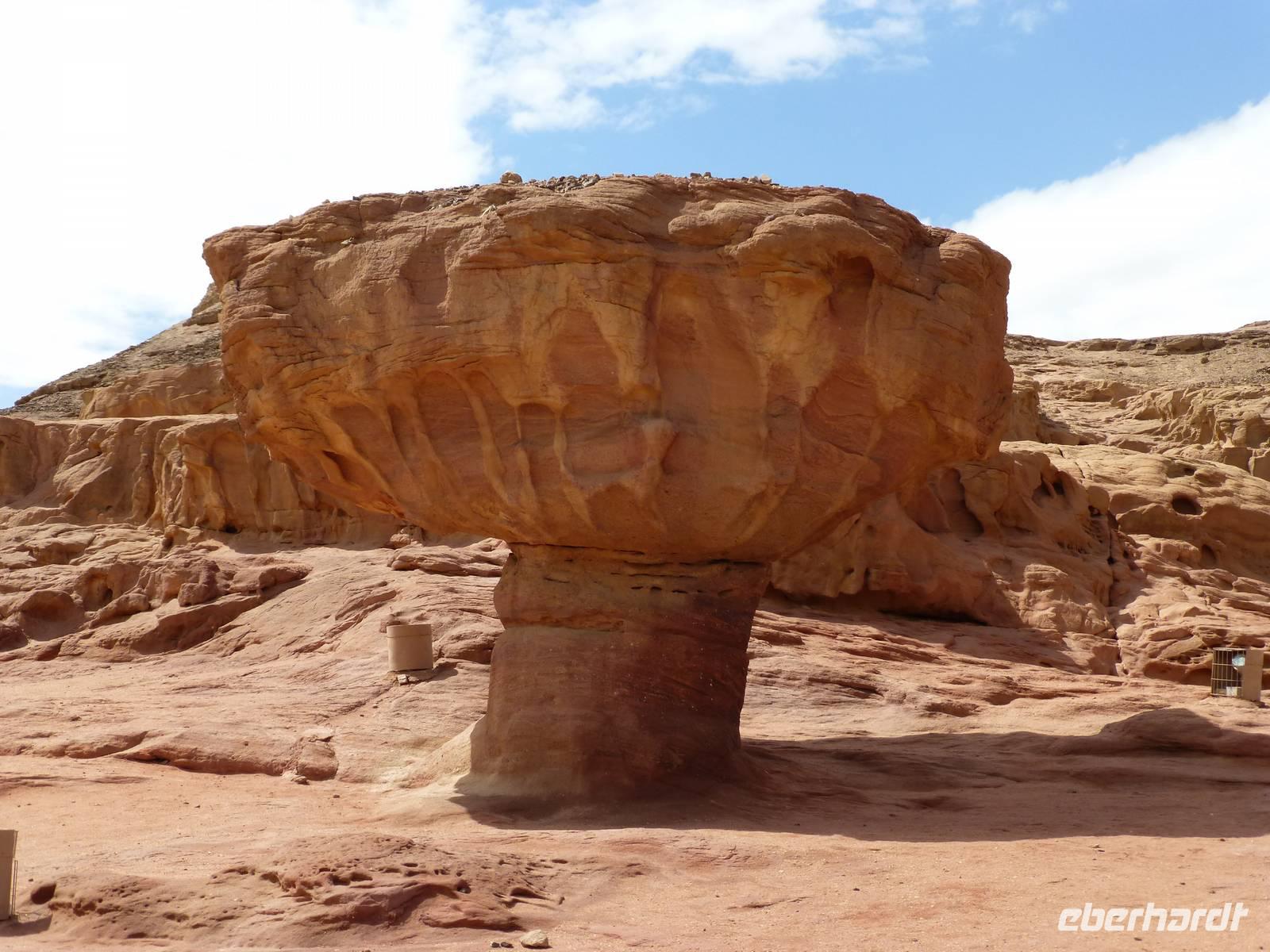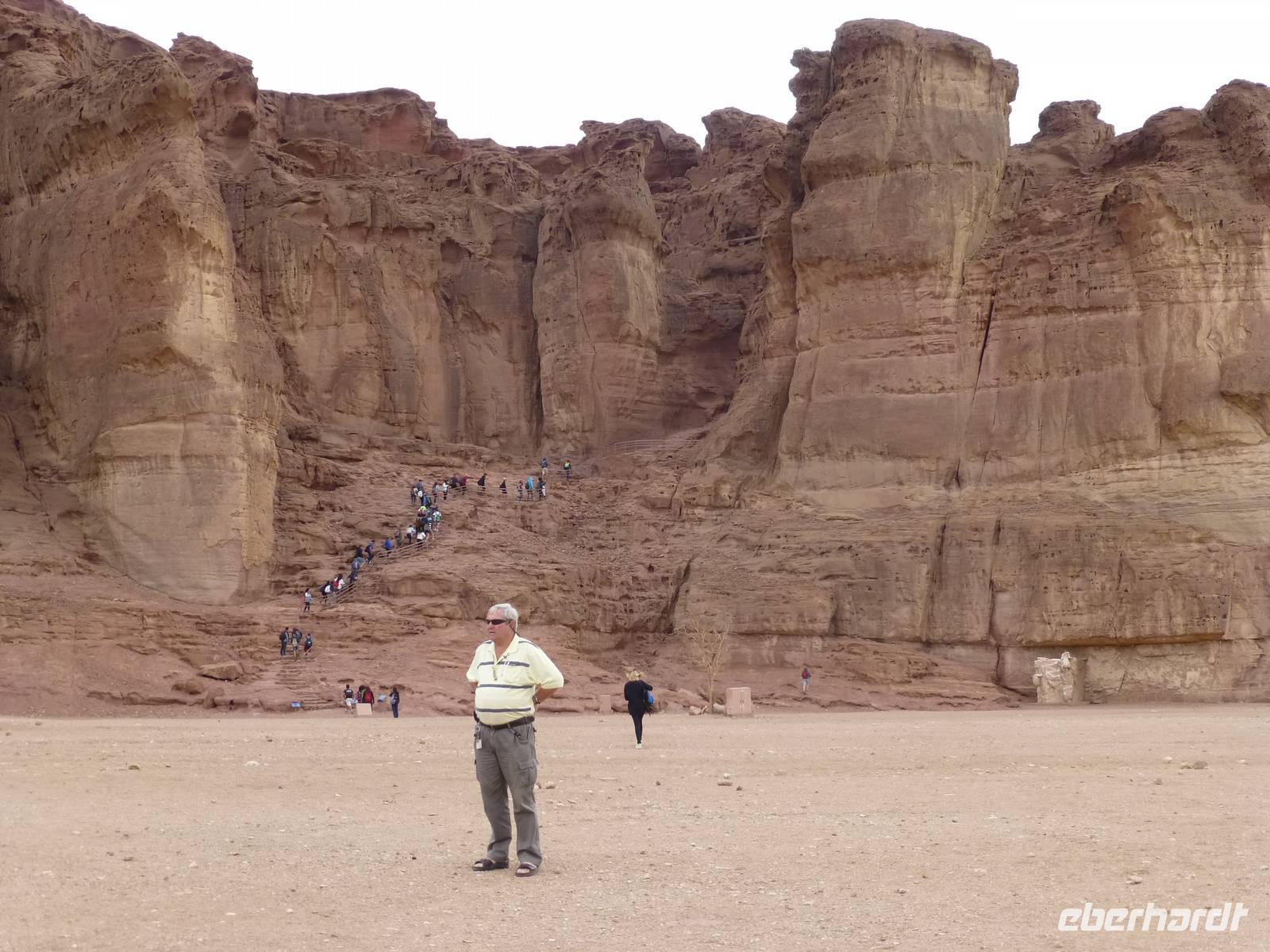 Am Vormittag besuchen wir den bei Eilat gelegenen Timna Park. Im Altertum befanden sich hier große Kupferlagerstätten welche durch die alten Ägypter abgebaut wurden. Auch der israelische Satt hat hier versucht Kupfer abzubauen, jedoch war die Ausbeute so gering, das die Minen wieder geschlossen wurden. Heute ist das Timna - Tal ein Gebiet von sagenhafter Schönheit. Durch Erosion entstanden über die Jahrtausende zahlreich Felsgebilde. So zum Beispiel die Säulen Salomons. Über eine Treppe erreicht man den Hathortempel. Die Göttin Hathor war die Schutzpatronin der Bergleute. Andere Formationen sind der Pilz und die Spirale. Ebenfalls im Park befindet sich die Nachbildung der Stiftshütte. Diese war ein Zeltheiligtum welches die wandernden Israeliten mit sich führten.