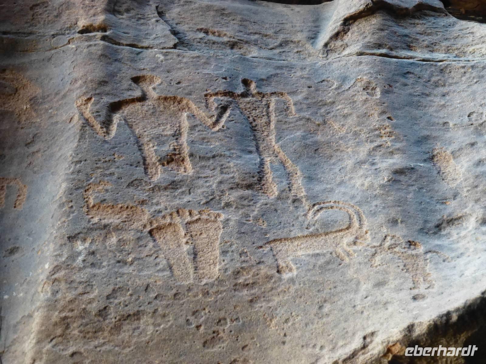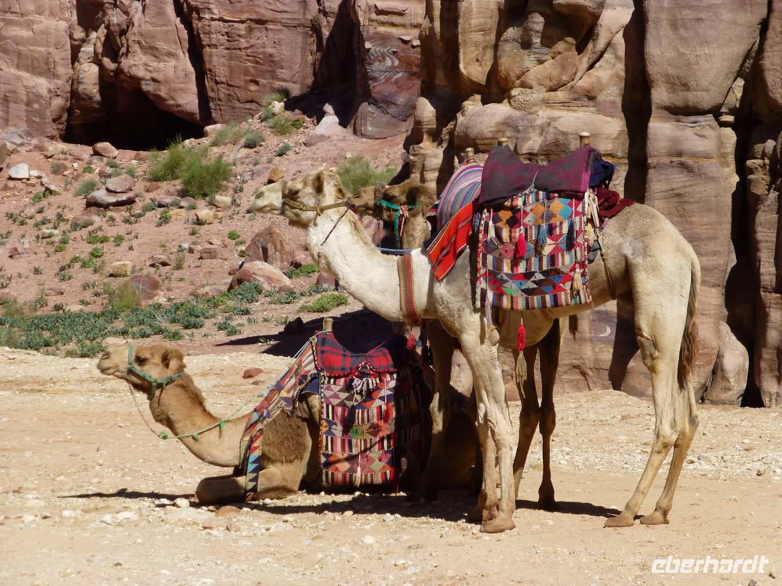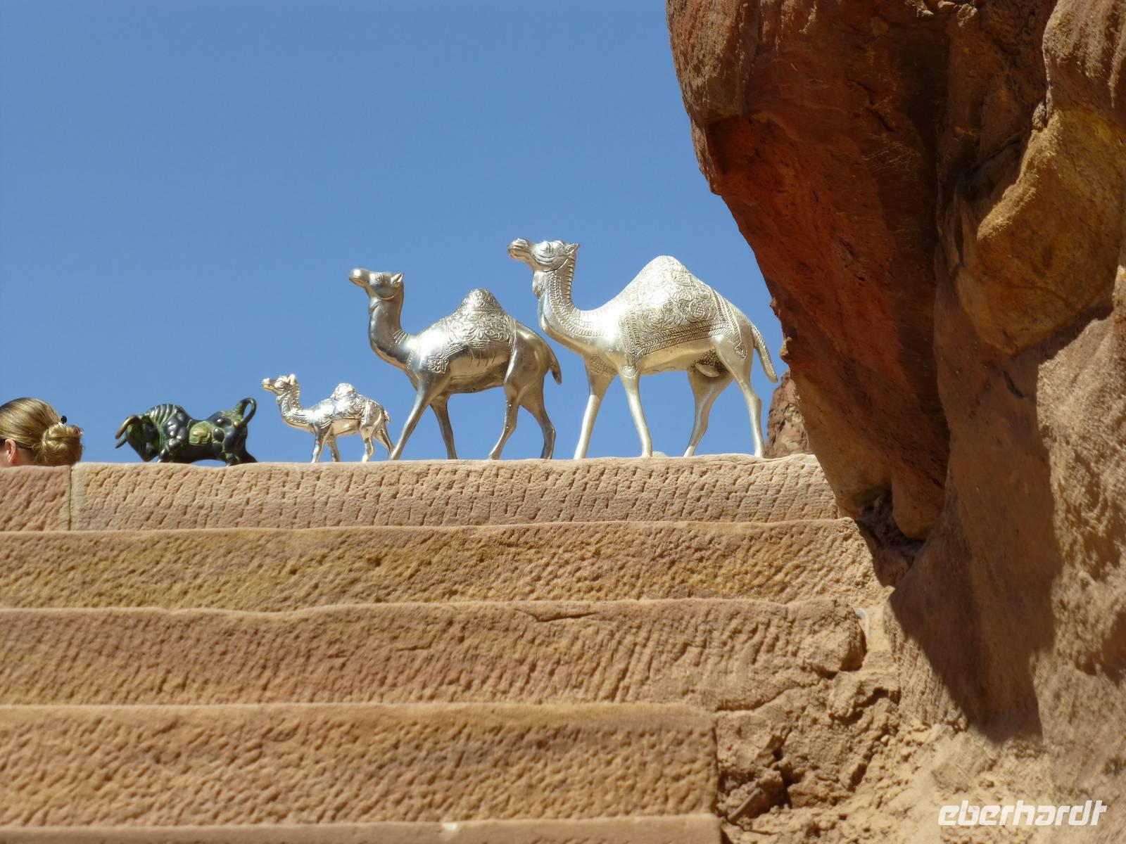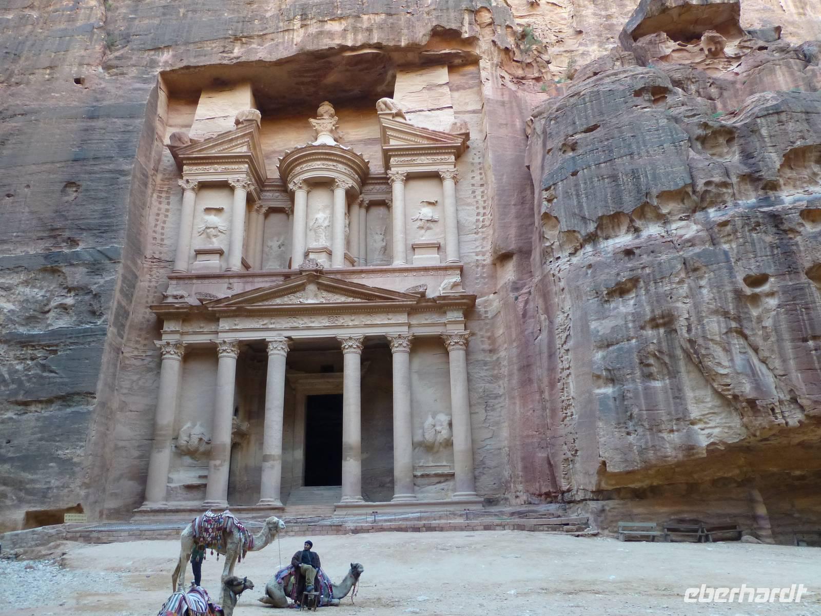 Wie bestellt treffen wir gleich nach der Grenze auf die ersten Kamele. Das Kamel hatte einen oder zwei Höcker. Das mit einem Höcker heißt nur bei uns Deutschen Dromedar. Mit dieser Bezeichnung stehen wir ganz allein in der Welt. Bei den Arabern sind Kamele, egal ob mit einem oder zwei Höcker ganz einfach Kamele. Wir fahren zuerst in die einzige jordanische Hafenstadt Aqaba. Jordanien hat nur einen Küstenstreifen von 28 km und so wird der größte Teil des Warenverkehrs über Aqaba abgewickelt. Die Stadt ist aber auch Badeort, es gibt einige Hotels und an einigen Stellen bemüht man sich auch eine „Grüne" Stadt zu schaffen. Es folgt Rundgang über den Suk, den Markt, hier kann man praktisch alles kaufen. Wir bestaunen die Riesenradischen, sehen das beim Fleischer am geschlachteten Tier noch der Kopf vorhanden ist (so weiß man was es für ein Tier ist) und schauen in einem Gewürzladen vorbei. Es ist Freitag und da ist für die Muslime ein freier Tag, so dass es auf dem Markt recht ruhig ist. Nur eine Stunde von Aqaba entfernt liegt das Wadi Rum. Es handelt sich hierbei um eine bizarre Felsen- und Wüstenlandschaft, die vor allem durch die Felsformation der „Sieben Säulen der Weisheit" bekannt ist. Im Besucherzentrum steigen wir vom Bus auf zwei Jeeps um. Bis zum Beduinendorf fahren wir noch auf einer Asphaltstraße, dann geht es hinein in diese grandiose Wüstenlandschaft, welche vor etwa 30 Mio. Jahren entstanden ist. Die Beduinen vom Stamm der Howeitat bewohnen heute das Gebiet des Wadi Rum. Im Sonnenlicht leuchten die Felsen in verschiedenen Rottönen, die Sockel der Felsformationen sind teilweise schwarzgrau. Die Sockel sind aus Granit und darüber hat sich Sandstein abgelagert. Wir machen einen ersten Halt an der Lawrence Quelle und sehen in Felsen eingeritzte Schriftzeichen welche bis heute nicht entziffert werden können. Weiter geht es in einen Siq, auch hier wieder interessante Felszeichnungen. Faszinierend ist auch die Verschiedenfarbigkeit des Sandes, vielleicht trägt auch die heute klare Luft dazu bei alles genauer wahrzunehmen. Am Vortag hatte es geregnet und die Temperaturen sind, trotz Sonnenschein, nicht sehr hoch. Voller Begeisterung verlassen wir das Wadi Rum (sprich Ram) und setzten unser Fahrt nach Petra fort. In Wadi Musa, dem Ort am Eingang zur Felsenstadt Petra wohnen wir die nächsten drei Nächte im Mövenpick Hotel. Das hervorragende Abendessen im Haus ist ein Genuss.