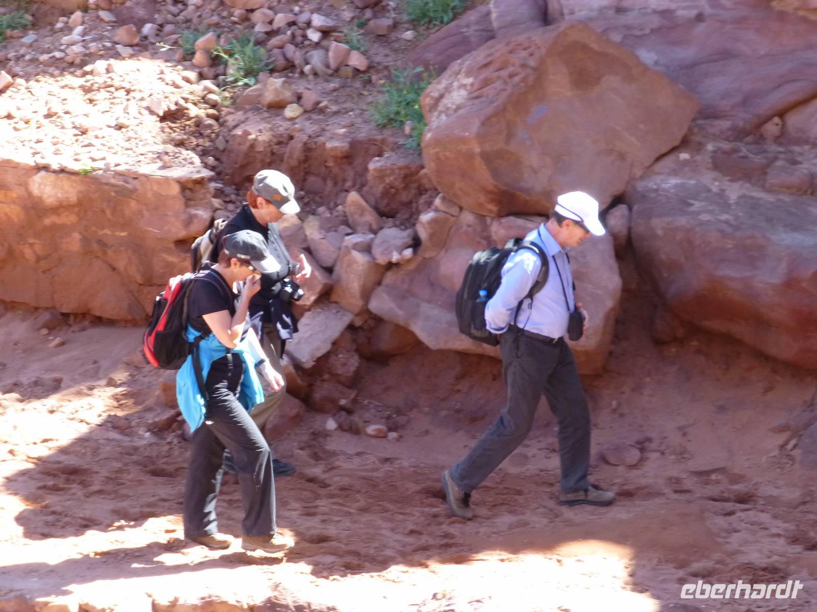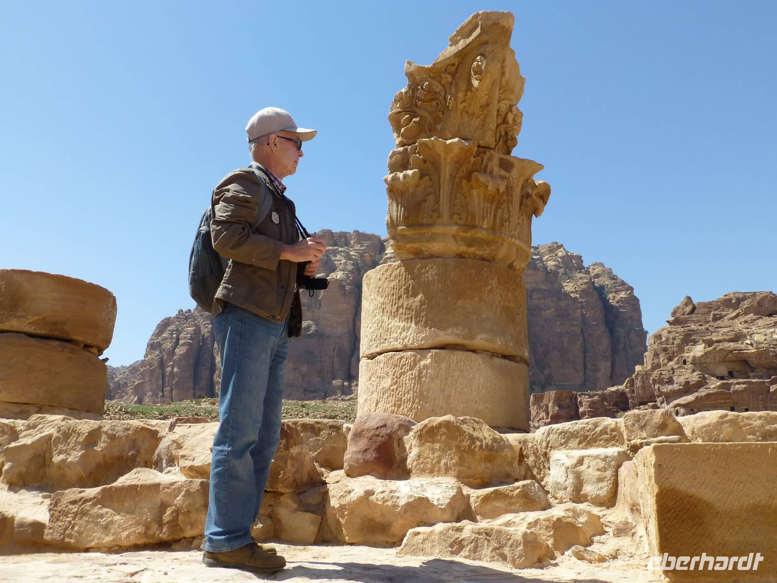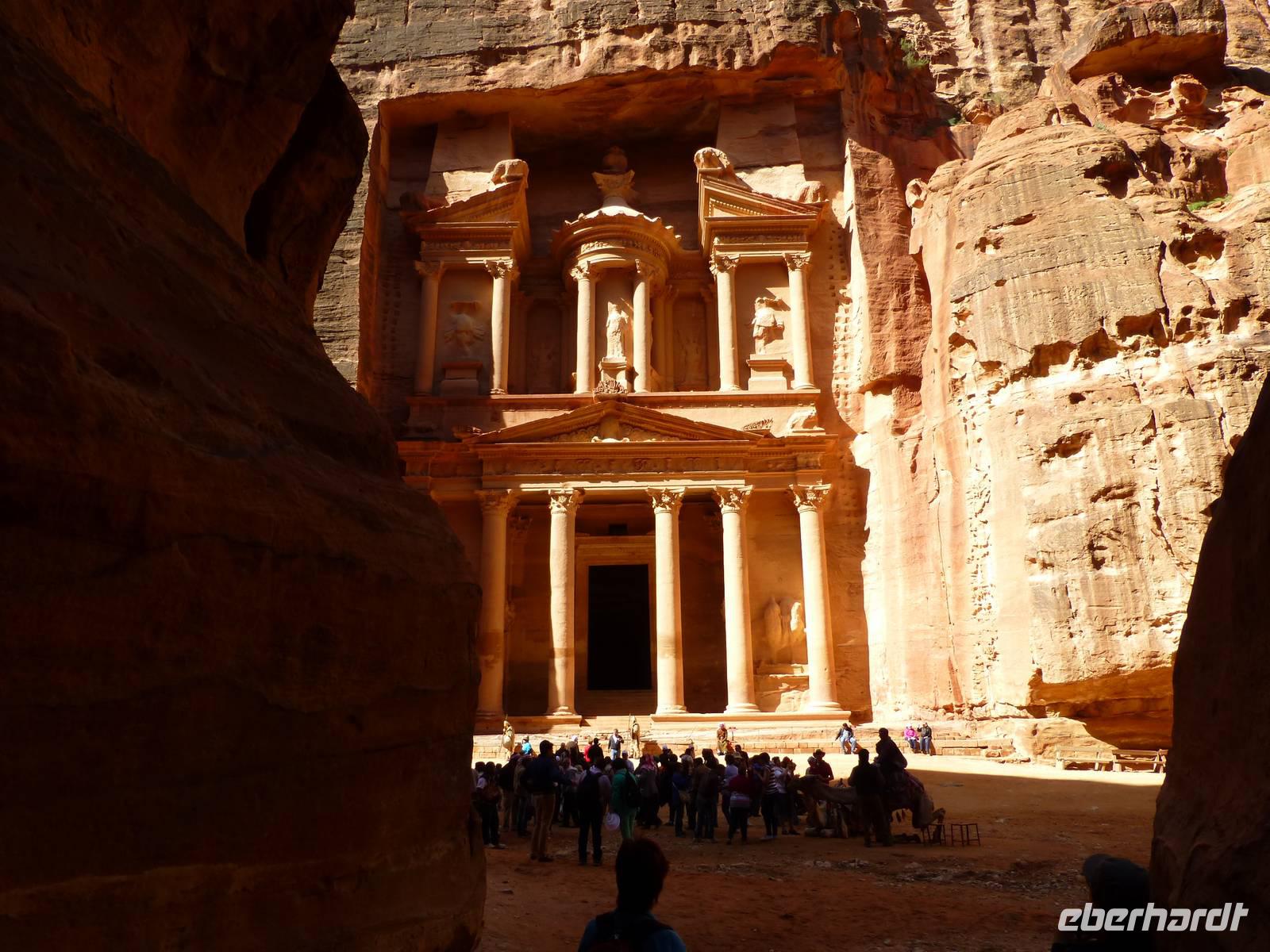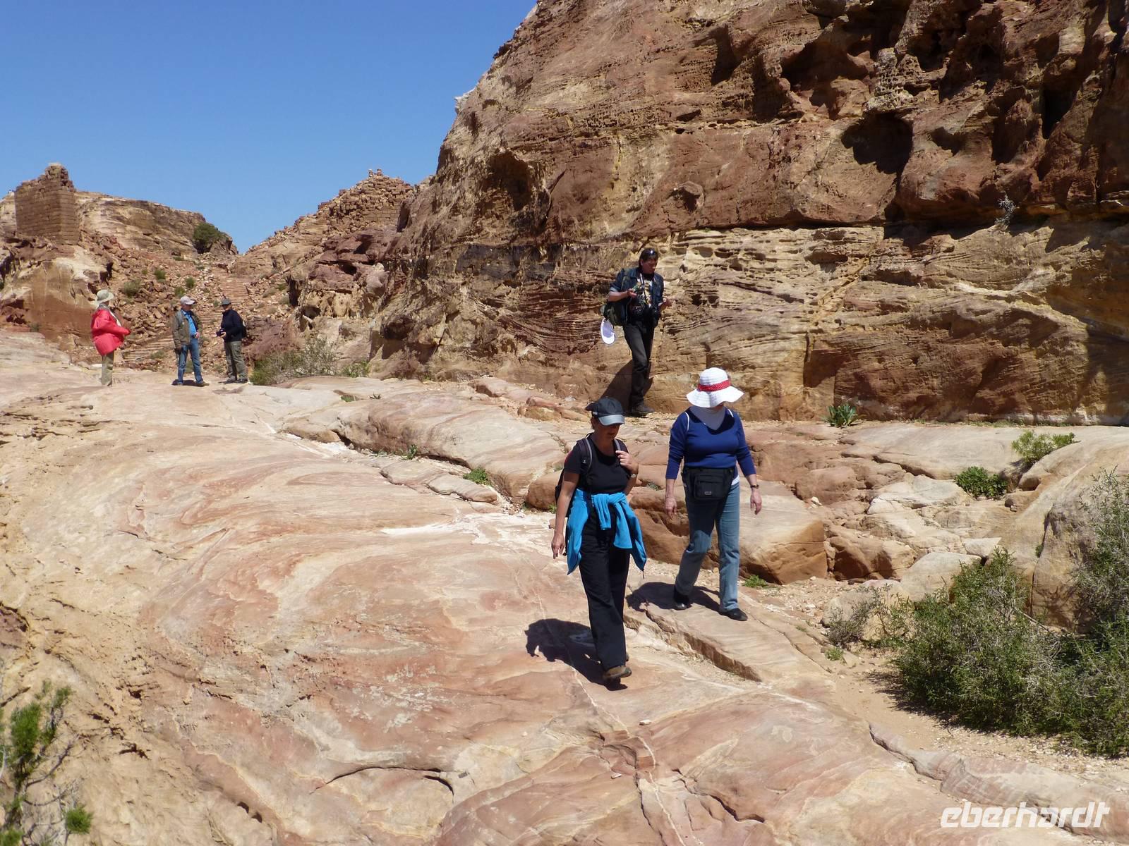 Nach dem Frühstück war es dann endlich soweit, wir besuchen die Felsenstadt Petra. Der Name Petra kommt von Petrus und bedeutet Felsen. Vom Visitor Center laufen wir bis zum Eingang des Siq, dabei kommen wir, sozusagen zur Einstimmung, an drei Blockgräbern vorbei. Die Nabatäer lebten ab dem 4. Jh. v. Chr. in dieser Gegend. Ursprünglich waren sie ein Nomadenvolk, entwickelten sich im Laufe der Zeit aber zu wichtigen Händlern von Luxusgütern auf der Weihrauchstraße. Zugleich waren sie auch hervorragende Wasserbauingenieure. Das letzte Mal hörte man von den Nabatäern im Jahre 328, wie eine aramäische Inschrift belegt. Danach verliert sich ihre Spur im Dunkeln, es wird angenommen, dass sie von den Römern assimiliert wurden. Wiederentdeckt wurde der Ort erst zu Beginn des 19. Jh. unter kuriosen Umständen durch den Schweizer Orientalisten Johann Ludwig Burckardt. Aber nun geht es endlich durch den Siq, einem Canyon, 1,2 km lang, an der schmalsten Stelle nur 2 m breit. Die bizarren Sandsteinformationen in ihren unterschiedlichen Farbtönen sind ein faszinierendes Erlebnis. Dann ist es soweit und der Ausgang des Siq ist erreicht. Jetzt machen wir alle das berühmteste Foto von Jordanien, wir fotografieren das Schatzhaus. Die Beduinen nannten es das Schatzhaus des Pharaos, da sie vermuteten, dass in der Urne an der Spitze des Bauwerks der Schatz des Pharaos ist. Aber eigentlich handelt es sich bei diesen aus dem Fels gehauenen Bauwerks um ein Grab. Alle Monumente sind übrigens von oben nach unten entstanden, denn hätte man unten angefangen wären durch herabstürzende Steine schon fertig gestellte Teile wieder beschädigt wurden. Nachdem wir das Schatzhaus ausreichend bestaunt und fotografiert haben laufen wir weiter und besichtigen weitere Gräber. Unterwegs legen wir eine Pause ein, es gibt schwarzen Tee mit Pfefferminzblättern, das erfrischt. Der Weg führt uns jetzt zum großen Tempel, dessen Restaurierung erst vor kurzem fertiggestellt wurde. Von der byzantinischen Kirche haben einen schönen Blick auf den Großen Tempel. Vor uns sehen wir schon die Königswand, mit dem Urnengrab, dem Seidengrab, dem Korinthischen Grab und dem Palastgrab. Die nabatäische Baukunst ist besonders gut daran zu erkennen, dass die Säulen nur halbrund und die Kapitelle als Nasenkapitelle gestaltet sind. Die Nabatäer konnten zu diesem Zeitpunkt noch keine Verzierungen an den Kapitellen herstellen. Die Schönheit der nabatäischen Kultur beeindruckt und überwältigt. Jetzt haben wir uns eine Mittagspause verdient, jeder kann nach seinen Wünschen etwas trinken oder essen. Den Rückweg zum Visitor Center kann jeder in seinem Tempo gestalten. Morgen werden wir noch einmal die Felsenstadt besuchen können.