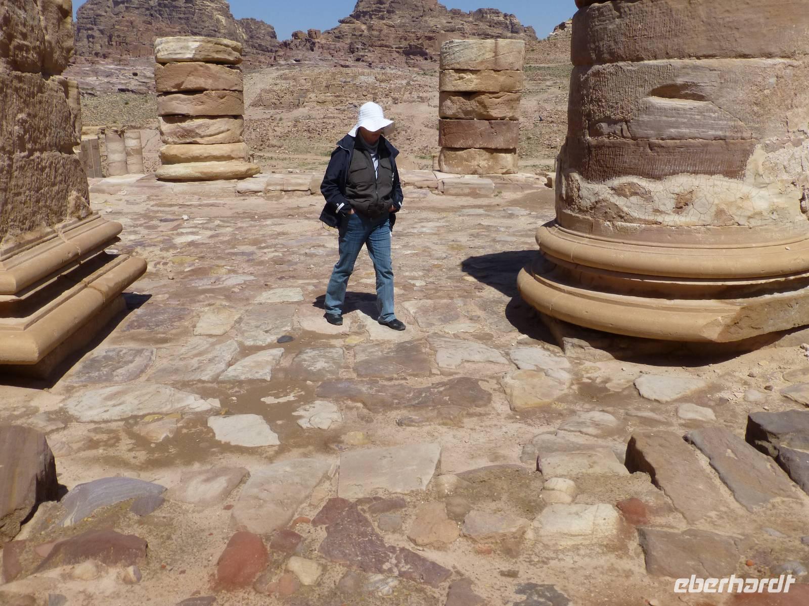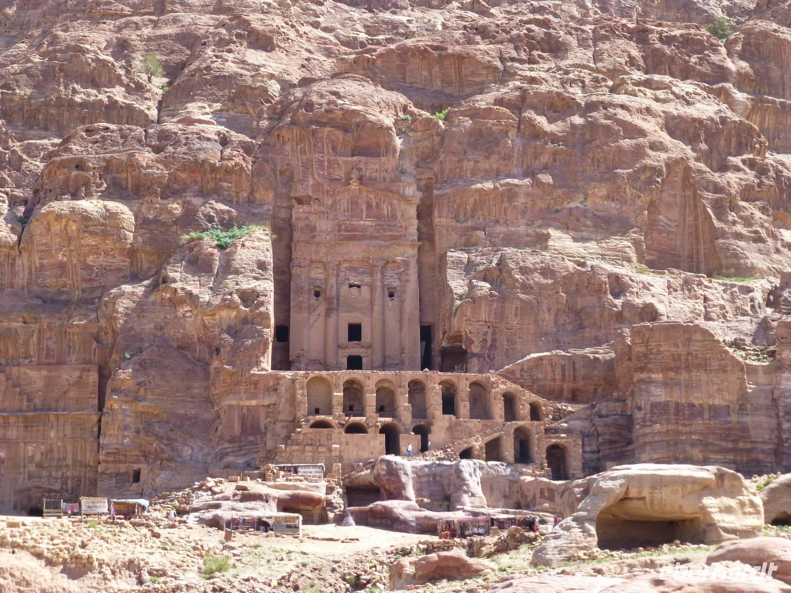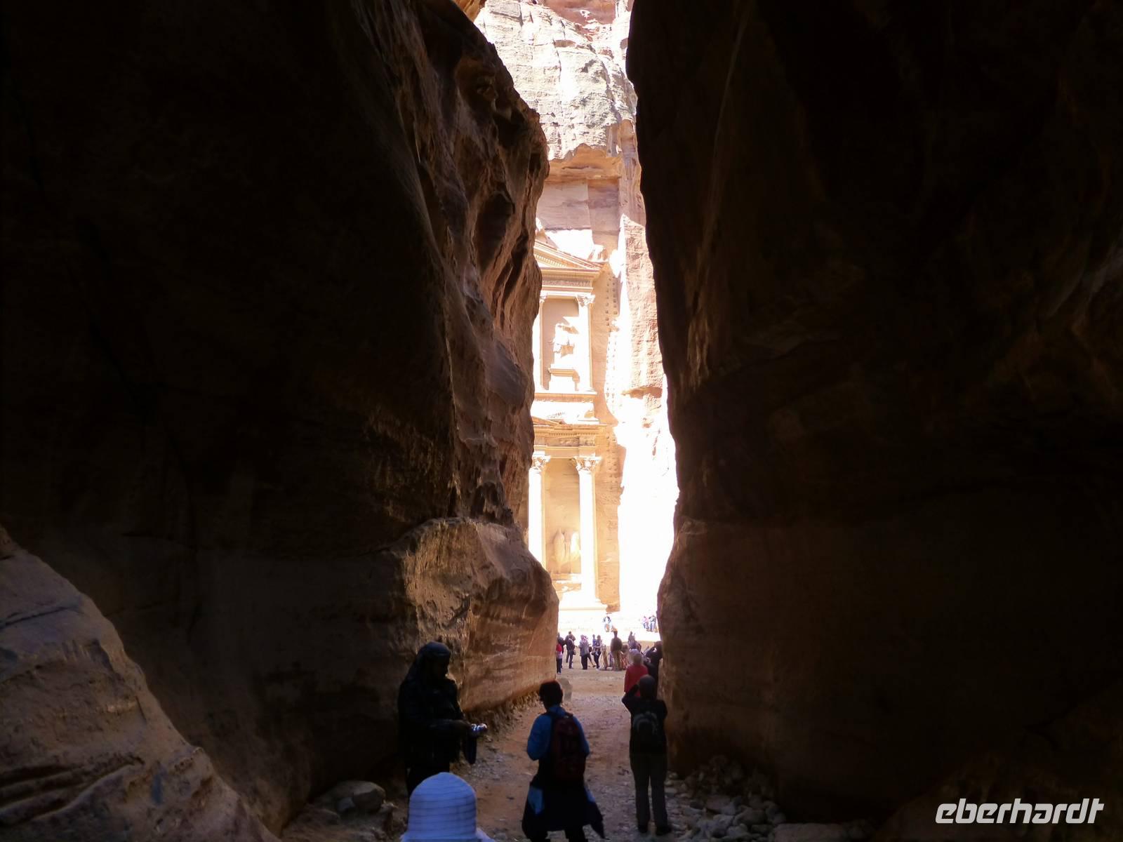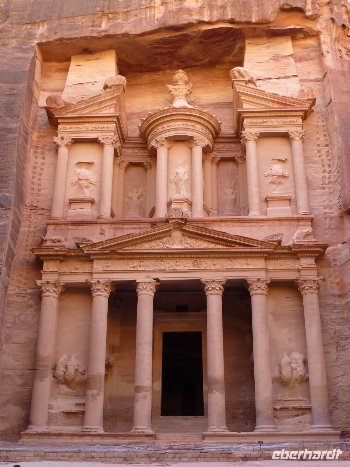 Nach dem Frühstück war es dann endlich soweit, wir besuchen die Felsenstadt Petra. Der Name Petra kommt von Petrus und bedeutet Felsen. Vom Visitor Center laufen wir bis zum Eingang des Siq, dabei kommen wir, sozusagen zur Einstimmung, an drei Blockgräbern vorbei. Die Nabatäer lebten ab dem 4. Jh. v. Chr. in dieser Gegend. Ursprünglich waren sie ein Nomadenvolk, entwickelten sich im Laufe der Zeit aber zu wichtigen Händlern von Luxusgütern auf der Weihrauchstraße. Zugleich waren sie auch hervorragende Wasserbauingenieure. Das letzte Mal hörte man von den Nabatäern im Jahre 328, wie eine aramäische Inschrift belegt. Danach verliert sich ihre Spur im Dunkeln, es wird angenommen, dass sie von den Römern assimiliert wurden. Wiederentdeckt wurde der Ort erst zu Beginn des 19. Jh. unter kuriosen Umständen durch den Schweizer Orientalisten Johann Ludwig Burckardt. Aber nun geht es endlich durch den Siq, einem Canyon, 1,2 km lang, an der schmalsten Stelle nur 2 m breit. Die bizarren Sandsteinformationen in ihren unterschiedlichen Farbtönen sind ein faszinierendes Erlebnis. Dann ist es soweit und der Ausgang des Siq ist erreicht. Jetzt machen wir alle das berühmteste Foto von Jordanien, wir fotografieren das Schatzhaus. Die Beduinen nannten es das Schatzhaus des Pharaos, da sie vermuteten, dass in der Urne an der Spitze des Bauwerks der Schatz des Pharaos ist. Aber eigentlich handelt es sich bei diesen aus dem Fels gehauenen Bauwerks um ein Grab. Alle Monumente sind übrigens von oben nach unten entstanden, denn hätte man unten angefangen wären durch herabstürzende Steine schon fertig gestellte Teile wieder beschädigt wurden. Nachdem wir das Schatzhaus ausreichend bestaunt und fotografiert haben laufen wir weiter und besichtigen weitere Gräber. Unterwegs legen wir eine Pause ein, es gibt schwarzen Tee mit Pfefferminzblättern, das erfrischt. Der Weg führt uns jetzt zum großen Tempel, dessen Restaurierung erst vor kurzem fertiggestellt wurde. Von der byzantinischen Kirche haben einen schönen Blick auf den Großen Tempel. Vor uns sehen wir schon die Königswand, mit dem Urnengrab, dem Seidengrab, dem Korinthischen Grab und dem Palastgrab. Die nabatäische Baukunst ist besonders gut daran zu erkennen, dass die Säulen nur halbrund und die Kapitelle als Nasenkapitelle gestaltet sind. Die Nabatäer konnten zu diesem Zeitpunkt noch keine Verzierungen an den Kapitellen herstellen. Die Schönheit der nabatäischen Kultur beeindruckt und überwältigt. Jetzt haben wir uns eine Mittagspause verdient, jeder kann nach seinen Wünschen etwas trinken oder essen. Den Rückweg zum Visitor Center kann jeder in seinem Tempo gestalten. Morgen werden wir noch einmal die Felsenstadt besuchen können.