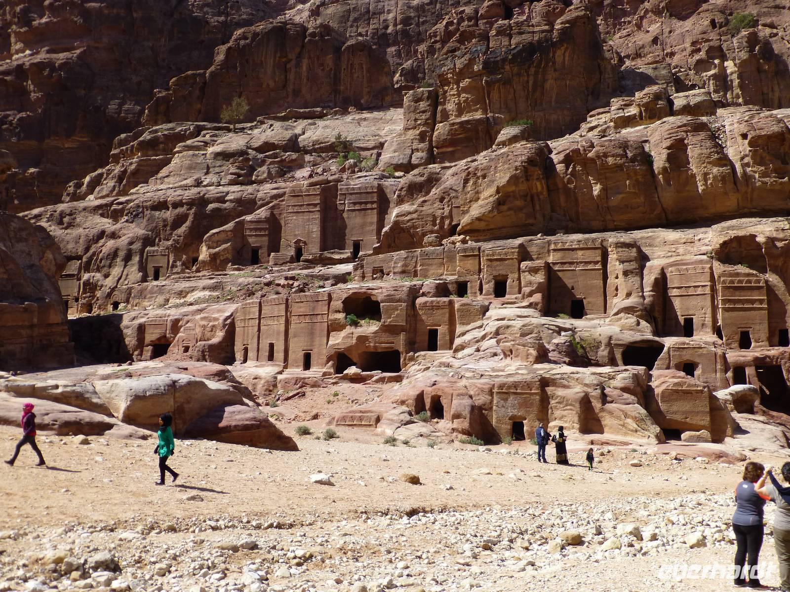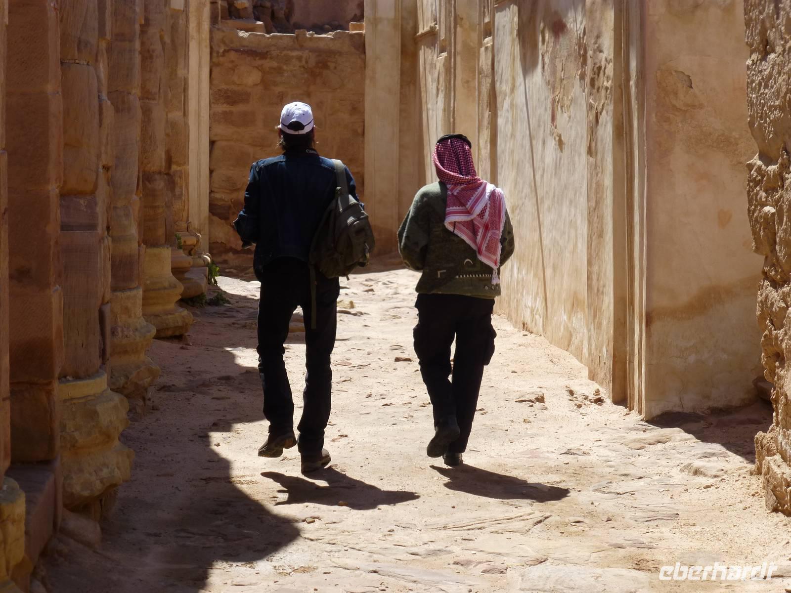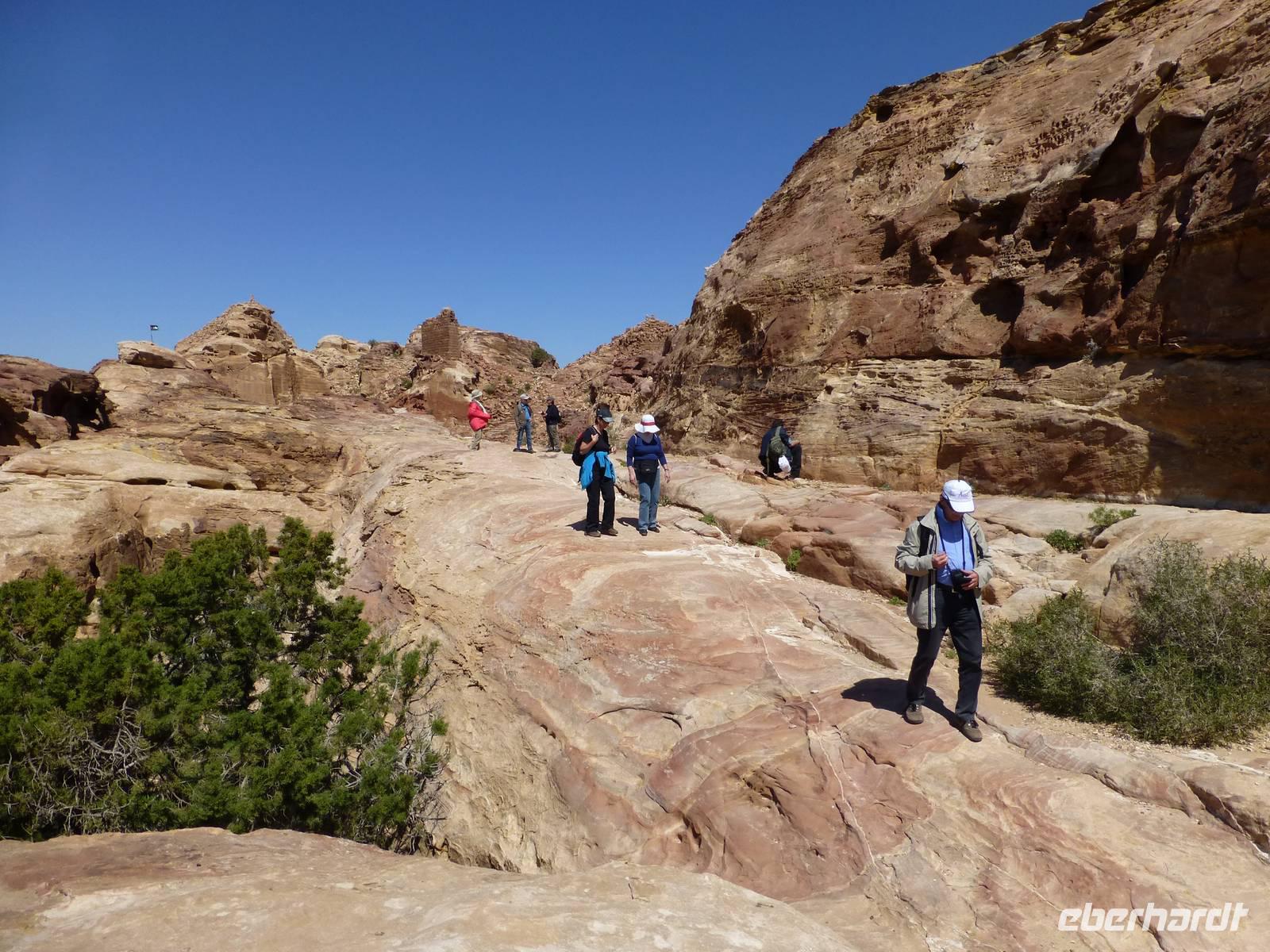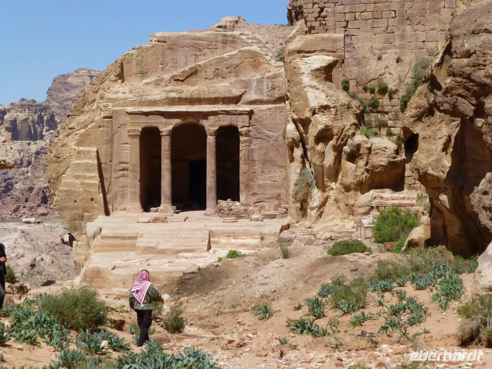 Nach dem Frühstück war es dann endlich soweit, wir besuchen die Felsenstadt Petra. Der Name Petra kommt von Petrus und bedeutet Felsen. Vom Visitor Center laufen wir bis zum Eingang des Siq, dabei kommen wir, sozusagen zur Einstimmung, an drei Blockgräbern vorbei. Die Nabatäer lebten ab dem 4. Jh. v. Chr. in dieser Gegend. Ursprünglich waren sie ein Nomadenvolk, entwickelten sich im Laufe der Zeit aber zu wichtigen Händlern von Luxusgütern auf der Weihrauchstraße. Zugleich waren sie auch hervorragende Wasserbauingenieure. Das letzte Mal hörte man von den Nabatäern im Jahre 328, wie eine aramäische Inschrift belegt. Danach verliert sich ihre Spur im Dunkeln, es wird angenommen, dass sie von den Römern assimiliert wurden. Wiederentdeckt wurde der Ort erst zu Beginn des 19. Jh. unter kuriosen Umständen durch den Schweizer Orientalisten Johann Ludwig Burckardt. Aber nun geht es endlich durch den Siq, einem Canyon, 1,2 km lang, an der schmalsten Stelle nur 2 m breit. Die bizarren Sandsteinformationen in ihren unterschiedlichen Farbtönen sind ein faszinierendes Erlebnis. Dann ist es soweit und der Ausgang des Siq ist erreicht. Jetzt machen wir alle das berühmteste Foto von Jordanien, wir fotografieren das Schatzhaus. Die Beduinen nannten es das Schatzhaus des Pharaos, da sie vermuteten, dass in der Urne an der Spitze des Bauwerks der Schatz des Pharaos ist. Aber eigentlich handelt es sich bei diesen aus dem Fels gehauenen Bauwerks um ein Grab. Alle Monumente sind übrigens von oben nach unten entstanden, denn hätte man unten angefangen wären durch herabstürzende Steine schon fertig gestellte Teile wieder beschädigt wurden. Nachdem wir das Schatzhaus ausreichend bestaunt und fotografiert haben laufen wir weiter und besichtigen weitere Gräber. Unterwegs legen wir eine Pause ein, es gibt schwarzen Tee mit Pfefferminzblättern, das erfrischt. Der Weg führt uns jetzt zum großen Tempel, dessen Restaurierung erst vor kurzem fertiggestellt wurde. Von der byzantinischen Kirche haben einen schönen Blick auf den Großen Tempel. Vor uns sehen wir schon die Königswand, mit dem Urnengrab, dem Seidengrab, dem Korinthischen Grab und dem Palastgrab. Die nabatäische Baukunst ist besonders gut daran zu erkennen, dass die Säulen nur halbrund und die Kapitelle als Nasenkapitelle gestaltet sind. Die Nabatäer konnten zu diesem Zeitpunkt noch keine Verzierungen an den Kapitellen herstellen. Die Schönheit der nabatäischen Kultur beeindruckt und überwältigt. Jetzt haben wir uns eine Mittagspause verdient, jeder kann nach seinen Wünschen etwas trinken oder essen. Den Rückweg zum Visitor Center kann jeder in seinem Tempo gestalten. Morgen werden wir noch einmal die Felsenstadt besuchen können.