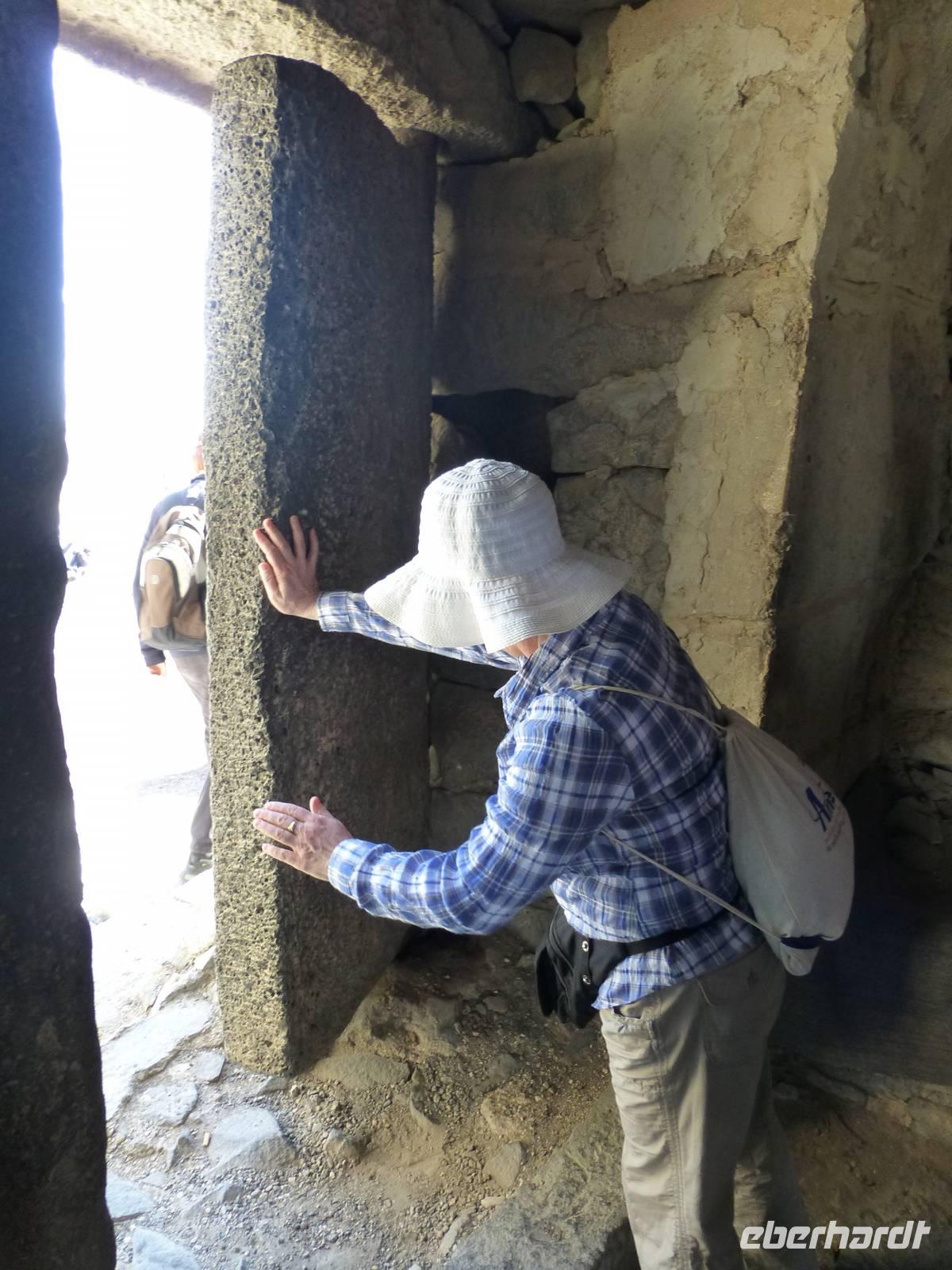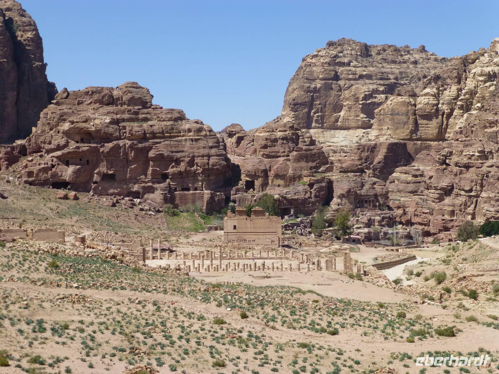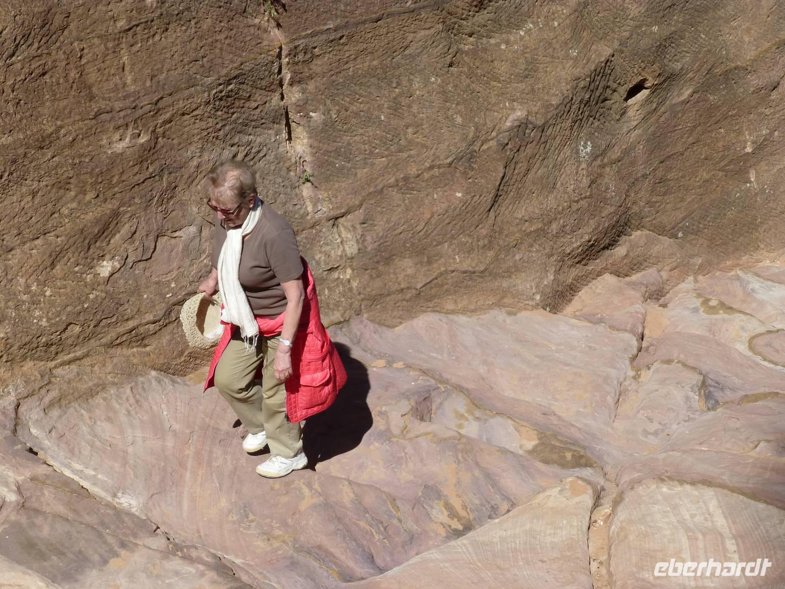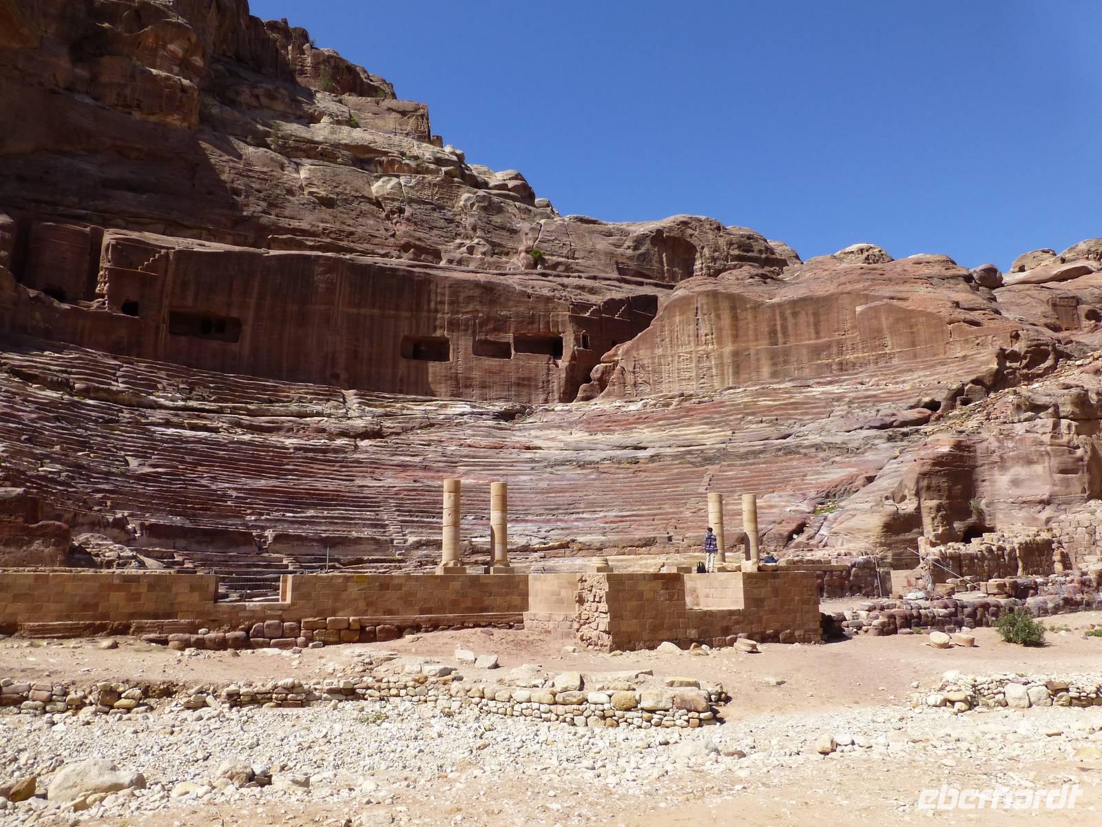 Nach dem Frühstück war es dann endlich soweit, wir besuchen die Felsenstadt Petra. Der Name Petra kommt von Petrus und bedeutet Felsen. Vom Visitor Center laufen wir bis zum Eingang des Siq, dabei kommen wir, sozusagen zur Einstimmung, an drei Blockgräbern vorbei. Die Nabatäer lebten ab dem 4. Jh. v. Chr. in dieser Gegend. Ursprünglich waren sie ein Nomadenvolk, entwickelten sich im Laufe der Zeit aber zu wichtigen Händlern von Luxusgütern auf der Weihrauchstraße. Zugleich waren sie auch hervorragende Wasserbauingenieure. Das letzte Mal hörte man von den Nabatäern im Jahre 328, wie eine aramäische Inschrift belegt. Danach verliert sich ihre Spur im Dunkeln, es wird angenommen, dass sie von den Römern assimiliert wurden. Wiederentdeckt wurde der Ort erst zu Beginn des 19. Jh. unter kuriosen Umständen durch den Schweizer Orientalisten Johann Ludwig Burckardt. Aber nun geht es endlich durch den Siq, einem Canyon, 1,2 km lang, an der schmalsten Stelle nur 2 m breit. Die bizarren Sandsteinformationen in ihren unterschiedlichen Farbtönen sind ein faszinierendes Erlebnis. Dann ist es soweit und der Ausgang des Siq ist erreicht. Jetzt machen wir alle das berühmteste Foto von Jordanien, wir fotografieren das Schatzhaus. Die Beduinen nannten es das Schatzhaus des Pharaos, da sie vermuteten, dass in der Urne an der Spitze des Bauwerks der Schatz des Pharaos ist. Aber eigentlich handelt es sich bei diesen aus dem Fels gehauenen Bauwerks um ein Grab. Alle Monumente sind übrigens von oben nach unten entstanden, denn hätte man unten angefangen wären durch herabstürzende Steine schon fertig gestellte Teile wieder beschädigt wurden. Nachdem wir das Schatzhaus ausreichend bestaunt und fotografiert haben laufen wir weiter und besichtigen weitere Gräber. Unterwegs legen wir eine Pause ein, es gibt schwarzen Tee mit Pfefferminzblättern, das erfrischt. Der Weg führt uns jetzt zum großen Tempel, dessen Restaurierung erst vor kurzem fertiggestellt wurde. Von der byzantinischen Kirche haben einen schönen Blick auf den Großen Tempel. Vor uns sehen wir schon die Königswand, mit dem Urnengrab, dem Seidengrab, dem Korinthischen Grab und dem Palastgrab. Die nabatäische Baukunst ist besonders gut daran zu erkennen, dass die Säulen nur halbrund und die Kapitelle als Nasenkapitelle gestaltet sind. Die Nabatäer konnten zu diesem Zeitpunkt noch keine Verzierungen an den Kapitellen herstellen. Die Schönheit der nabatäischen Kultur beeindruckt und überwältigt. Jetzt haben wir uns eine Mittagspause verdient, jeder kann nach seinen Wünschen etwas trinken oder essen. Den Rückweg zum Visitor Center kann jeder in seinem Tempo gestalten. Morgen werden wir noch einmal die Felsenstadt besuchen können.