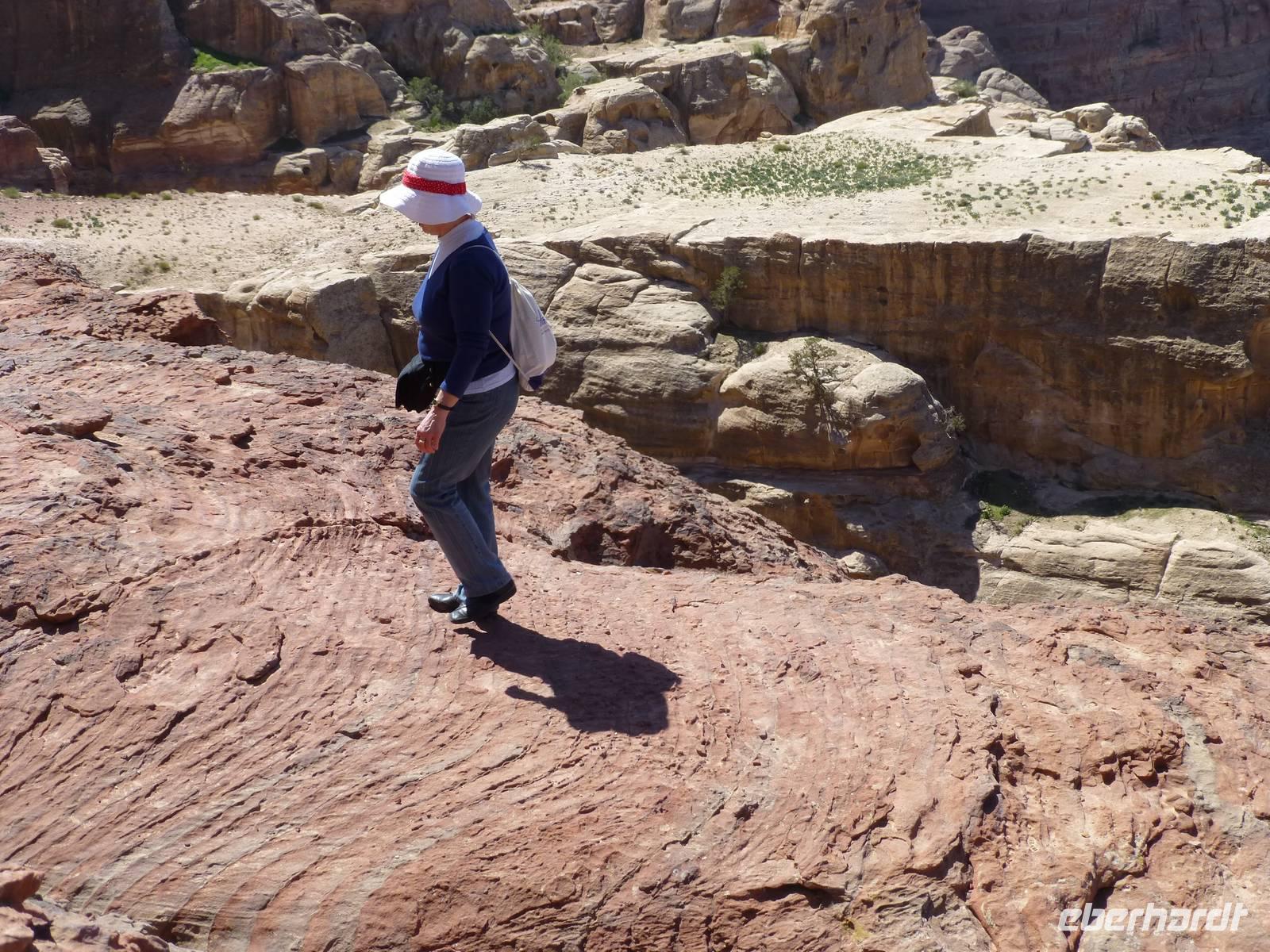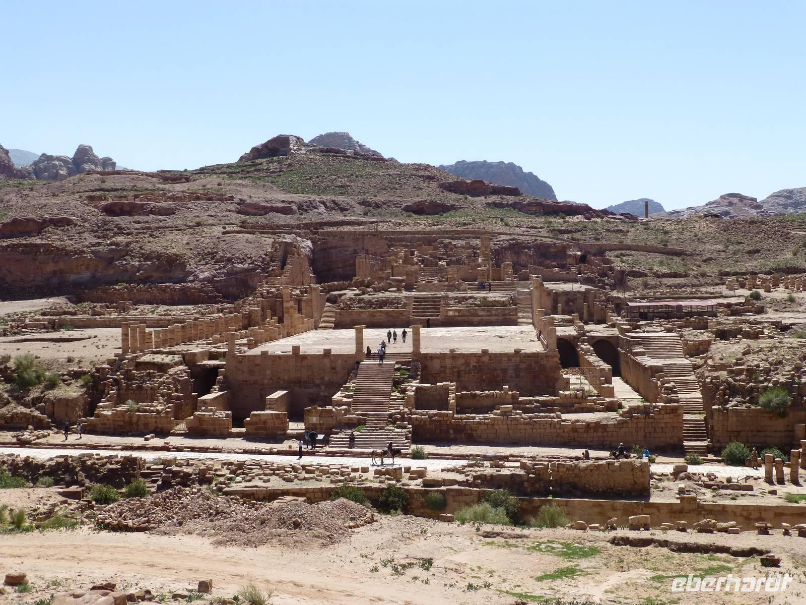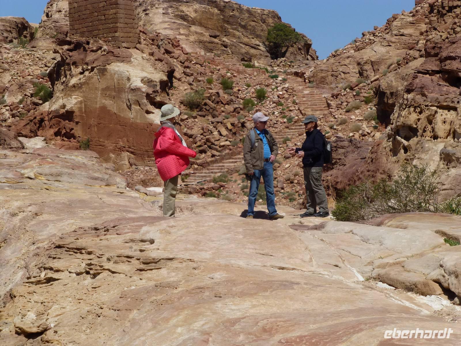 Wir haben das große Glück Petra an zwei Tagen zu besuchen, die meisten Besucher kommen nur für einen Tag. Mahmoud, unser Reiseleiter, bietet einen weiteren Rundgang an, welcher aber nicht verpflichtend ist. So kann man auch seiner eigenen Wege gehen. Vom Visitor Center laufen wir wieder durch den Siq zum Schatzhaus. Hier verweilen wir noch einmal um die Pracht der Fassade bei schönster Beleuchtung zu genießen. Danach heißt es Treppen steigen. Allerdings nur für die Gäste, die wirklich möchten oder können. Über 800 Treppenstufen führen nach oben zum Opferplatz und dort werden wir mit einer wundervollen Aussicht über das ganze Areal von Petra belohnt. Der Weg nach unten führt uns dann vorbei am Löwenrelief, dem Gartentempel, dem Bunten Saal und dem Soldatengrab wieder ins Tal zurück. Nach fast 4 Stunden haben wir uns dann eine Mittagspause verdient. Anschließend machen wir uns wieder auf den Rückweg zum Hotel. Der Nachmittag steht uns zur freien Verfügung und alle nutzen die Zeit um im Hotel ein wenig auszuspannen. Zum Abendessen genießen wir noch einmal die hervorragende Küche des Mövenpick Hotel.