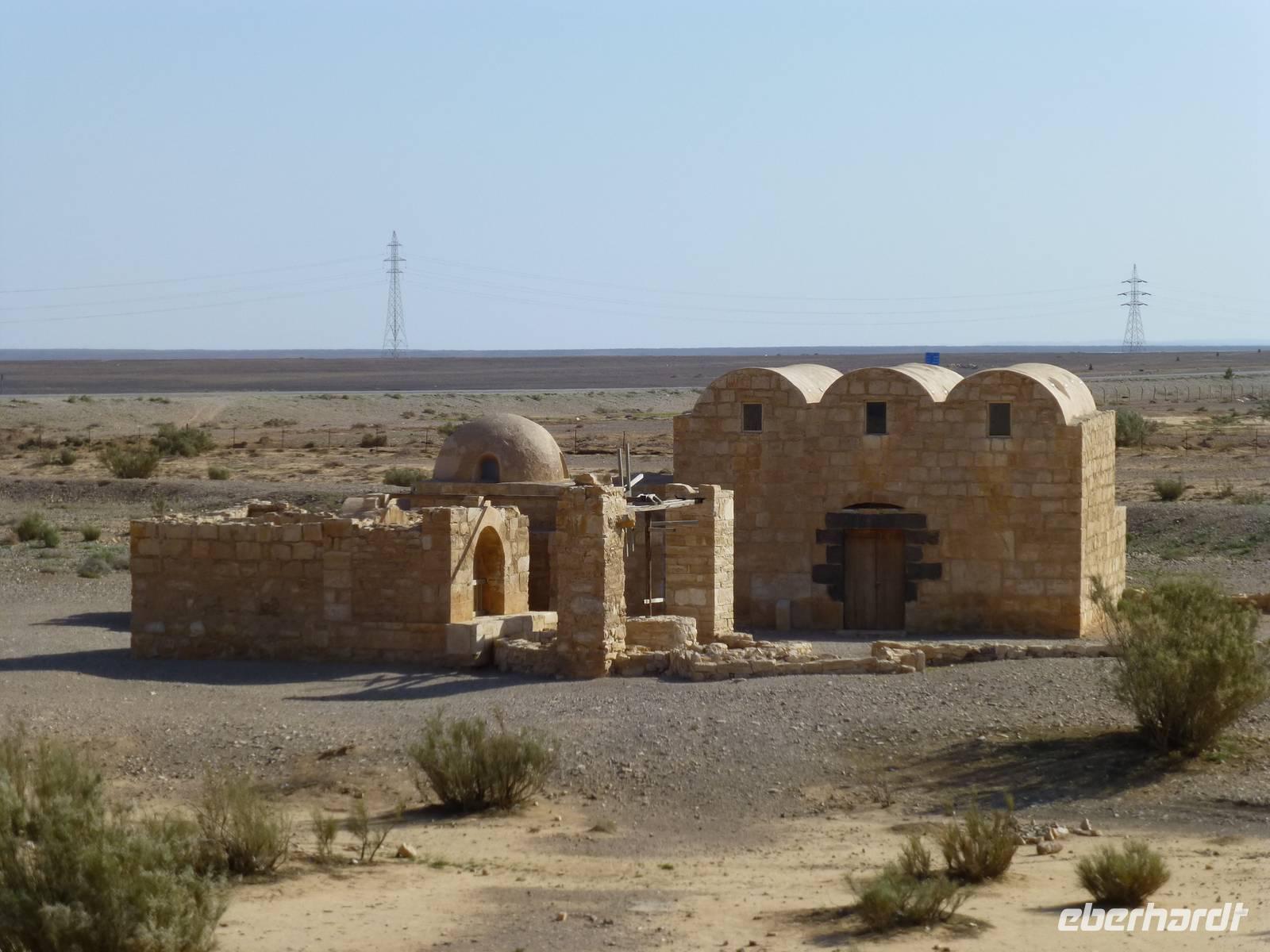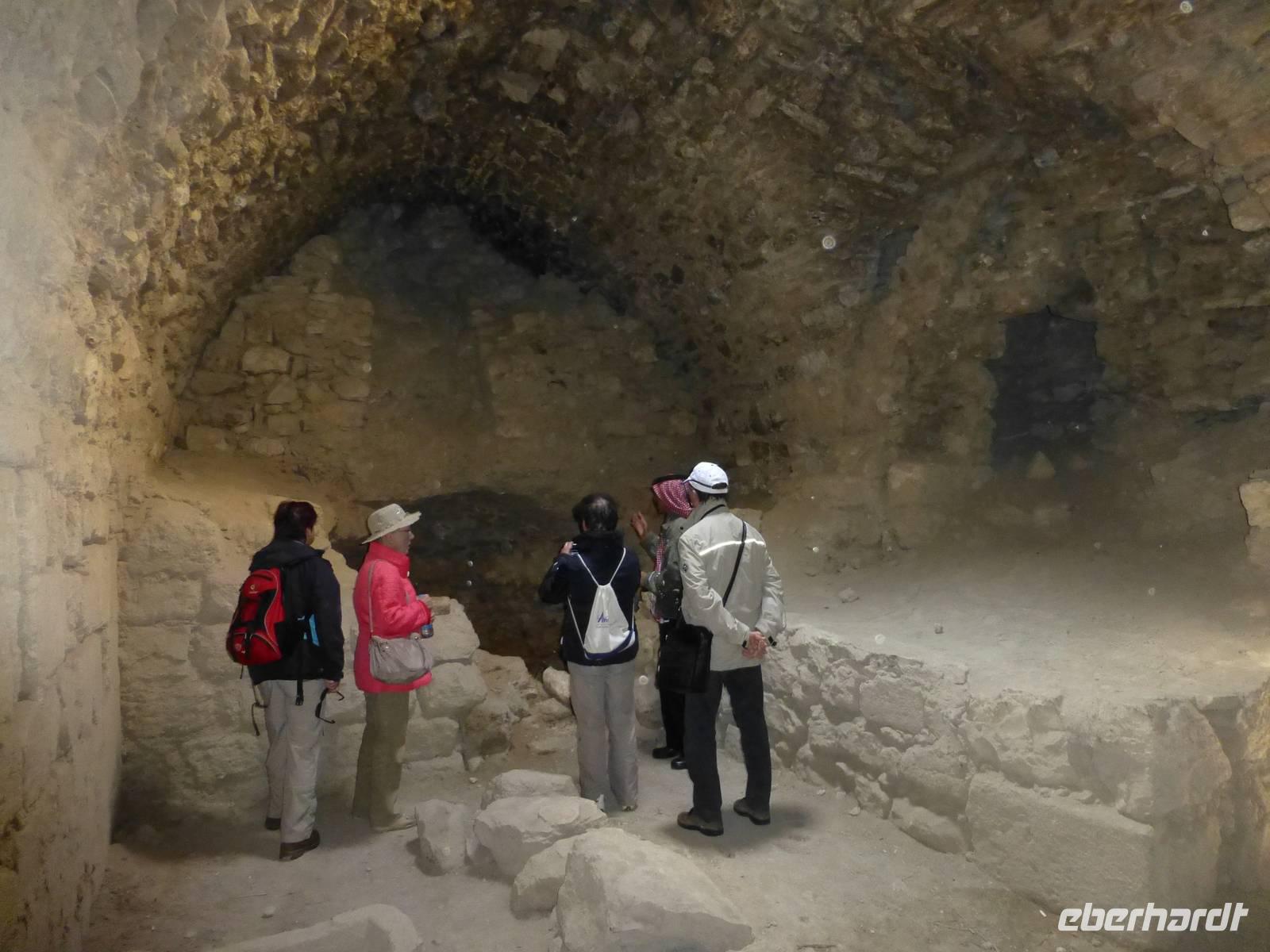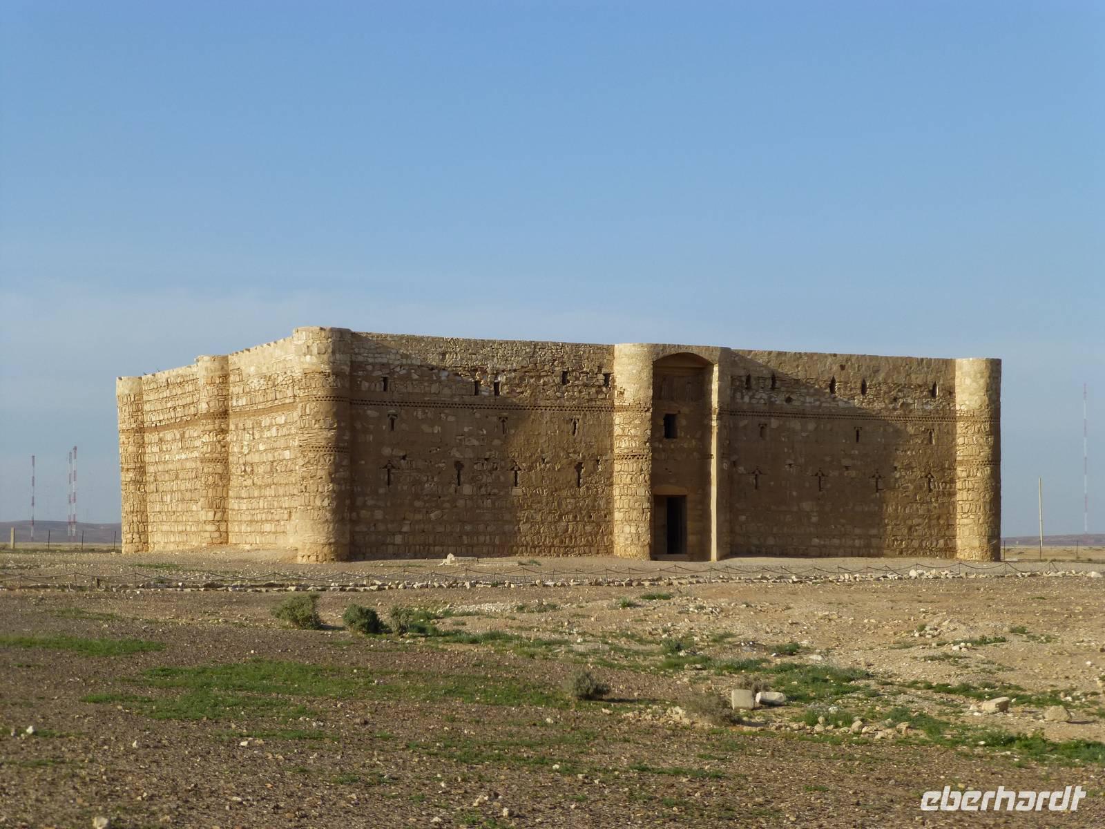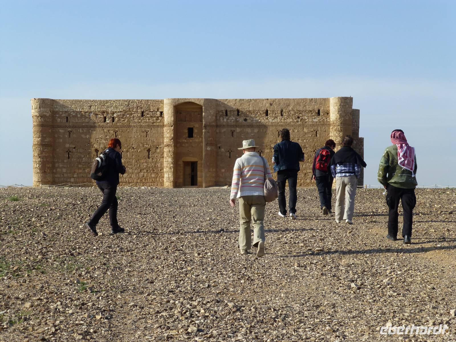 Am Morgen fahren wir zuerst durch die Neustadt von Amman. Anschließend besuchen wir die größte Moschee des Landes. Die König Abdallah Moschee ist benannt nach dem Großvater von König Hussein. Abdallah I wurde am 20. Juli 1951 in der Al Aqsa Moschee in Jerusalem ermordet wurde. Wir betreten staunend den Gebetsraum für Männer, vorher mussten sich die Frauen unserer Gruppe verhüllen, genauso wie es der islamische Glaube gebietet. Sie haben aber damit kein Problem, denn das Erleben im inneren der Moschee beeindruckt. Mahmoud erklärt uns hier die Grundlagen des islamischen Glaubens und spricht auch über den Koran. Die Frauen unserer Gruppe besuchen dann auch noch den Gebetsraum für Frauen, wir Männer dürfen da nicht mit hinein. Die King Abdallah Moschee ist die einzige Moschee des Landes, welche von Nichtmuslimen besucht werden darf. Auf der anderen Straßenseite befindet sich eine christlich-orthodoxe Kirche, man könnte glatt von einem ökumenischen Beisammensein sprechen. Von der Zitadelle Ammans, gelegen auf einem der 14 Hügel auf denen sich die Stadt ausbreitet, haben wir eine gute Aussicht über die Viertel der Stadt. Wir bekommen eine Menge zur Geschichte erklärt und besuchen das Archelogische Museum mit verschiedenen Funden aus Jordanien. So erfahren wir, dass die heutige Stadt Amman die erste auf der Welt war, welche den Namen Philadelphia trug. Benannt wurde sie so nach dem ägyptischen Herrscher Ptolemäus II Philadelphos. Von der Zitadelle aus sehen wir auch den größten Fahnenmast der Welt. Er ist 126,8 m hoch. An ihm weht, heute leider nicht so toll, die Jordanische Fahne mit den stolzen Maßen von 60 x 40 m. Von weiten sehen wir auch den königlichen Palast von Amman, welcher aber nur zu offiziellen Anlässen benutzt wird. Der König, Abdulla II und seine Frau Ranja, wohnen mit ihren 4 Kindern einige Kilometer außerhalb des Stadtzentrums. In Jordanien übt der König die absolute Macht aus, nicht wie in vielen andern Königreichen wo der König nur eine repräsentative Aufgabe hat. Am Nachmittag besichtigen wir dann die außerhalb der Stadt gelegenen Omajadischen Wüstenschlösser. Zuerst besuchen wir das Wüstenschloss Qasr al-Azraq. Es unterscheidet sich vor allem durch das Baumaterial Basalt, von den anderen Wüstenschlösser welche aus Kalkstein gebaut sind. Ursprünglich war es ein von den Römern im 2. Jh.n.Ch. gebautes Castel zur Verteidigung gegen aus der Wüste vorrückende Beduinen. Im Winter 1917/1918 überwinterte Lawrence von Arabien hier. Seine Schildwachen schlossen jeden Abend die drei Tonnen schwere, heute immer noch vorhandene, Tür aus einer Granitplatte ab. 1927 wurde durch ein Erdbeben ein Großteil der Anlage schwer in Mitleidenschaft gezogen. Gleich in der Nähe haben wir die Möglichkeit Mittagspause in einem Restaurant zu machen. Das nächste Wüstenschloss ist eher ein Schlösschen. Sein Name, Qusair Amra, sagt das auch aus. Es besteht aus 6 Gebäudeteilen, wobei die Audienzhalle ein wahres Schmuckstück ist. Wände und Decken sind mit zahlreichen Fresken versehen. Dargestellt werden u .a. halbnackte Frauen. Im Islam ist es aber nicht gestattet Menschen abzubilden. So kann man daraus schließen, dass die Arbeiter, welche dieses Schlösschen bauten und gestalteten, keine Araber waren. Vermutlich waren es Griechen. Dem damaligen Besitzer hat es aber wohl gefallen, er hat es sich extra als Lust- und Jagdschlösschen bauen lassen. Mahmuod erklärt uns, dass in der Wüste früher u. a. Antilopen und Gazellen gejagt wurden. Heute gehört das im Jahre 711 errichtet Schlösschen zum UNESCO Weltkulturerbe. Nur wenige Minuten sind es mit dem Bus bis zum dritten Wüstenschloss, es trägt den Namen Qasr al-Kharana und steht trutzig in der Landschaft. Es beeindruckt auf den ersten Blick vor allem von außen mit seiner Größe. Normalerweise würde man hier auch nicht von einem Schloss reden. Sehr wahrscheinlich wurde es als Karawanserei für Pilgerreisen nach Mekka genutzt. Im Erdgeschoss des Gebäudes befanden sich Stallungen und Lagerräume. Da so eine Karawane früher enorme Werte mit sich führte war solch ein burgähnlicher Bau zur Übernachtung sicher nicht unangebracht. Man kann auch recht eindeutig nachweisen, aus welcher Zeit die Anlage stammt. Eine Inschrift verrät uns, dass ein Bewohner am 13.11.710 dort übernachtet hat. Insgesamt gibt es im Gebäude 44 Räume auf zwei Etagen, eine Tatsache die man dem Gebäude von außen nicht ansieht. Zurück in unserem Hotel in Amman genießen wir das reichhaltige Abendbuffet.