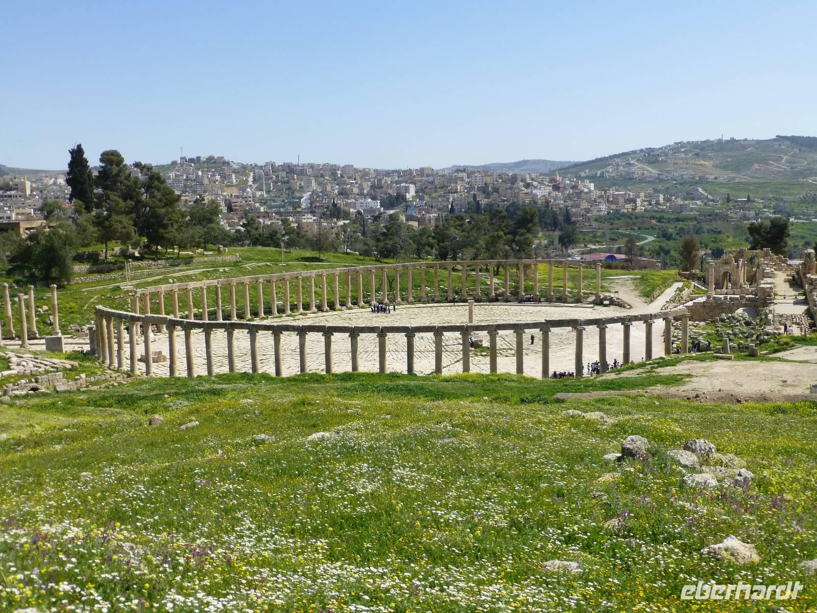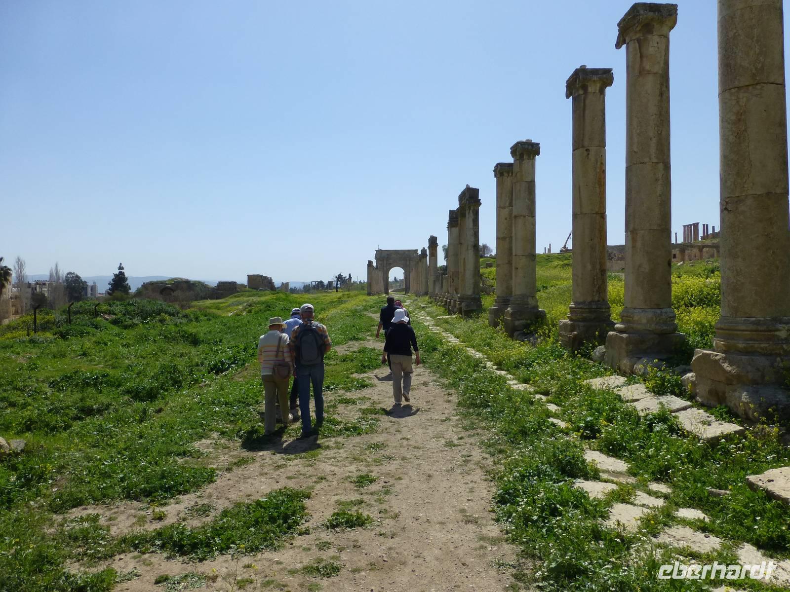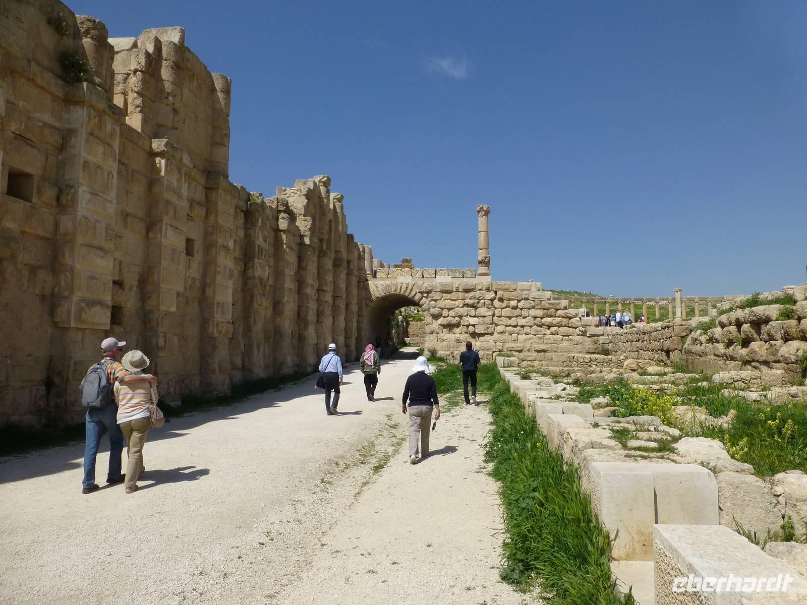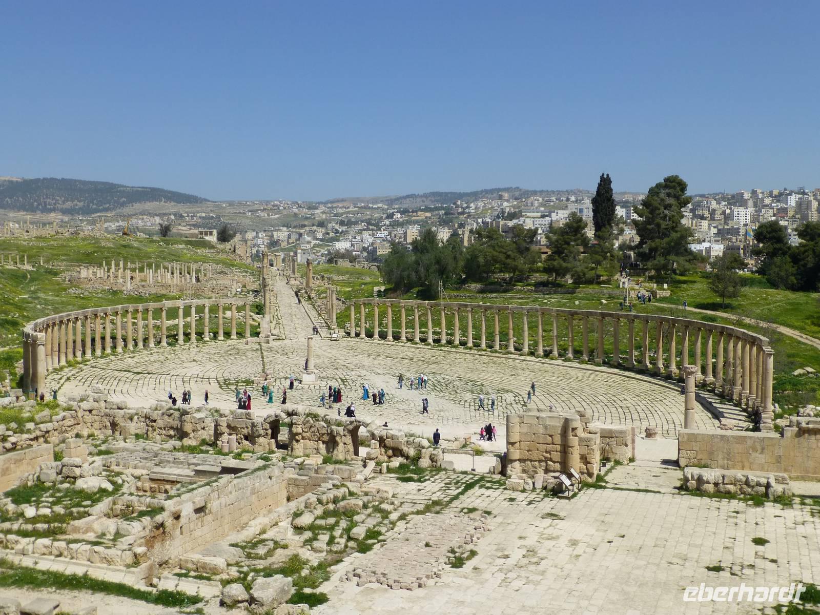 Nach dem Frühstück fahren wir nach Ajlun und Jerash. Bis Ajlun dauert die Fahrt gute 1,5 h. Das Wetter ist, wie auch an allen anderen Tagen unserer Reise wieder sonnig. Kurz nach der Stadt Amman ändert sich die Landschaft, es gibt Wälder, zum Teil durch Aufforstung, aber auch natürliche. Zum Beispiel gibt es hier Steineichenwälder, Steineichen sind übrigens immergrüne Bäume. Später kommen Olivenbäume hinzu und auch immer wieder Flächen mit Grünland. Oberhalb der kleinen Stadt Ajlun befindet sich die islamische Burg Qalaat al-abad. Jordaniens einzige mittelalterliche Burg wurde im 12. Jh. errichtet um die Gegend vor den Kreuzfahrer zu sichern. Bauherr war ein Neffe des großen Sultans Saladin, Izz ed-Din Usama. Benötigt hat man die Festung allerdings nie, denn bereits drei Jahre nach ihrer Fertigstellung wurden das Kreuzfahrerheer 1187 in der Schlacht bei Hittin geschlagen. Die Kreuzfahrer bezeichnet man hier übrigens nicht als solche, man nennt sie Frankenritter. Nach ca. 45 Minuten Fahrt erreichen wir Jerash mit der bedeutendsten römischen Ausgrabung auf jordanischem Gebiet. Kaiser Hadrian rühmte sie „als die Stadt die alle Schönheiten in sich vereint". Und so ließ er sich auch gleich einen Triumphbogen bauen und dazu ein Hippodrom, eine Pferderennbahn. Wir treten am Südtor in die Stadt ein und gelangen als erstes zum ovalen Platz, so genannt weil er nicht rund ist. Beeindruckend wird er von Säulen umrahmt. Wir besuchen dann das Südtheater, welches sich neben dem Zeus-Tempel befindet. Hier erleben wir viel ausgelassene jordanische Jugendliche auf einem Schulausflug. Als dann noch eine kleine Dudelsackkapelle aufspielt tanzen einige der Mädchen dazu. Die Musiker sind pensionierte Militärmusiker, welche mit Genehmigung dort spielen dürfen. Der Dudelsack wurde 1917 beim Militär eingeführt, als zahlreiche Araber in den Truppen der britischen Armee in Transjordanien dienten. Frankreich und Großbritannien hatten sich 1916 in einem geheimen Vertrag über die Aufteilung der arabischen Staaten geeinigt und somit eigentlich neue Kolonien geschaffen. Der Dudelsack, welcher seinen Ursprung tatsächlich in den arabischen Ländern hat und über Spanien nach Schottland gekommen ist, erfreut sich hier im Land großer Beliebtheit. Keine Hochzeit ohne Dudelsackmusik und das kann ruhig auch schottische sein. Nach dem Ende des knapp zwei Stunden dauernden Rundgangs haben wir uns in einem nahen Restaurant eine Mittagspause verdient. Nach der Rückkehr ins Hotel unternehmen wir noch einen Spaziergang auf einer der Einkaufsstraßen der Stadt. Hier können wir am alltäglichen Leben der Ammaner etwas teilnehmen. Zu Abend essen wir wieder vom Buffet im Hotelrestaurant.