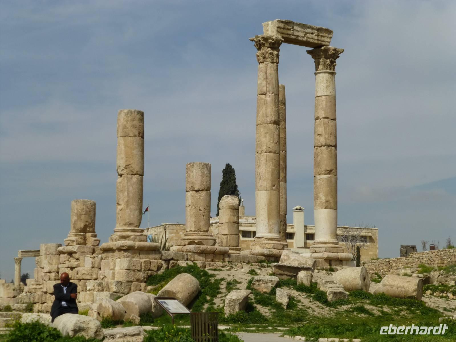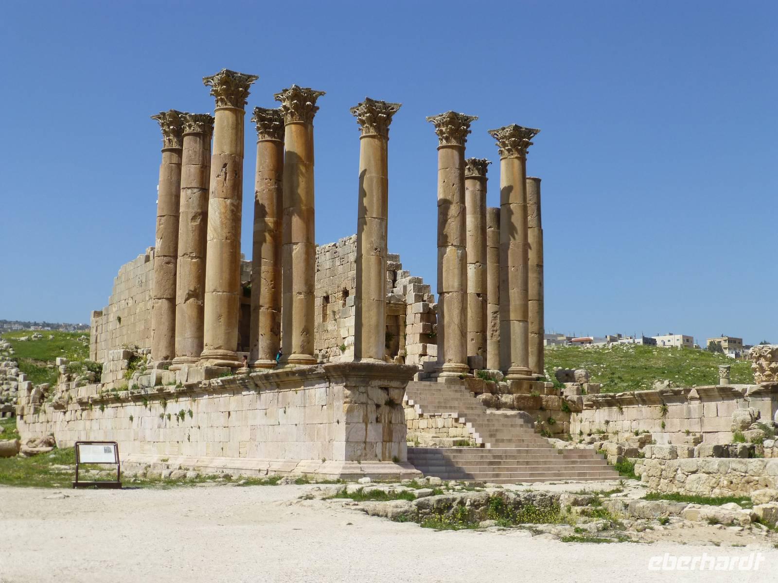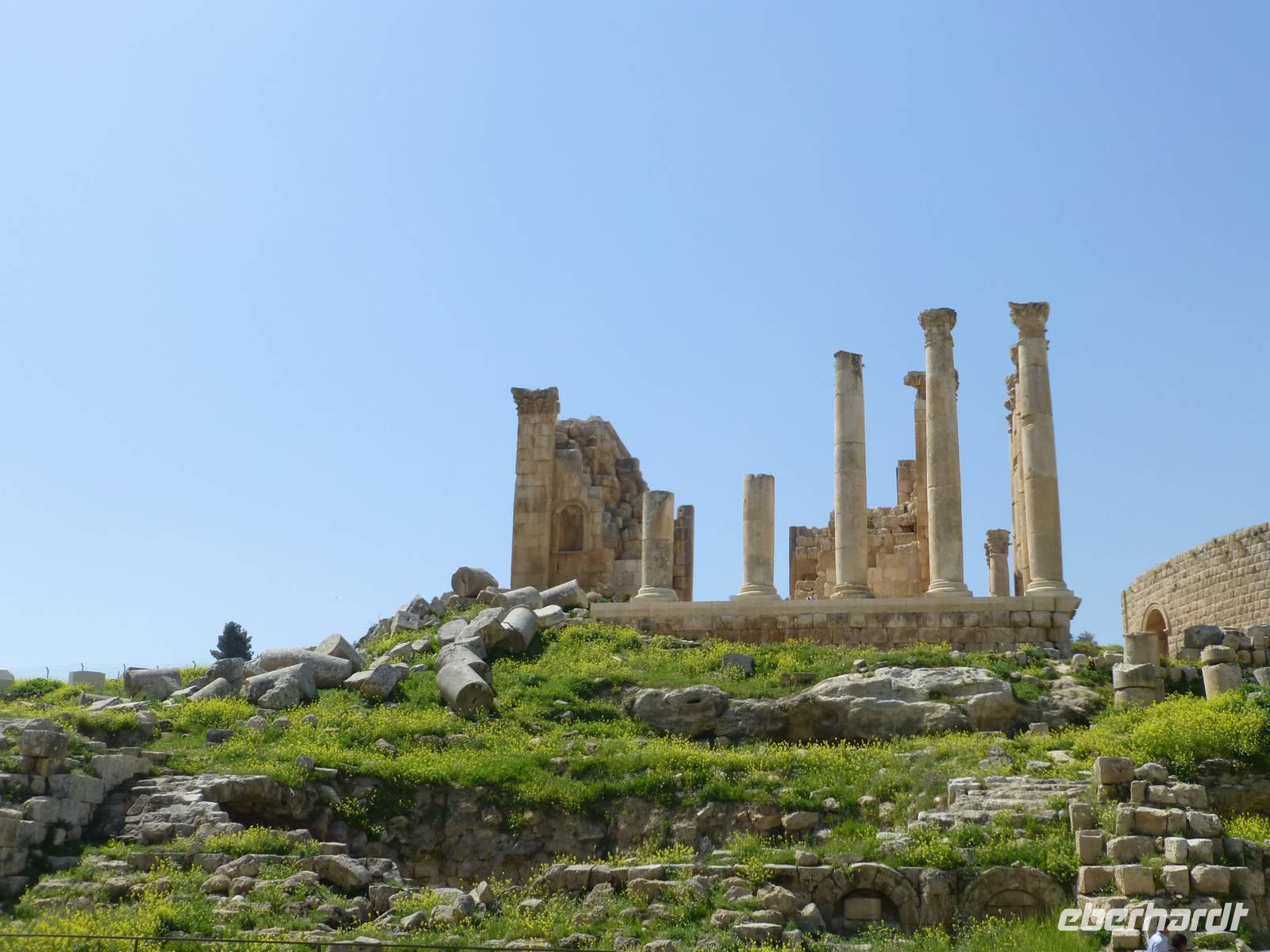Nach dem Frühstück fahren wir nach Ajlun und Jerash. Bis Ajlun dauert die Fahrt gute 1,5 h. Das Wetter ist, wie auch an allen anderen Tagen unserer Reise wieder sonnig. Kurz nach der Stadt Amman ändert sich die Landschaft, es gibt Wälder, zum Teil durch Aufforstung, aber auch natürliche. Zum Beispiel gibt es hier Steineichenwälder, Steineichen sind übrigens immergrüne Bäume. Später kommen Olivenbäume hinzu und auch immer wieder Flächen mit Grünland. Oberhalb der kleinen Stadt Ajlun befindet sich die islamische Burg Qalaat al-abad. Jordaniens einzige mittelalterliche Burg wurde im 12. Jh. errichtet um die Gegend vor den Kreuzfahrer zu sichern. Bauherr war ein Neffe des großen Sultans Saladin, Izz ed-Din Usama. Benötigt hat man die Festung allerdings nie, denn bereits drei Jahre nach ihrer Fertigstellung wurden das Kreuzfahrerheer 1187 in der Schlacht bei Hittin geschlagen. Die Kreuzfahrer bezeichnet man hier übrigens nicht als solche, man nennt sie Frankenritter. Nach ca. 45 Minuten Fahrt erreichen wir Jerash mit der bedeutendsten römischen Ausgrabung auf jordanischem Gebiet. Kaiser Hadrian rühmte sie „als die Stadt die alle Schönheiten in sich vereint". Und so ließ er sich auch gleich einen Triumphbogen bauen und dazu ein Hippodrom, eine Pferderennbahn. Wir treten am Südtor in die Stadt ein und gelangen als erstes zum ovalen Platz, so genannt weil er nicht rund ist. Beeindruckend wird er von Säulen umrahmt. Wir besuchen dann das Südtheater, welches sich neben dem Zeus-Tempel befindet. Hier erleben wir viel ausgelassene jordanische Jugendliche auf einem Schulausflug. Als dann noch eine kleine Dudelsackkapelle aufspielt tanzen einige der Mädchen dazu. Die Musiker sind pensionierte Militärmusiker, welche mit Genehmigung dort spielen dürfen. Der Dudelsack wurde 1917 beim Militär eingeführt, als zahlreiche Araber in den Truppen der britischen Armee in Transjordanien dienten. Frankreich und Großbritannien hatten sich 1916 in einem geheimen Vertrag über die Aufteilung der arabischen Staaten geeinigt und somit eigentlich neue Kolonien geschaffen. Der Dudelsack, welcher seinen Ursprung tatsächlich in den arabischen Ländern hat und über Spanien nach Schottland gekommen ist, erfreut sich hier im Land großer Beliebtheit. Keine Hochzeit ohne Dudelsackmusik und das kann ruhig auch schottische sein. Nach dem Ende des knapp zwei Stunden dauernden Rundgangs haben wir uns in einem nahen Restaurant eine Mittagspause verdient. Nach der Rückkehr ins Hotel unternehmen wir noch einen Spaziergang auf einer der Einkaufsstraßen der Stadt. Hier können wir am alltäglichen Leben der Ammaner etwas teilnehmen. Zu Abend essen wir wieder vom Buffet im Hotelrestaurant.