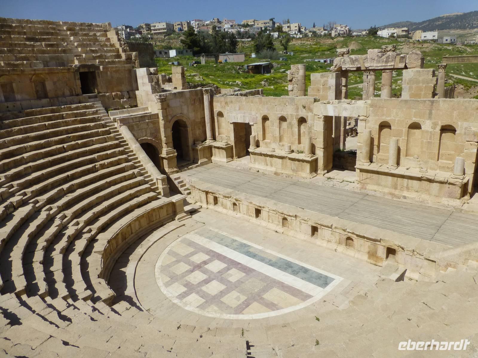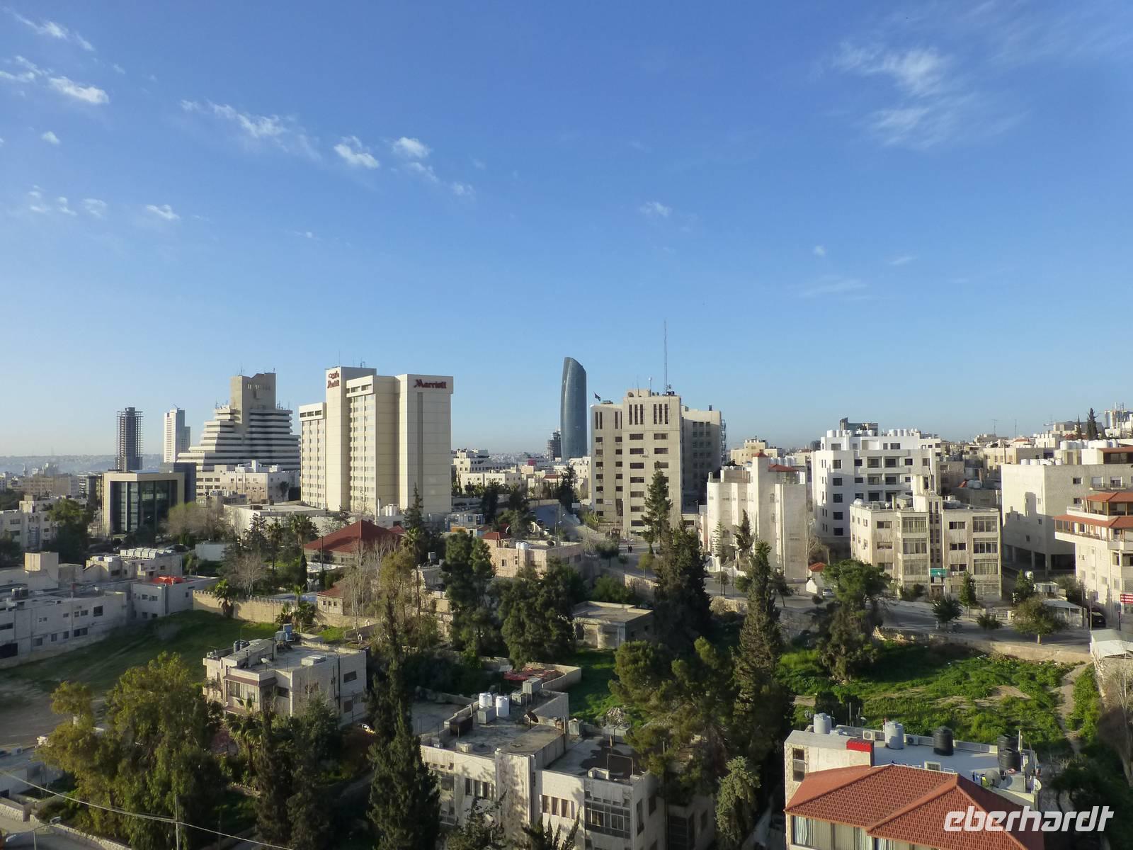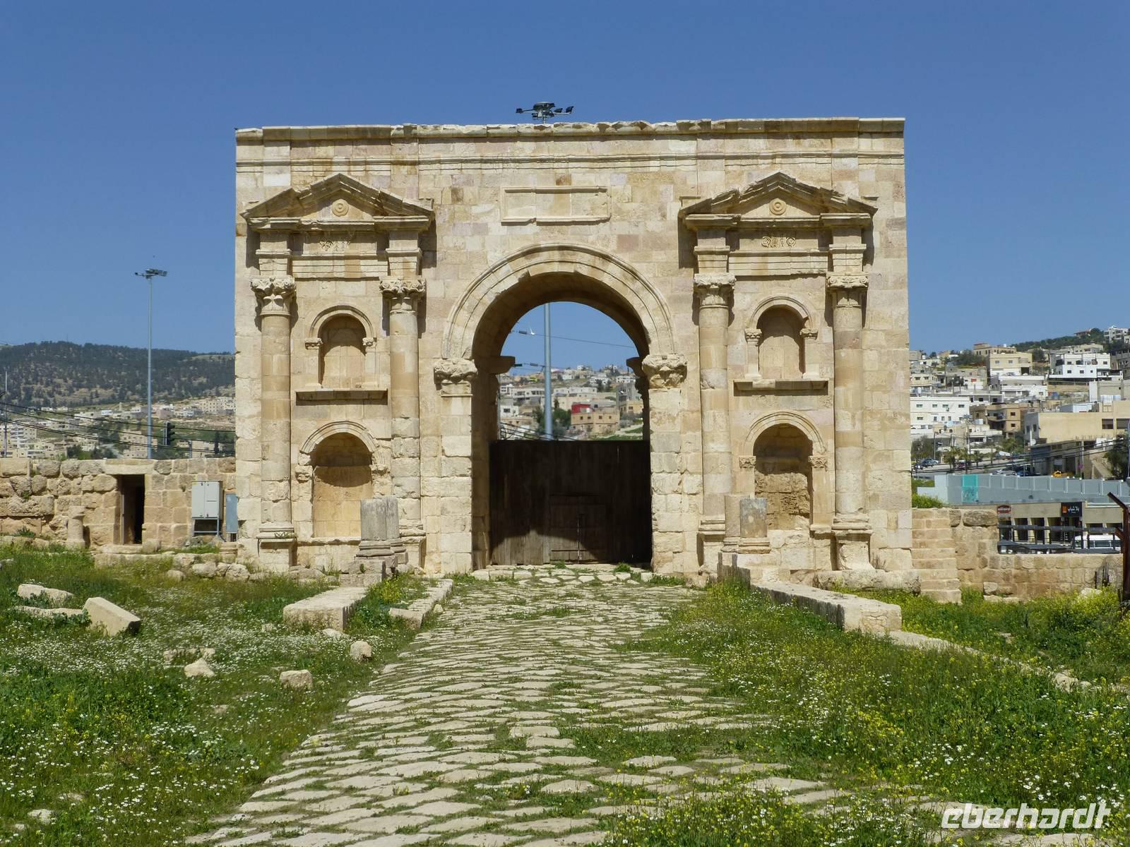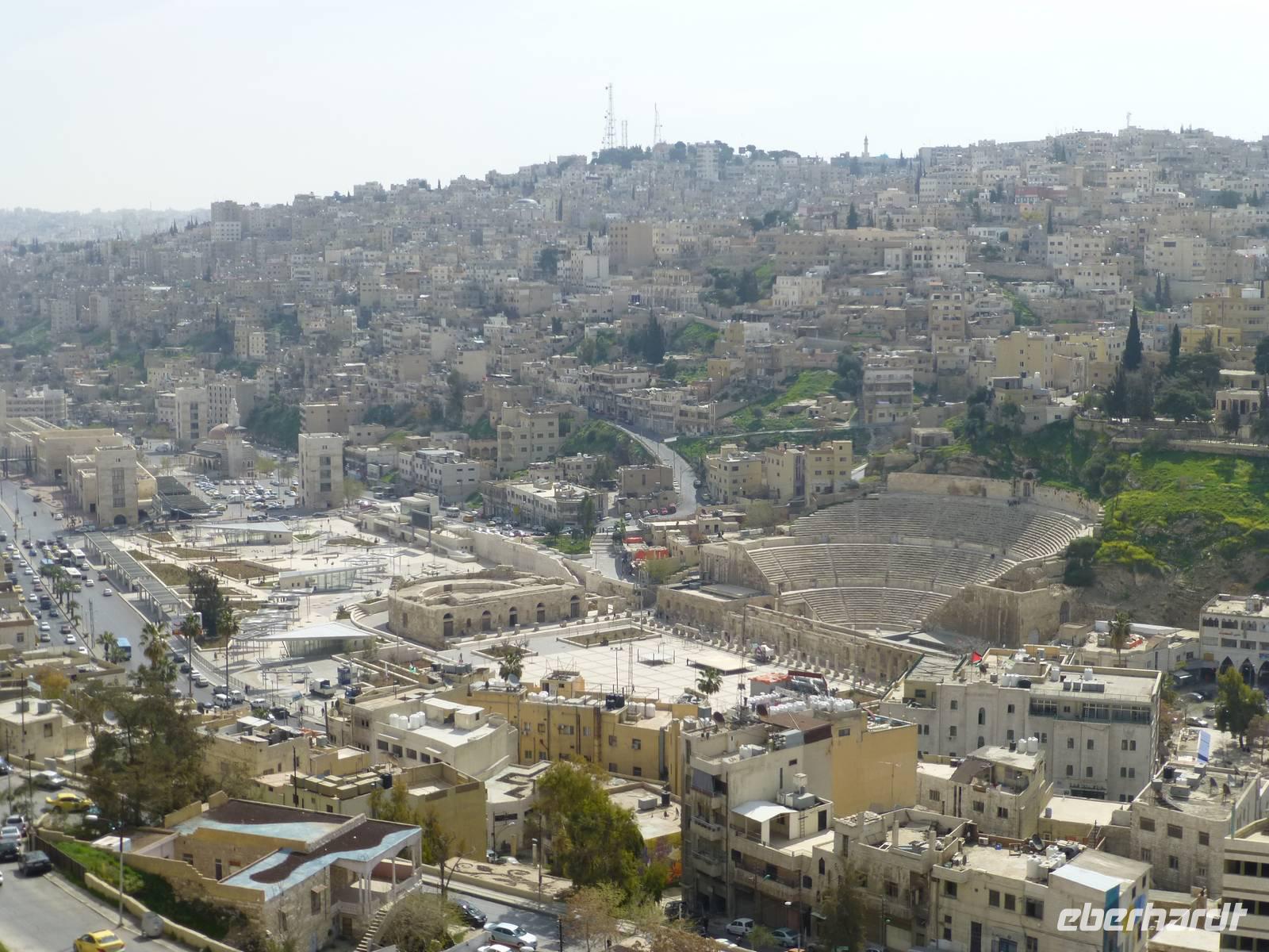 Nach dem Frühstück fahren wir nach Ajlun und Jerash. Bis Ajlun dauert die Fahrt gute 1,5 h. Das Wetter ist, wie auch an allen anderen Tagen unserer Reise wieder sonnig. Kurz nach der Stadt Amman ändert sich die Landschaft, es gibt Wälder, zum Teil durch Aufforstung, aber auch natürliche. Zum Beispiel gibt es hier Steineichenwälder, Steineichen sind übrigens immergrüne Bäume. Später kommen Olivenbäume hinzu und auch immer wieder Flächen mit Grünland. Oberhalb der kleinen Stadt Ajlun befindet sich die islamische Burg Qalaat al-abad. Jordaniens einzige mittelalterliche Burg wurde im 12. Jh. errichtet um die Gegend vor den Kreuzfahrer zu sichern. Bauherr war ein Neffe des großen Sultans Saladin, Izz ed-Din Usama. Benötigt hat man die Festung allerdings nie, denn bereits drei Jahre nach ihrer Fertigstellung wurden das Kreuzfahrerheer 1187 in der Schlacht bei Hittin geschlagen. Die Kreuzfahrer bezeichnet man hier übrigens nicht als solche, man nennt sie Frankenritter. Nach ca. 45 Minuten Fahrt erreichen wir Jerash mit der bedeutendsten römischen Ausgrabung auf jordanischem Gebiet. Kaiser Hadrian rühmte sie „als die Stadt die alle Schönheiten in sich vereint". Und so ließ er sich auch gleich einen Triumphbogen bauen und dazu ein Hippodrom, eine Pferderennbahn. Wir treten am Südtor in die Stadt ein und gelangen als erstes zum ovalen Platz, so genannt weil er nicht rund ist. Beeindruckend wird er von Säulen umrahmt. Wir besuchen dann das Südtheater, welches sich neben dem Zeus-Tempel befindet. Hier erleben wir viel ausgelassene jordanische Jugendliche auf einem Schulausflug. Als dann noch eine kleine Dudelsackkapelle aufspielt tanzen einige der Mädchen dazu. Die Musiker sind pensionierte Militärmusiker, welche mit Genehmigung dort spielen dürfen. Der Dudelsack wurde 1917 beim Militär eingeführt, als zahlreiche Araber in den Truppen der britischen Armee in Transjordanien dienten. Frankreich und Großbritannien hatten sich 1916 in einem geheimen Vertrag über die Aufteilung der arabischen Staaten geeinigt und somit eigentlich neue Kolonien geschaffen. Der Dudelsack, welcher seinen Ursprung tatsächlich in den arabischen Ländern hat und über Spanien nach Schottland gekommen ist, erfreut sich hier im Land großer Beliebtheit. Keine Hochzeit ohne Dudelsackmusik und das kann ruhig auch schottische sein. Nach dem Ende des knapp zwei Stunden dauernden Rundgangs haben wir uns in einem nahen Restaurant eine Mittagspause verdient. Nach der Rückkehr ins Hotel unternehmen wir noch einen Spaziergang auf einer der Einkaufsstraßen der Stadt. Hier können wir am alltäglichen Leben der Ammaner etwas teilnehmen. Zu Abend essen wir wieder vom Buffet im Hotelrestaurant.