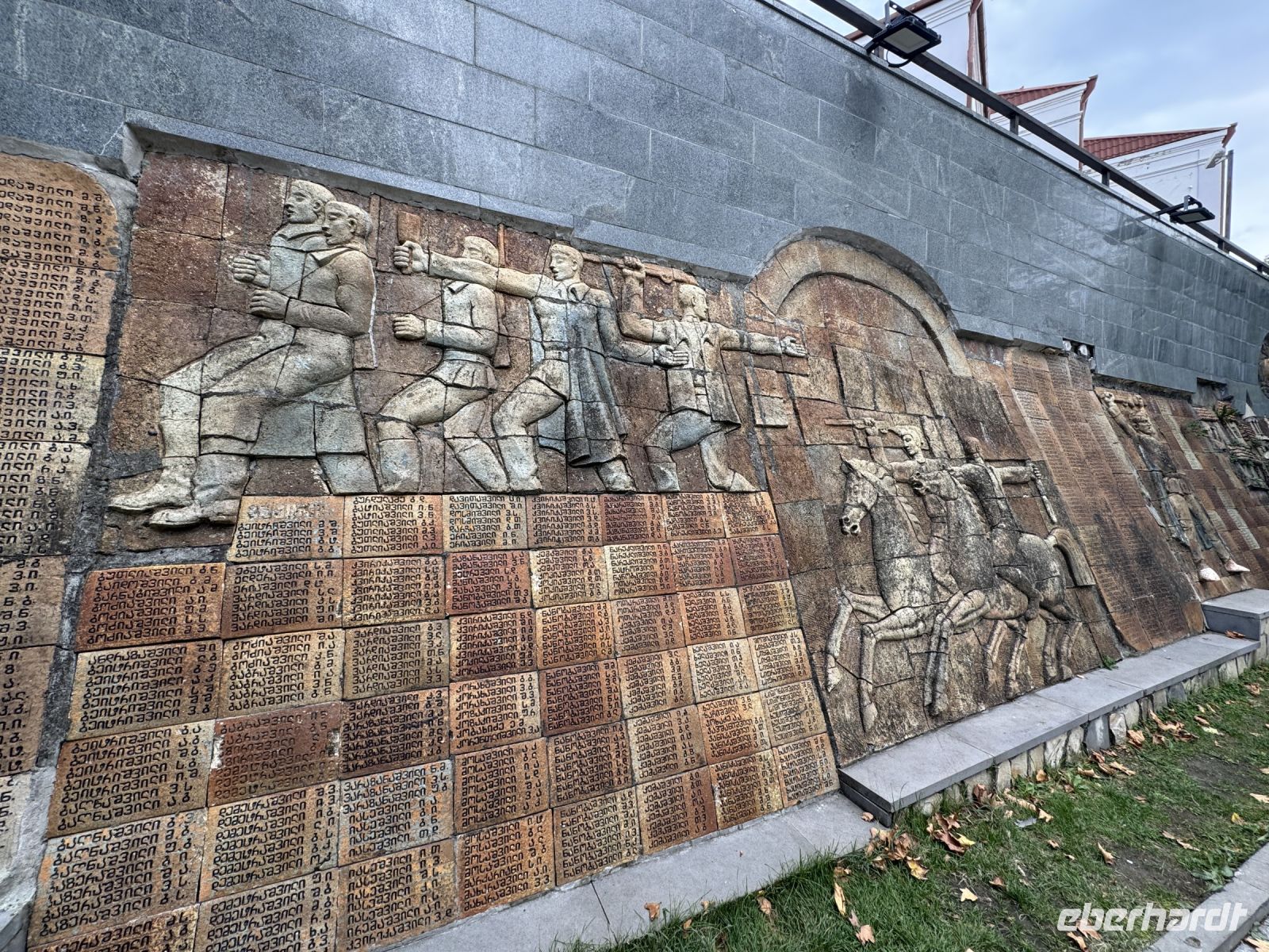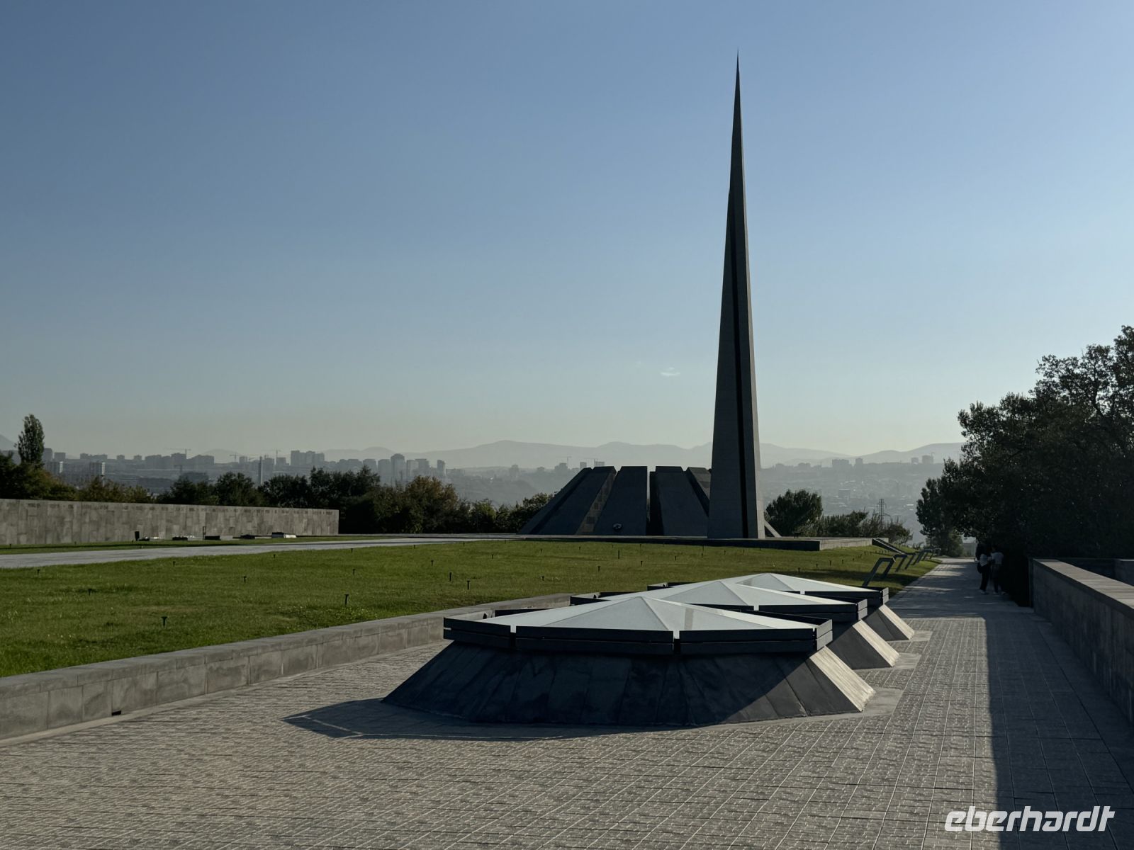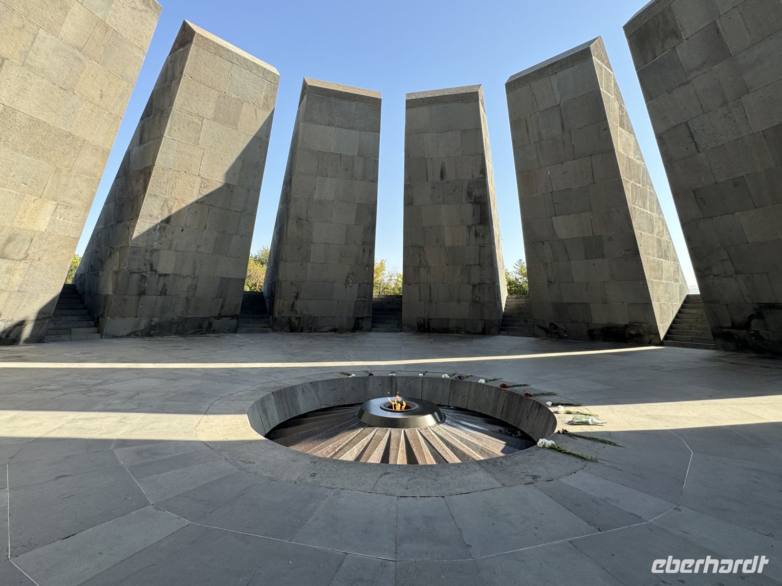 Wir beginnen unsere Stadtbesichtigung mit einer Stadtrundfahrt. Unser Bus bringt uns hoch über die Stadt zum Denkmals Tsitsernakaberd- der Gedenkstätte für die Opfer des Völkermordes von 1915. Wir besichtigen auch das dazugehörige Museum. Leider ist an diesem Tage keine gute Sicht, so dass der Berg Ararat in der Ferne nur zu erahnen ist. Unsere Fahrt führt uns danach in die weltbekannte Brandy Factory "Ararat", die an der Stelle der ehemaligen Hin Erivan Festung erbaut worden war. Sciustov hat, durch seine hohe Qualität, die Erlaubnis bekommen anstelle von "Cognac", "Brandy" auf den Flaschen zu schreiben. Bei einem Rundgang im Keller der Fabrik, wo der Kognak aufbewahrt wird, erfuhren wir vieles über die Herstellung, Lagerung und Reifung des gern verabreichten Getränkes.