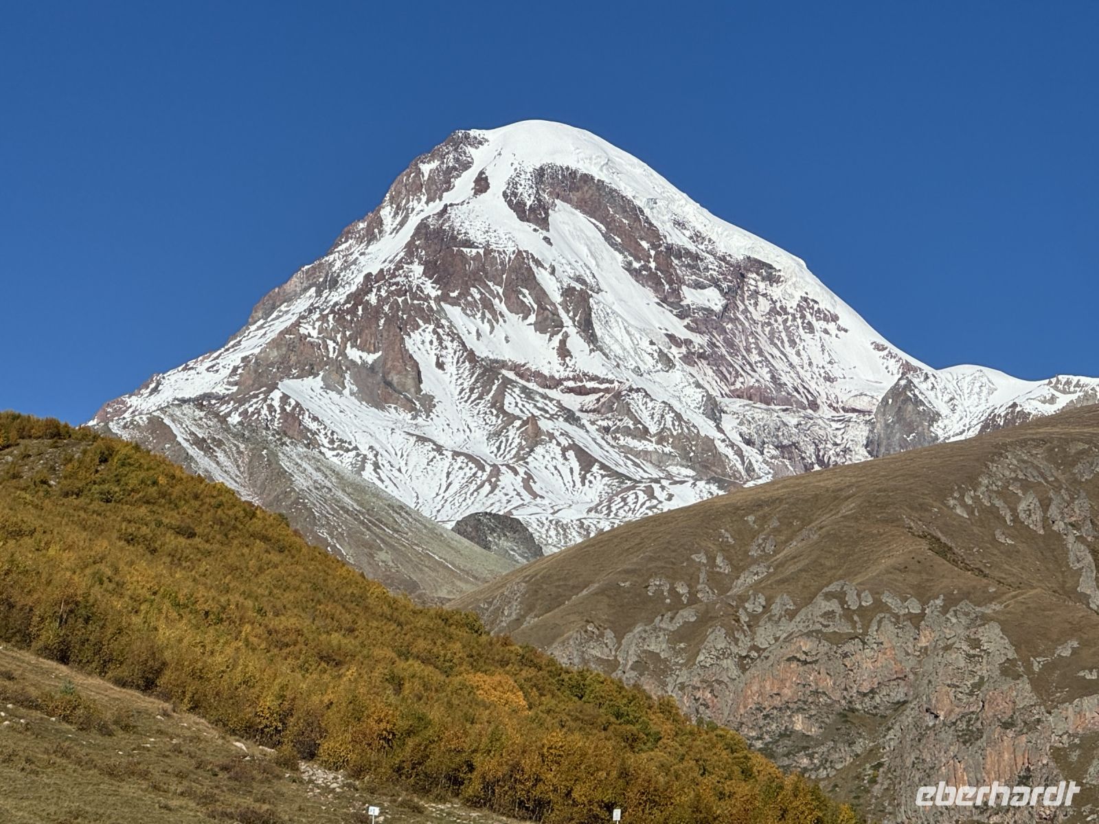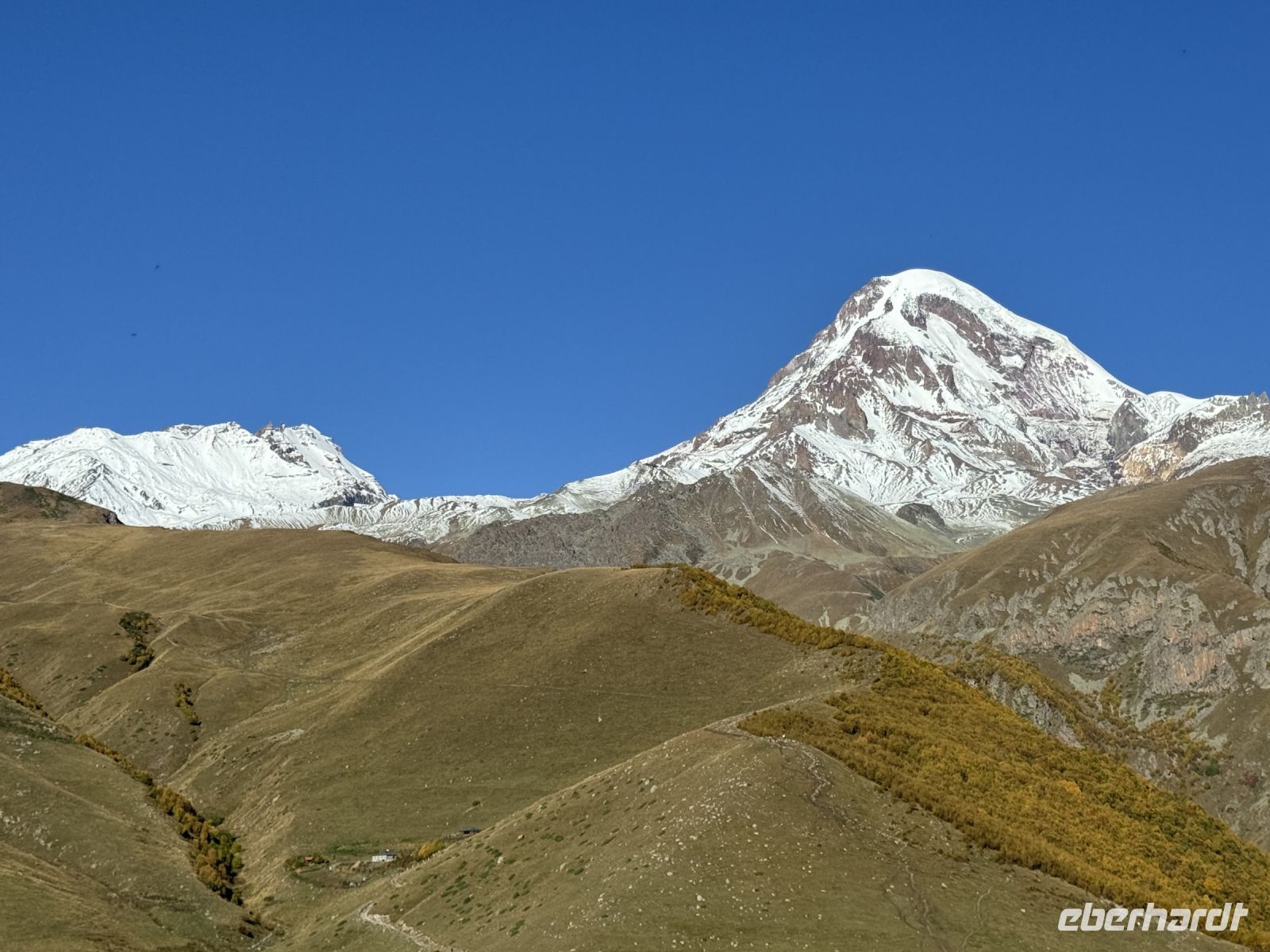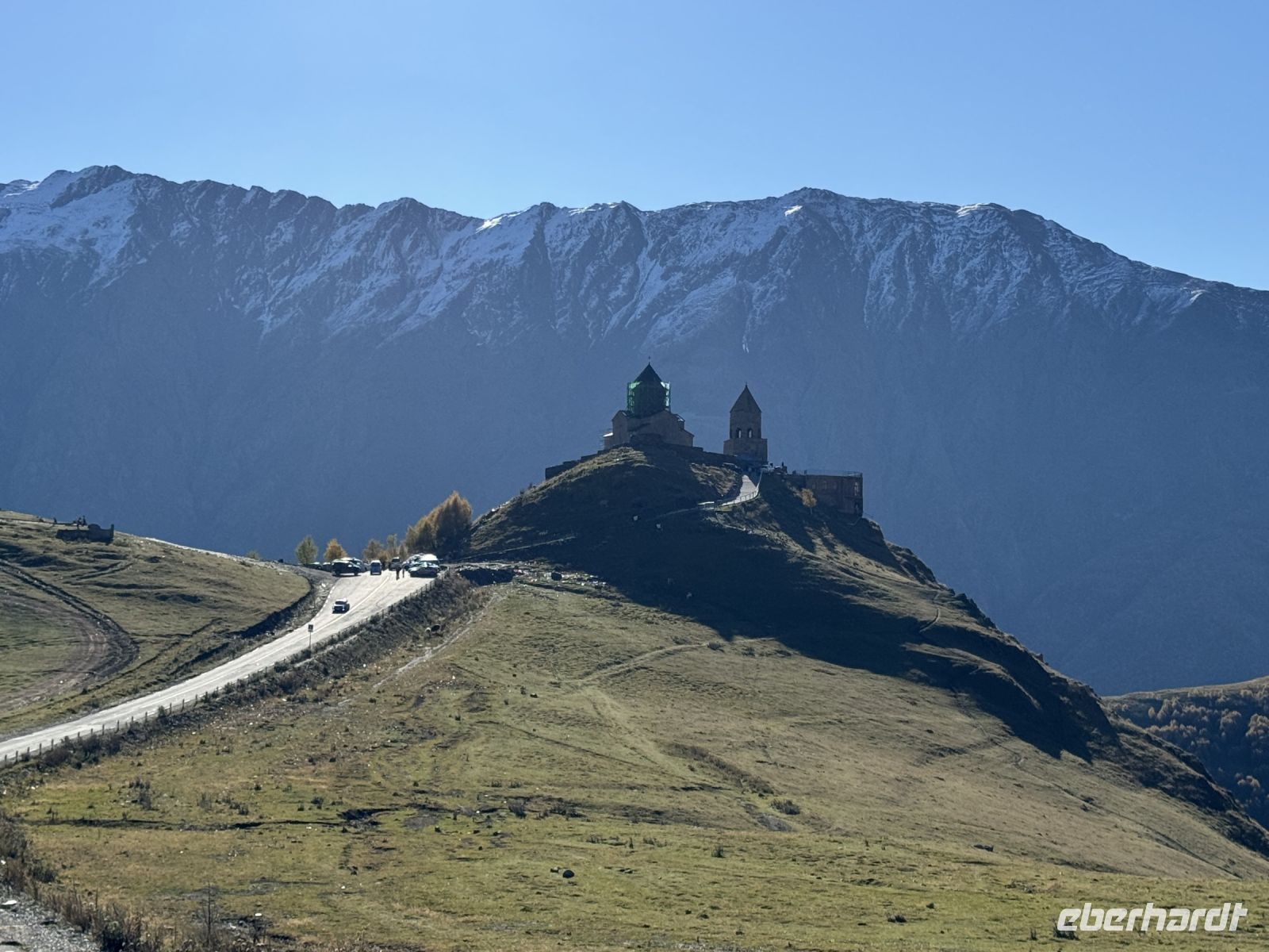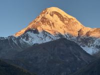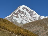 Kasbegi liegt am Fuße des dritthöchsten Gipfels in Georgien dem Kasbek (Mkinwartsweri) mit 5.047 Meter Höhe direkt an der Grenze zu Russland in einer wunderschönen, wilden Landschaft. Diese lernten wir bei einer Fahrt mit dem Geländewagen bei herrlichem Wetter, mit wolkenfreiem Himmel, näher kennen. Wir fuhren zur Gergeti-Dreifaltigkeitskirche, einem Monument aus dem XIV. Jahrhundert, das Jahrhunderte überlebt hat und dazu diente georgische Relikte zu bewahren.