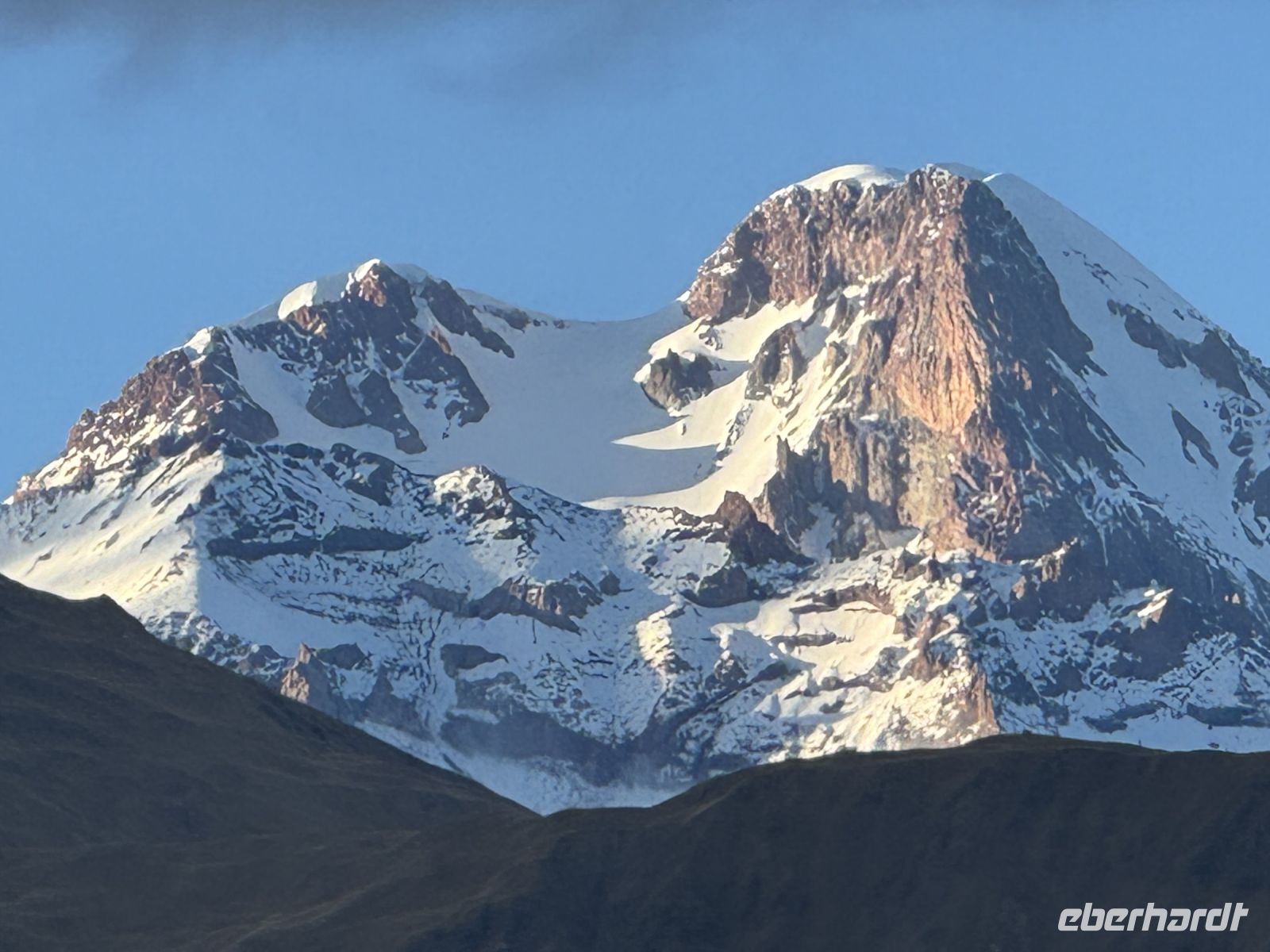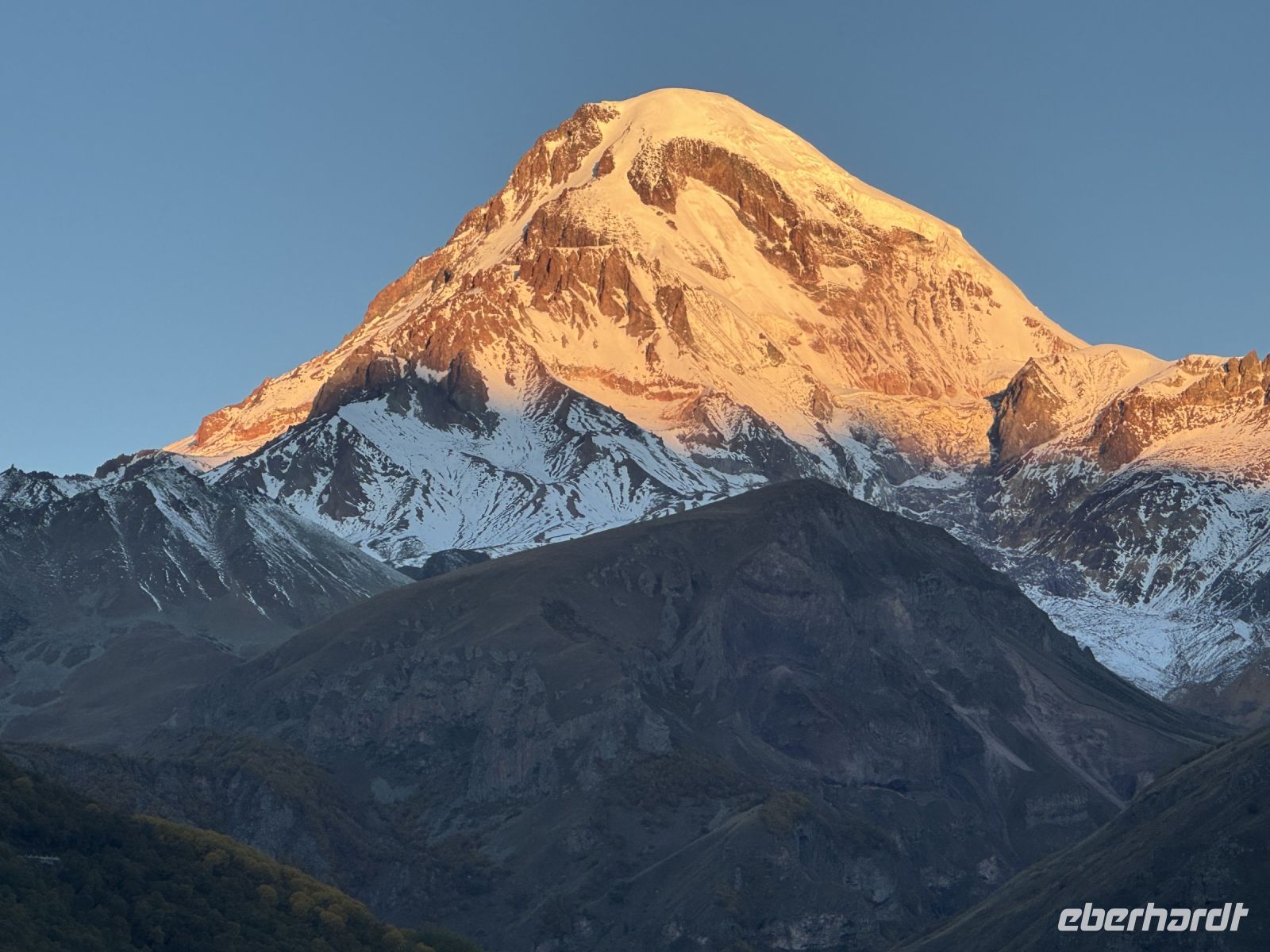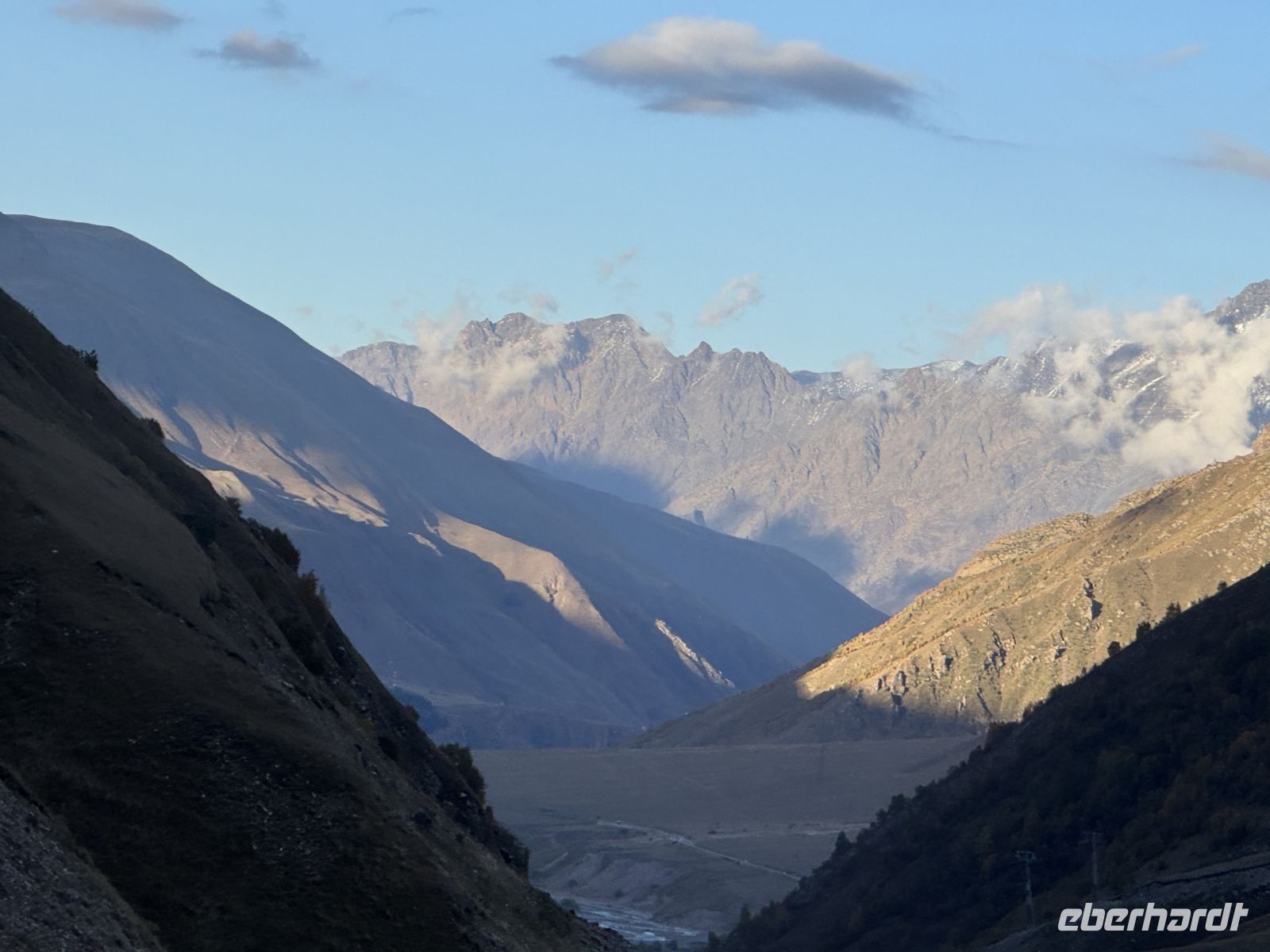 Kasbegi liegt am Fuße des dritthöchsten Gipfels in Georgien dem Kasbek (Mkinwartsweri) mit 5.047 Meter Höhe direkt an der Grenze zu Russland in einer wunderschönen, wilden Landschaft. Diese lernten wir bei einer Fahrt mit dem Geländewagen bei herrlichem Wetter, mit wolkenfreiem Himmel, näher kennen. Wir fuhren zur Gergeti-Dreifaltigkeitskirche, einem Monument aus dem XIV. Jahrhundert, das Jahrhunderte überlebt hat und dazu diente georgische Relikte zu bewahren.