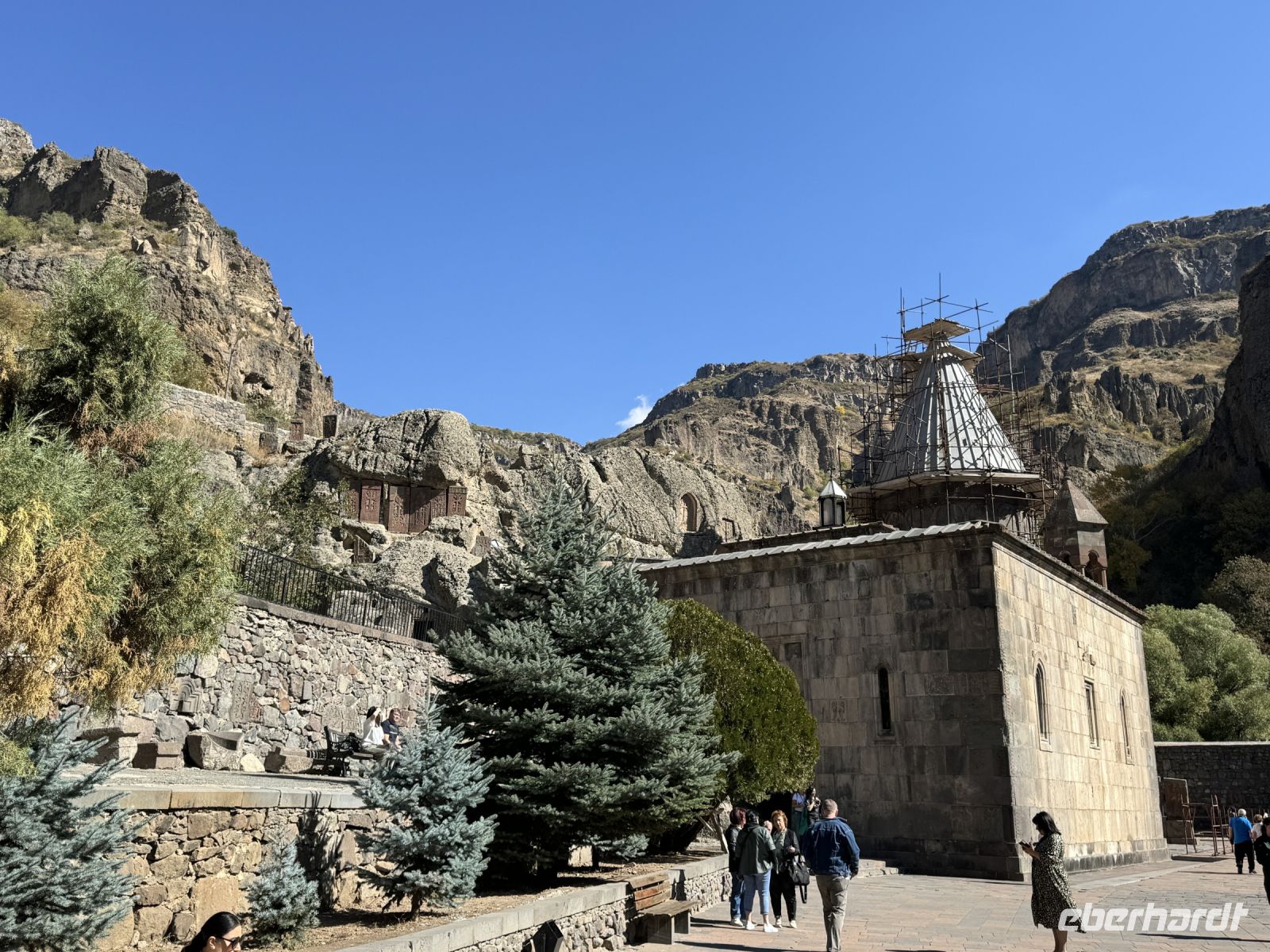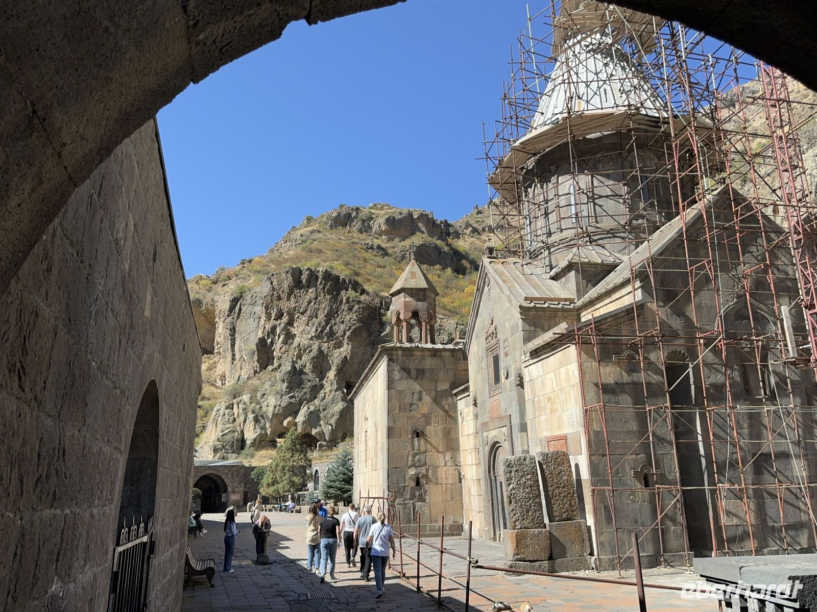 Wir starteten unsere Tour mit einer Fahrt in Richtung Garni. Bei einem Zwischenstopp haben wir bei guter Sicht einen wunderbaren Blick auf den Ararat. Danach besuchen wir den einzig erhalten gebliebenen heidnischen Tempels Garni. Dieser heidnische Tempel wurde im 1. Jahrhundert nach Christus erbaut. Es ist der einzige Tempel, der aus den heidnischen Zeiten in Armenien erhalten geblieben ist. Die Fahrt geht weiter zum Kloster Geghard, wieder ein UNESCO-Weltkulturerbe. Sein Name stammt aus der legendären Lanze, die verwendet wurde, um den Leib Christi zu durchbohren. Das Kloster gehört zu den bedeutenden Zeugnissen der armenischen Apostolischen Kirche.