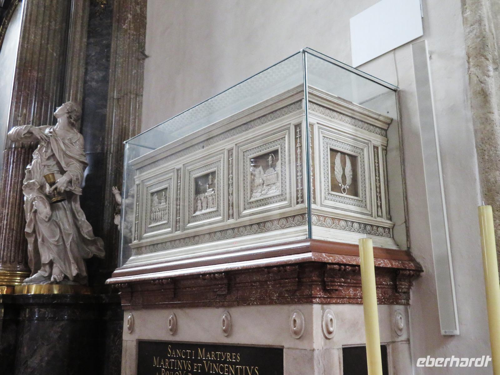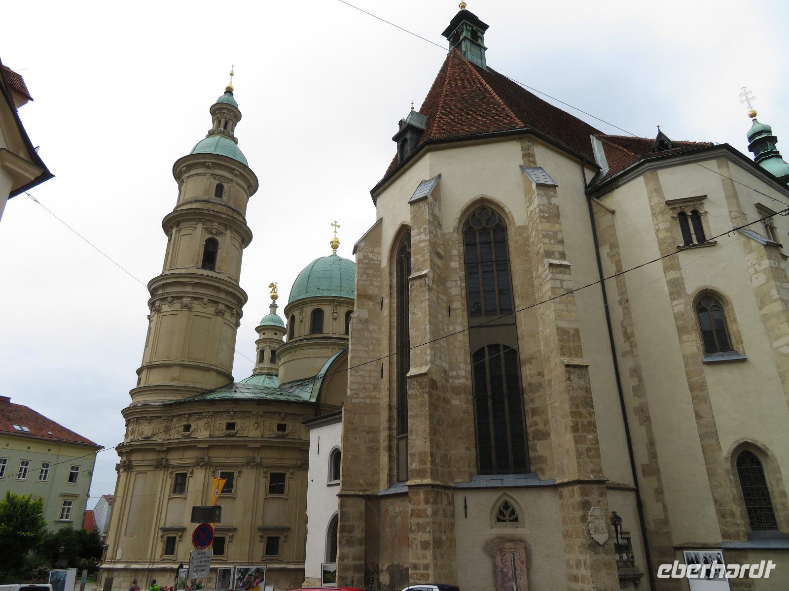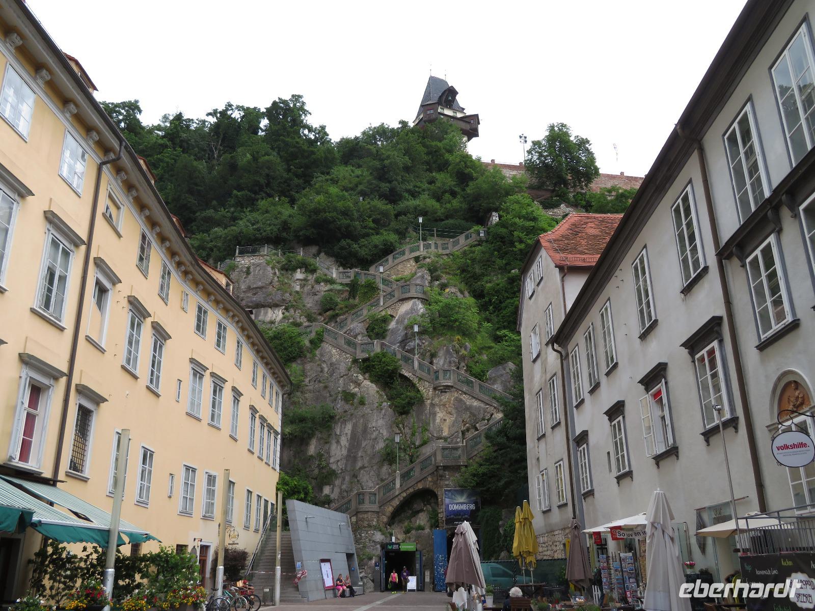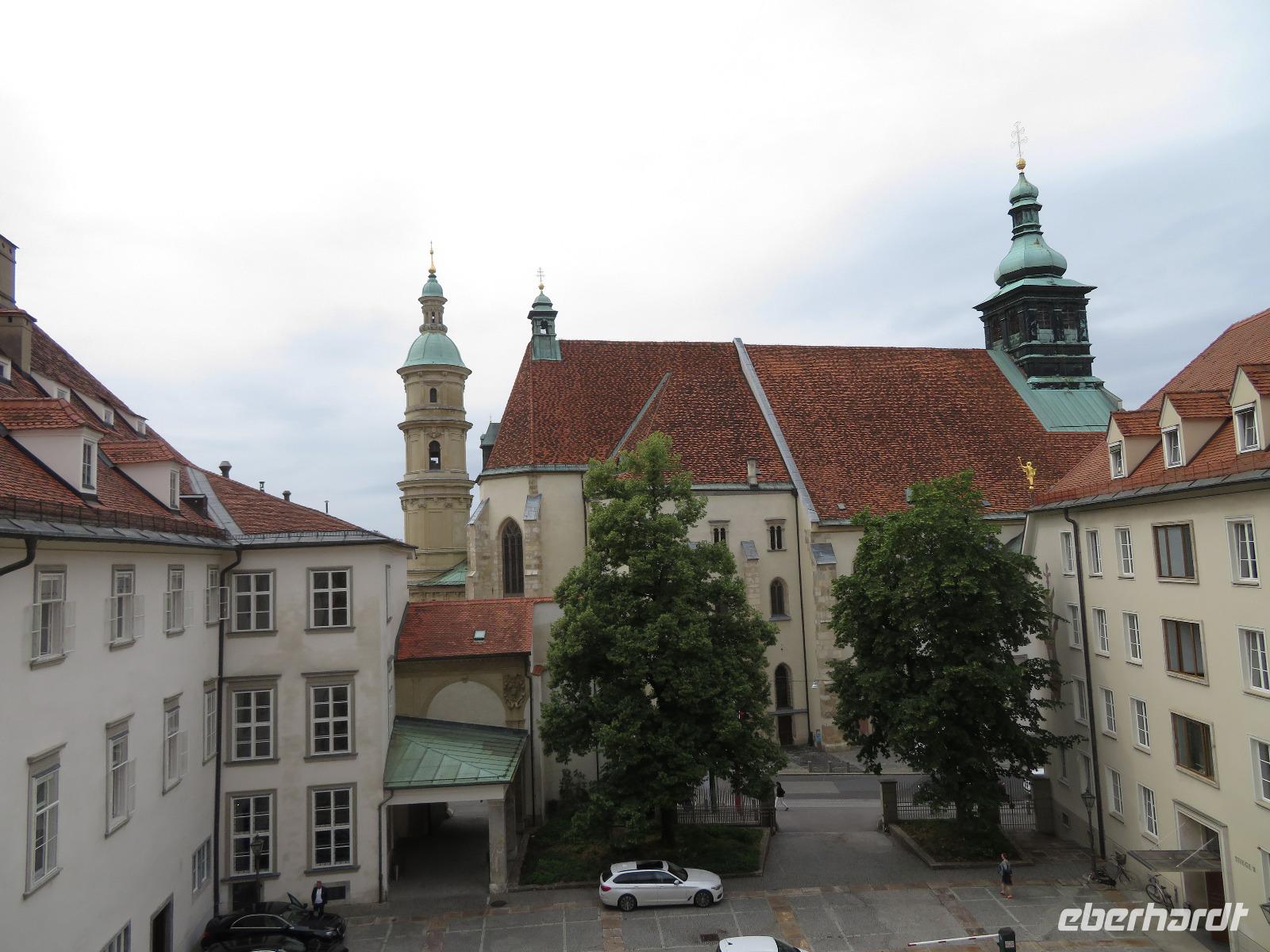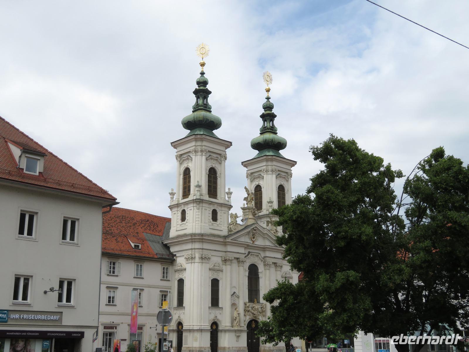 Am Morgen nach dem Frühstück fuhren wir nach Graz. Das Wetter war vielversprechend. Es hatte nun ein bisschen abgekühlt und war nur bewölkt. Wir stiegen am Künstlerhaus im Zentrum der Stadt aus. Man sah schon ein paar umgestürzte Bäume im Stadtpark liegen. Dieser sowie der Schlossberg war leider gesperrt worden, da einen Tag zuvor ein verehrendes Unwetter die Hauptstadt der Steiermark heimsuchte. Dabei gab es Tote und Verletzte. Daher mussten wir auf die Eindrücke ders Schlossberges und des Parks verzichten. Aber die Stadt hatte ja noch so einiges mehr zu bieten. Als erstes besuchten wir die Burg mit der Grazer Doppelwendeltreppe. Im Anschluss dann die Domkirche zum Heiligen Ägydius. Als besonders kostbar und schmuckvoll gelten zwei Reliquienschreine, die in dem Dom ausgestellt werden. Die zwei Truhen sind mit Elfenbein verziert und haben je drei bildliche Darstellungen, die in der Reihenfolge immer das vorhergehende Übertreffen, beziehungsweise besiegen: Liebe, Keuschheit, Tod, Ehre, Zeit, Glaube. Jedes Bildnis triumphiert über das vorherige. Demnach ist der Glaube das höchste dieser Elemente.