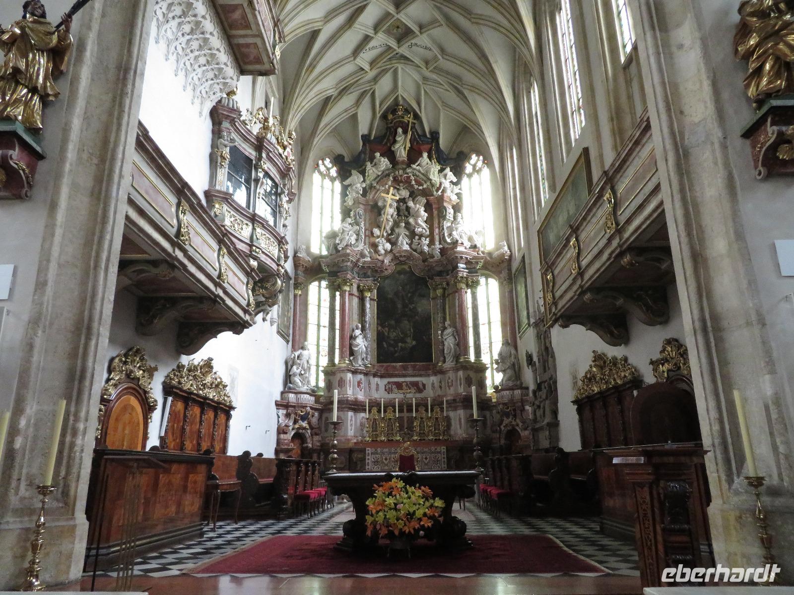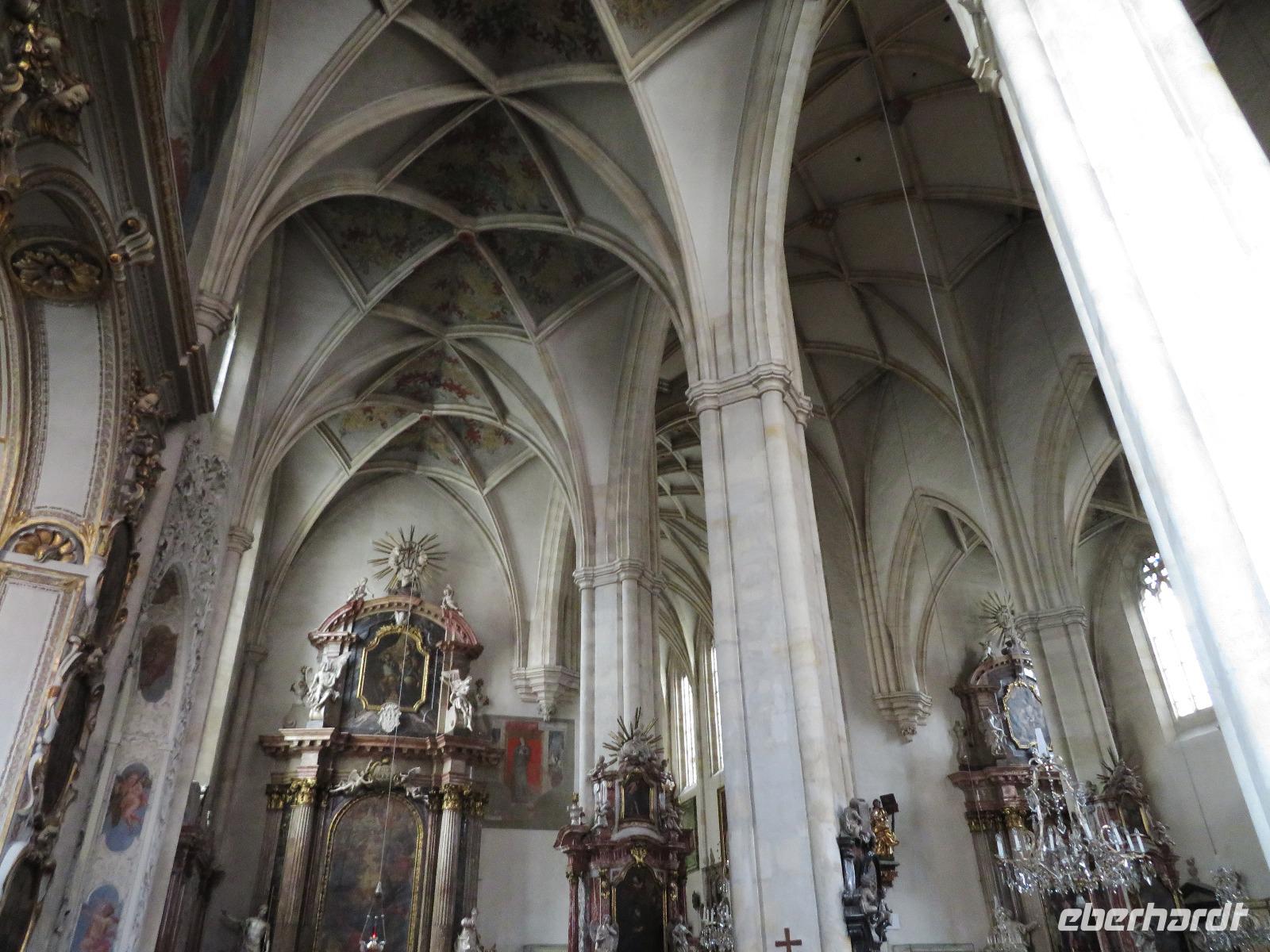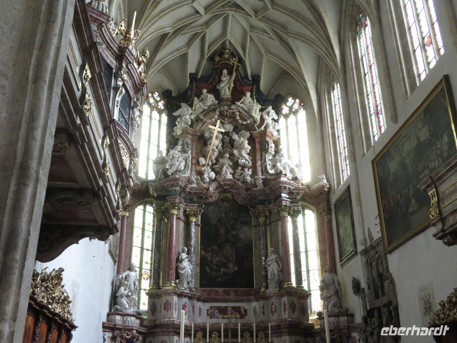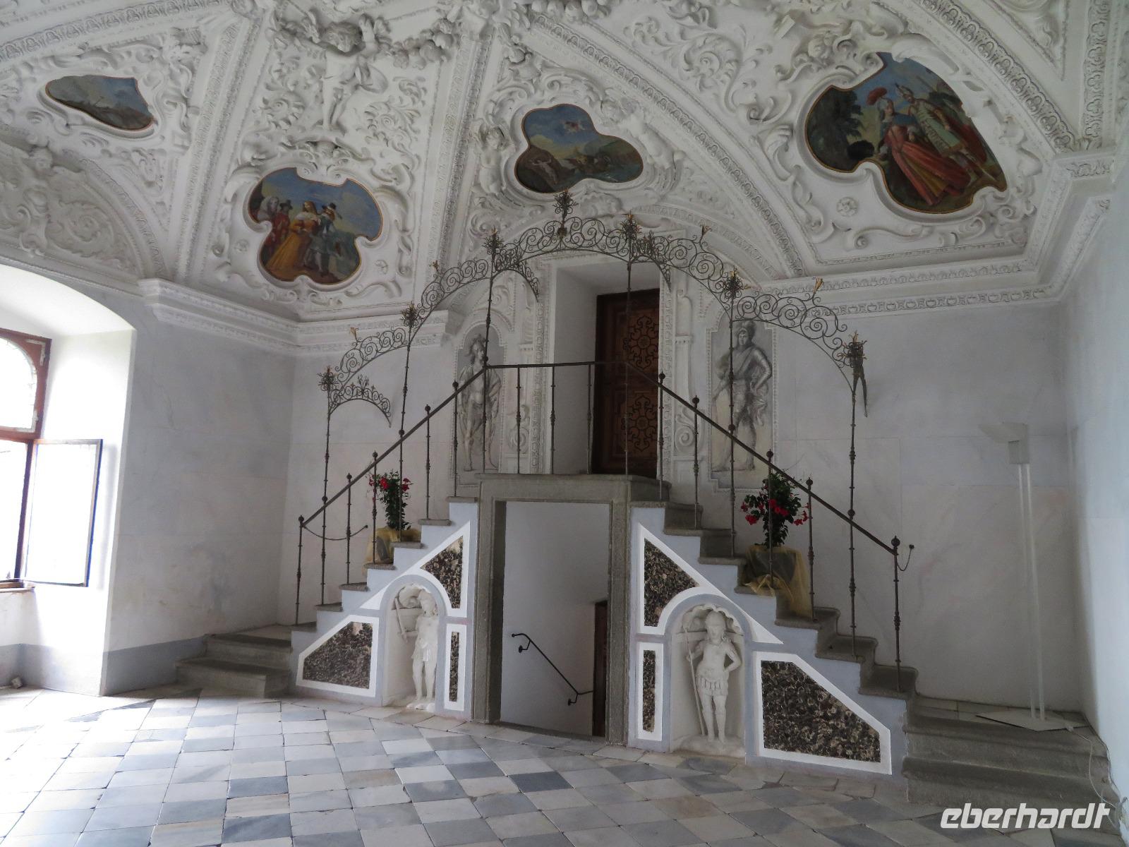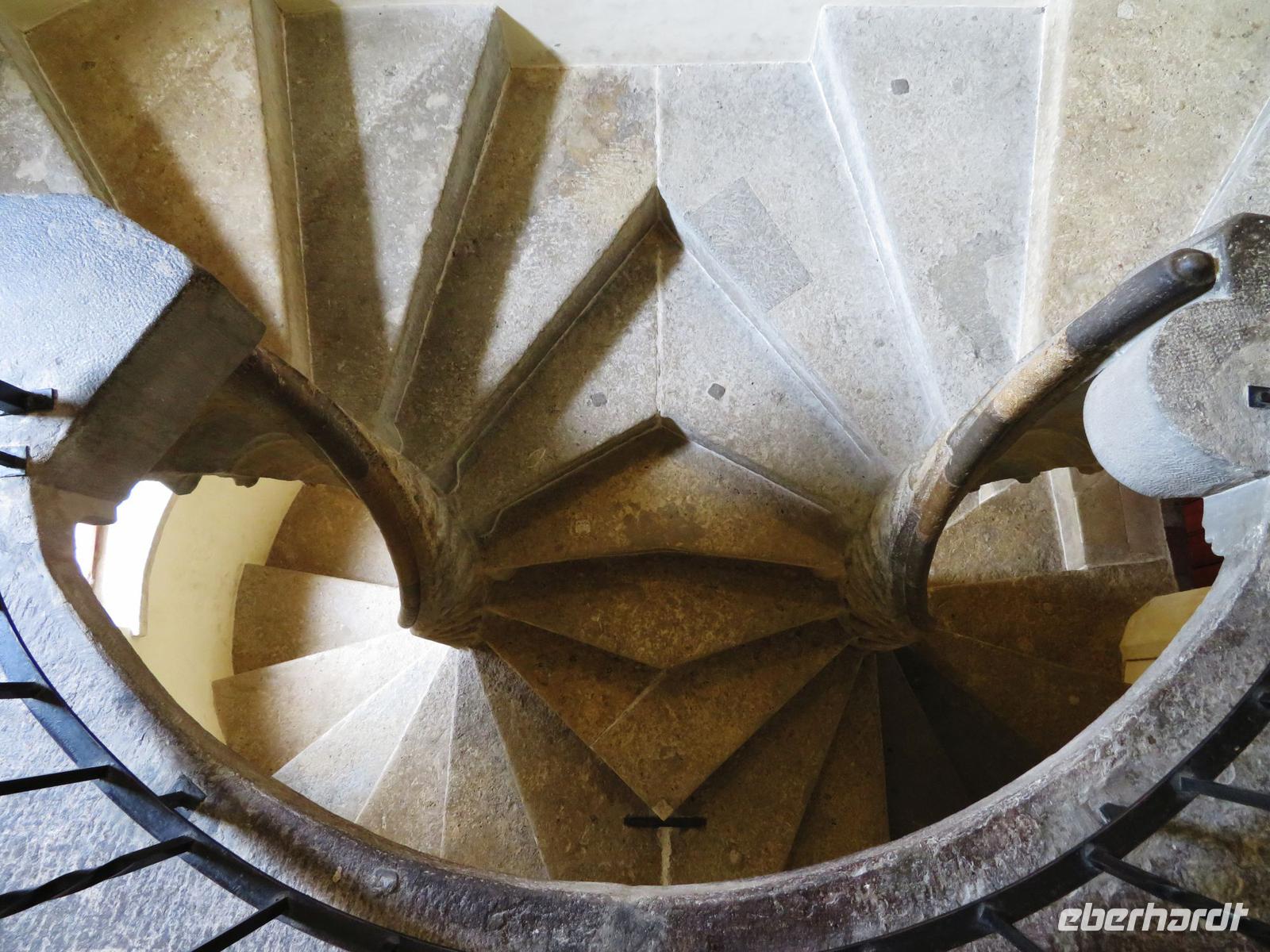Am Morgen nach dem Frühstück fuhren wir nach Graz. Das Wetter war vielversprechend. Es hatte nun ein bisschen abgekühlt und war nur bewölkt. Wir stiegen am Künstlerhaus im Zentrum der Stadt aus. Man sah schon ein paar umgestürzte Bäume im Stadtpark liegen. Dieser sowie der Schlossberg war leider gesperrt worden, da einen Tag zuvor ein verehrendes Unwetter die Hauptstadt der Steiermark heimsuchte. Dabei gab es Tote und Verletzte. Daher mussten wir auf die Eindrücke ders Schlossberges und des Parks verzichten. Aber die Stadt hatte ja noch so einiges mehr zu bieten. Als erstes besuchten wir die Burg mit der Grazer Doppelwendeltreppe. Im Anschluss dann die Domkirche zum Heiligen Ägydius. Als besonders kostbar und schmuckvoll gelten zwei Reliquienschreine, die in dem Dom ausgestellt werden. Die zwei Truhen sind mit Elfenbein verziert und haben je drei bildliche Darstellungen, die in der Reihenfolge immer das vorhergehende Übertreffen, beziehungsweise besiegen: Liebe, Keuschheit, Tod, Ehre, Zeit, Glaube. Jedes Bildnis triumphiert über das vorherige. Demnach ist der Glaube das höchste dieser Elemente.