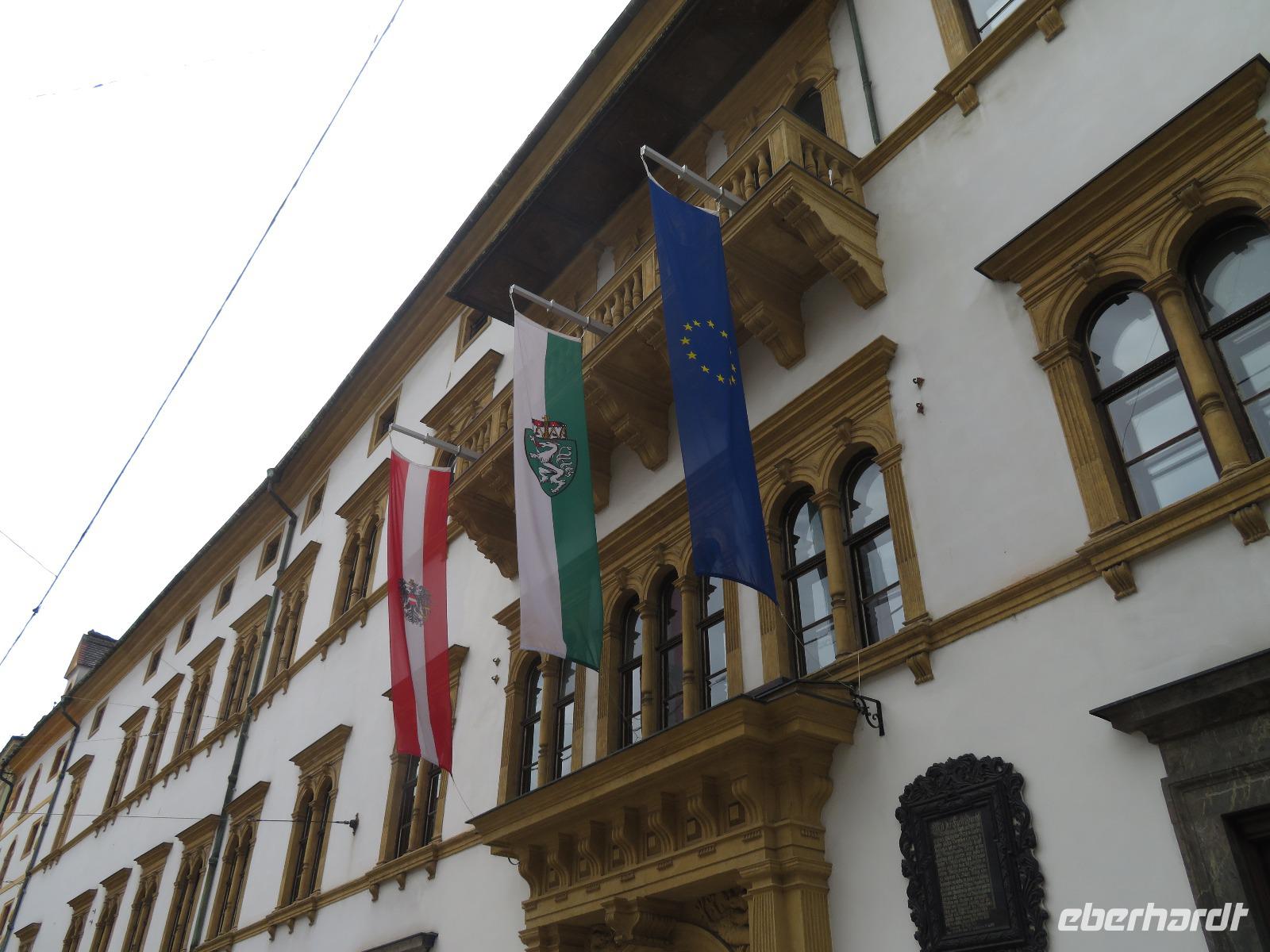 Von dort schlenderten wir weiter die Hofgasse hinunter und kamen an der Hofbäckerei Edegger-Tax mit unglaublich verzierter Ladenfassade und dem ehemaligen Haus des Deutschritter Ordens aus dem 17. Jahrhundert. Über die Sporgasse gelangten wir zum Hauptplatz. Wir sahen den Landtag der Steiermark, der im oberitalienischen Renaissance Stil erbaut wurde. Durch das Grazer Landhaus hindurch kehrten wir zu Hauptplatz mit dem Erzherzog-Johan-Brunnen zurück und gingen zum Schlossbergplatz. So hatten wir das Wahrzeichen von Graz wenigstens einmal von unten gesehen. Auf dem Weg dorthin kamen wir auch am Geburtshaus von Thronfolger und Erzherzog Franz Ferdinand vorbei. Er wurde im Dezember 1863 geboren und ging mit seiner Ermordung am 28. Juni 1914 in Sarajewo in die Geschichte ein. Zum Abschluss des Stadtrundganges überquerten wir die Mur nahe der Murinsel und endeten am Kunsthaus Graz.