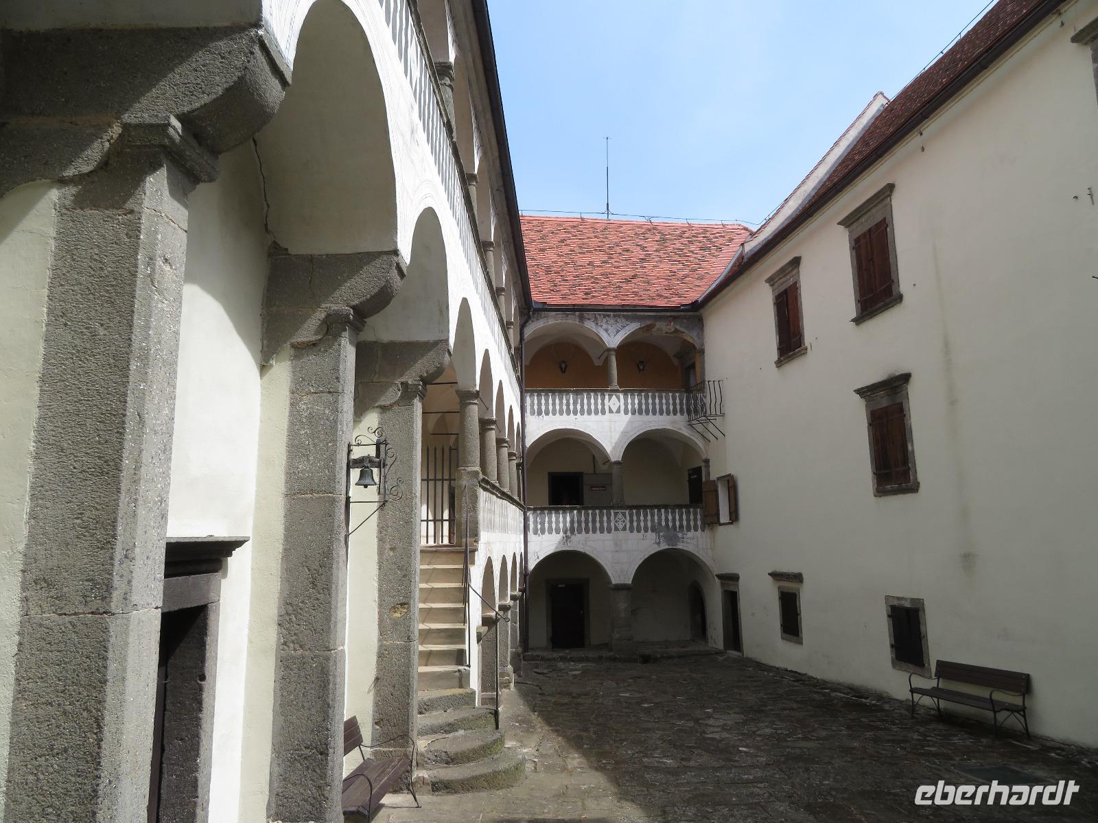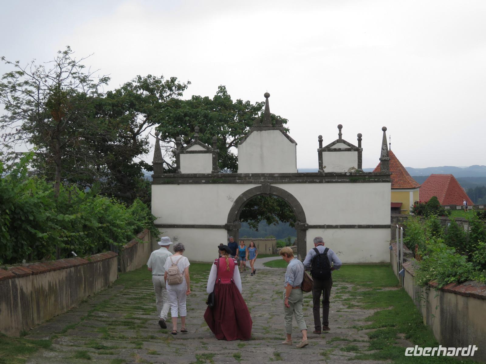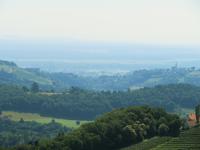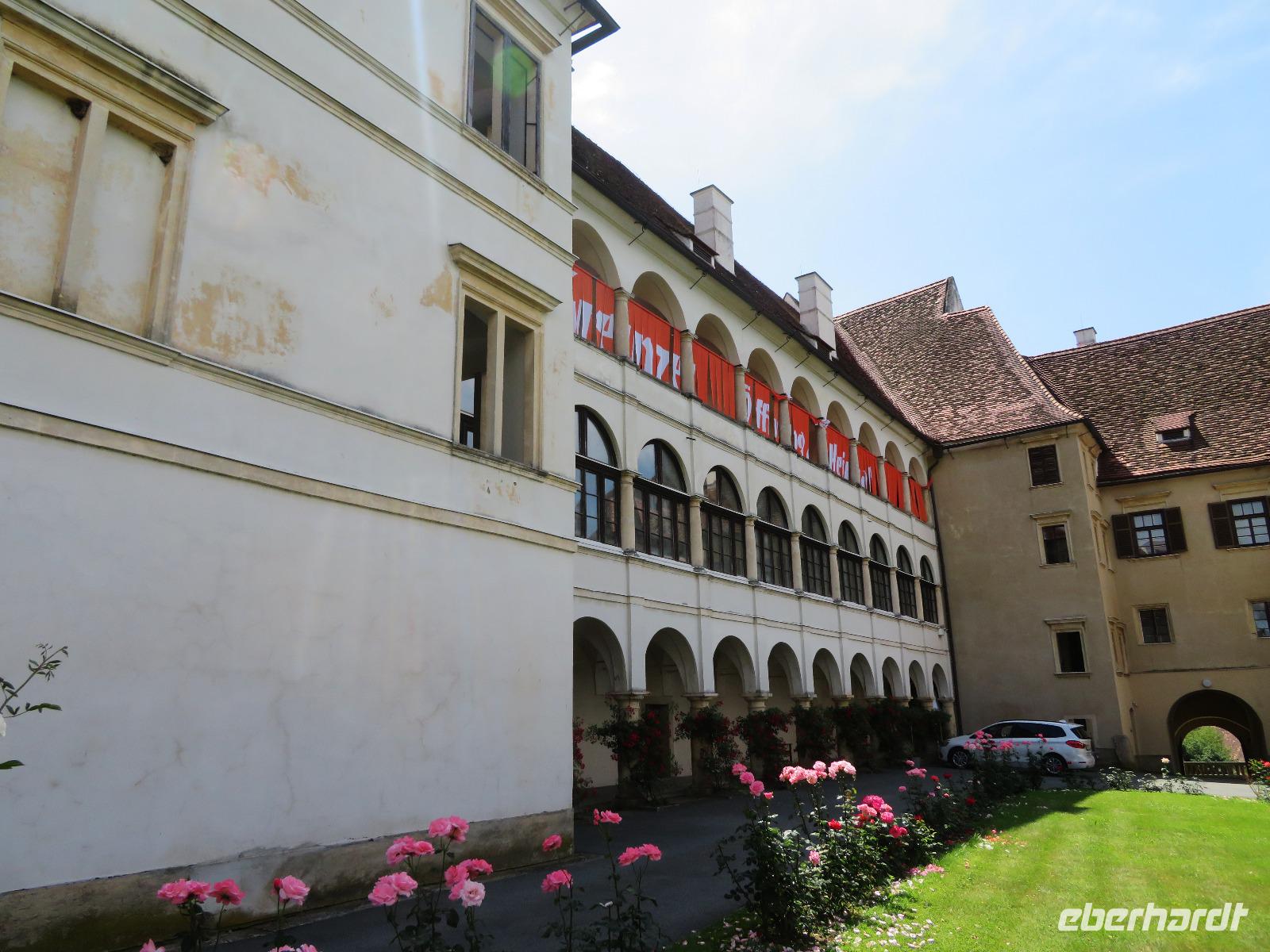 Am Morgen fuhren wir von unserem Hügel hinunter über das Land im Sulmtal. Es ging durch St. Martin im Sulmtal, Gleinstätten, bis nach Kitzeck im Sausal. Die 1.200 Seelengemeinde zählt zum Bezirk Leibnitz und liegt auf gut 560 Metern. Nahe der Kirche hatten wir einen hervorragenden Blick ins Tal. Die weichen Hügel gleiteten über den Horizont. Sie sind mit Weinreben bepflanzt. Nach dieser morgendlichen Runde fuhren zum Schloss Seggau. Daz Schloss hat seine Wurzeln im Anfang des 13. Jahrhunderts und wurde seit dem immer wieder seinen Herrschern angepasst. Zu Beginn waren drei Burgen nebeneinander die später zu einer geschlossen wurden. Zum Schloss werden 766 Hektar Schloss-Ländereien gezählt. Schloss Seggau war bis Ende des 18. Jahrhunderts Repräsentationssitz der steirischen Bischöfe und sogar bis ins 20. Jahrhundert Sommerresidenz. Wir besichtigten die barocken Fürstenzimmer im zweiten Obergeschoss und sahen uns ihre Gemälde an. Am Eingangsportal zu diesem Zimmern schmücken römische Denkmäler die Hauswand. Denn einst war auch dieses Gebiet von der römischen Großmacht besetzt. Der einstige Wehrturm, Bergfried, ist heute nicht mehr sichtbar, lediglich durch eine Markierung auf dem Boden. Einst hing dort oben die Seggauer Liesl. Kraftvolle Rundungen und 5,5 Tonnen Gewicht zeichnen die größte historische Glocke der Steiermark aus. Sie hat einen neuen Platz bezogen und ist heute noch zu besichtigen. Besonders beeindruckend ist ihr Klang. Ein einziger Anschlag mit dem Klöppel ließ einen lauten, kräftigen Gong von sich. Wenn man sich in die Nähe der Liesl begab spürte man die Vibration. Knapp zwei Meter Durchmesser, in denen das Schwingen noch zwei Minuten nach dem Anschlag zu spüren ist.