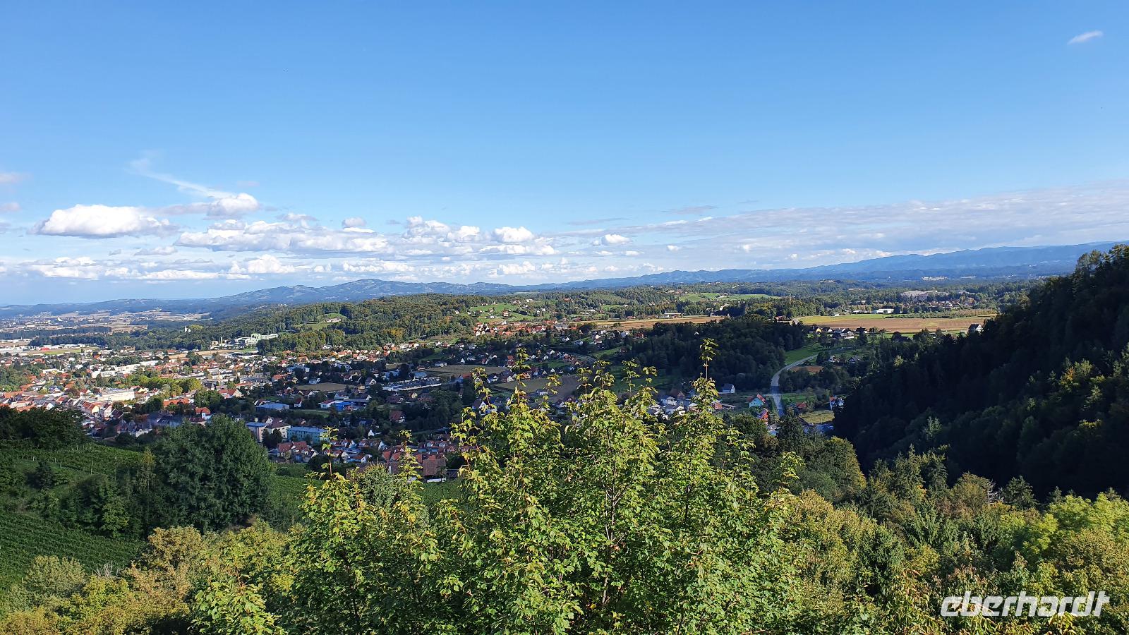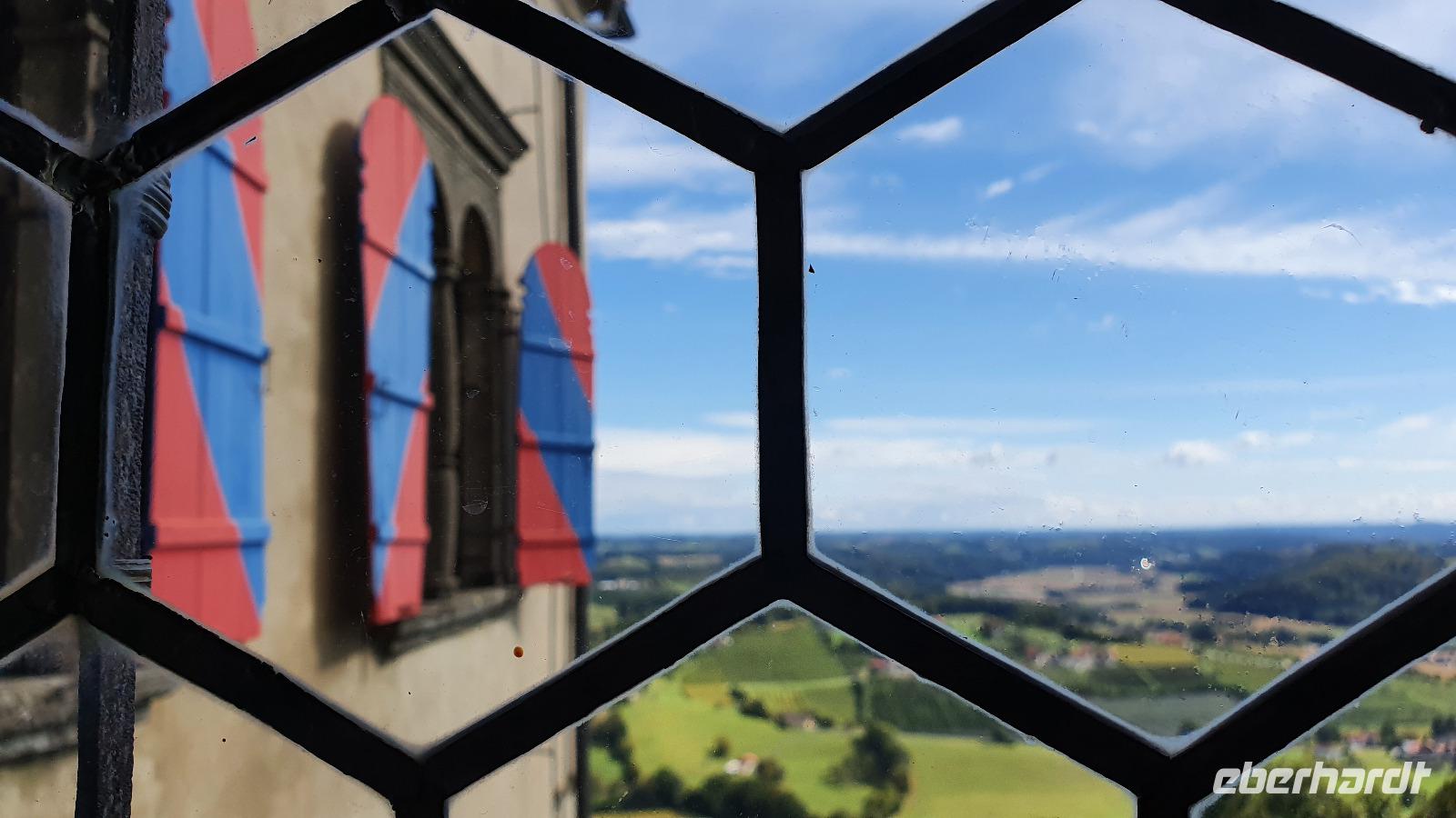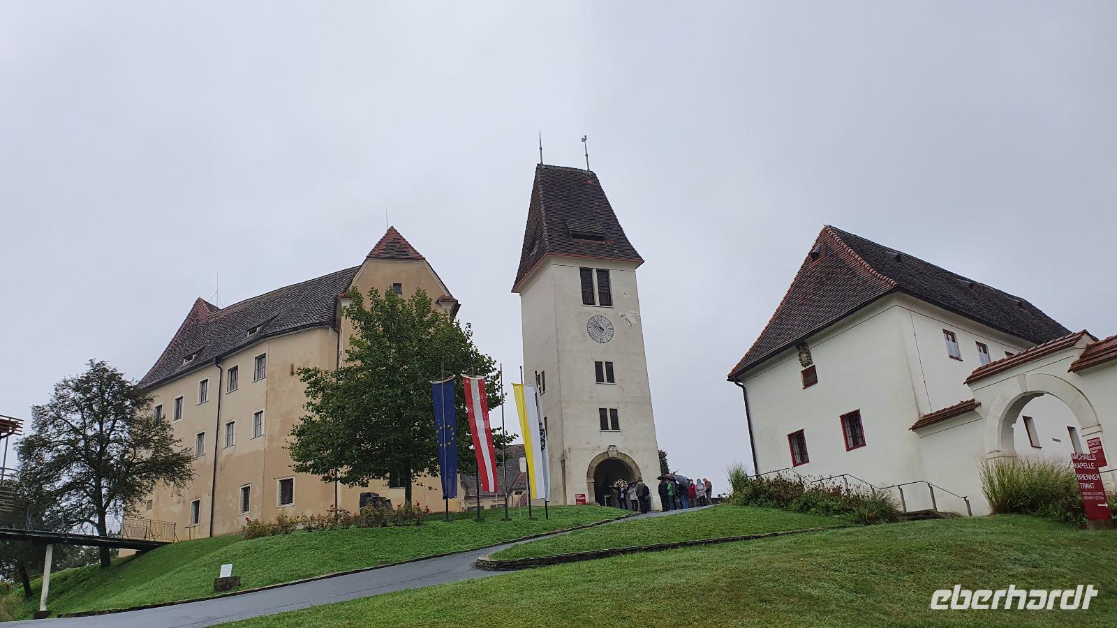 Sie liegt oberhalb des gleichnamigen Städtchens, wobei der Name nix mit deutschland zu tun hat. Früher hieß der Flecken Landsberg bzw. Landsburg. Das bedeutet im slawischen soviel wie Rodungsstelle, feuchte Wiese oder Waldbach. Den Vorsatz "deutsch" erhielt es nur, um den Ort von anderen gleichlautenden Orten abzugrenzen. Von hier oben, der Feste aus 1152, hatten wir einen phantastischen Blick ins Schilcher Weinland. Wer wollte sah sich im sehenswerten Museum um, Ausstellungen zu den Kelten, Silberschmuck, Waffen und auch eine Folterkammer waren zu besichtigen. Highlight aber auf jeden Fall der Turm, den man hinaufsteigen konnte und der nochmal einen tollen Rundumblick ins Land ermöglichte. Auf der Terrasse des Restaurant ließ es sich vorzüglich einen Kaffee mit Aussicht genießen oder auch einen Schilcher. Dann fuhren wir mit dem Bus weiter,