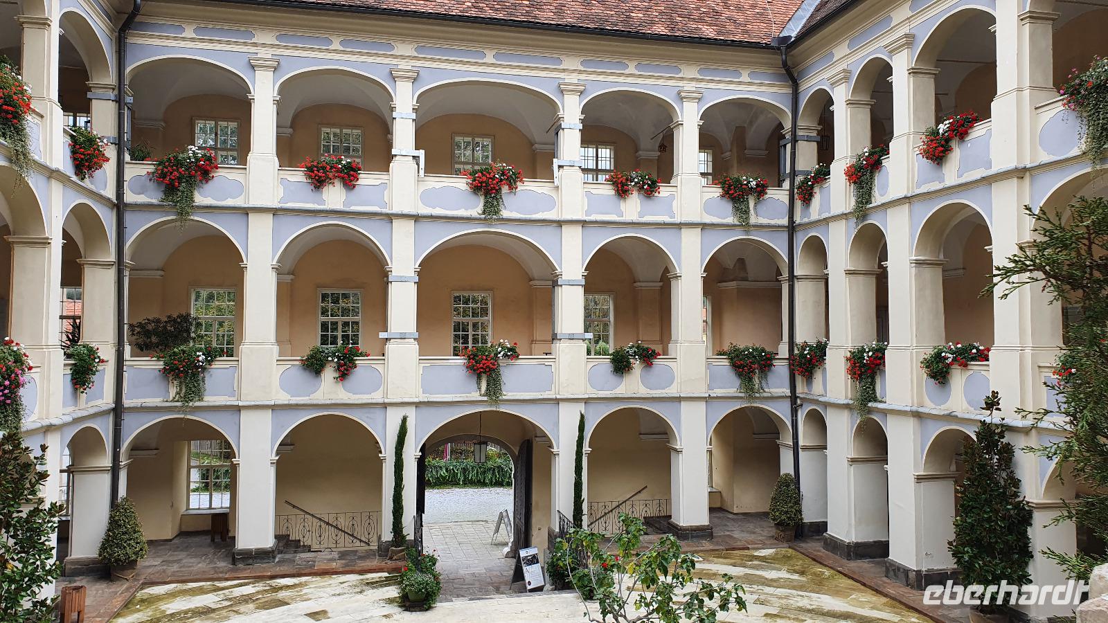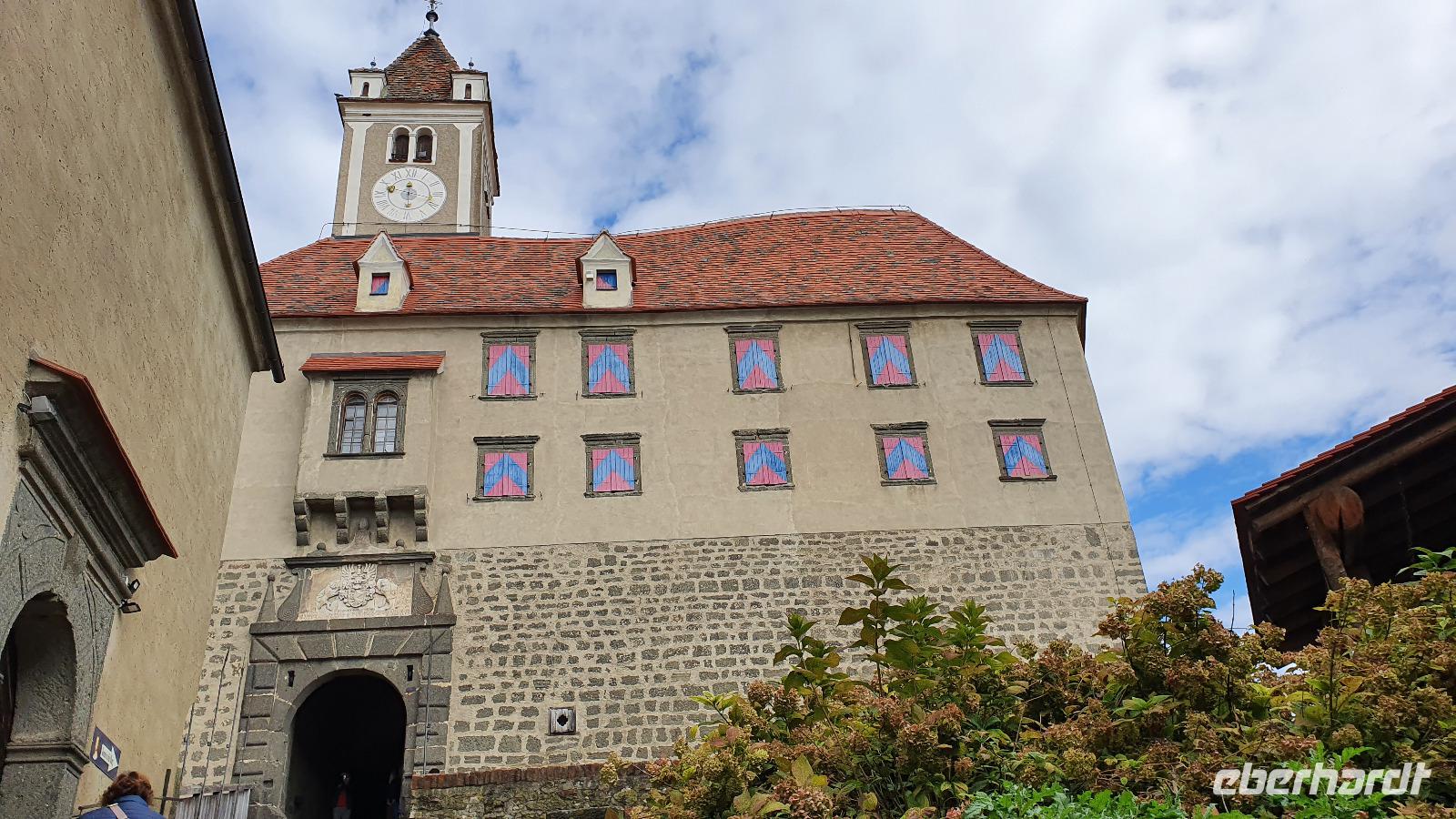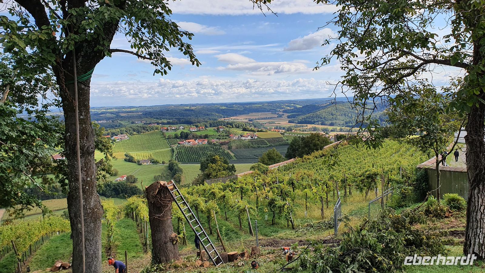 Sie liegt oberhalb des gleichnamigen Städtchens, wobei der Name nix mit deutschland zu tun hat. Früher hieß der Flecken Landsberg bzw. Landsburg. Das bedeutet im slawischen soviel wie Rodungsstelle, feuchte Wiese oder Waldbach. Den Vorsatz "deutsch" erhielt es nur, um den Ort von anderen gleichlautenden Orten abzugrenzen. Von hier oben, der Feste aus 1152, hatten wir einen phantastischen Blick ins Schilcher Weinland. Wer wollte sah sich im sehenswerten Museum um, Ausstellungen zu den Kelten, Silberschmuck, Waffen und auch eine Folterkammer waren zu besichtigen. Highlight aber auf jeden Fall der Turm, den man hinaufsteigen konnte und der nochmal einen tollen Rundumblick ins Land ermöglichte. Auf der Terrasse des Restaurant ließ es sich vorzüglich einen Kaffee mit Aussicht genießen oder auch einen Schilcher. Dann fuhren wir mit dem Bus weiter,