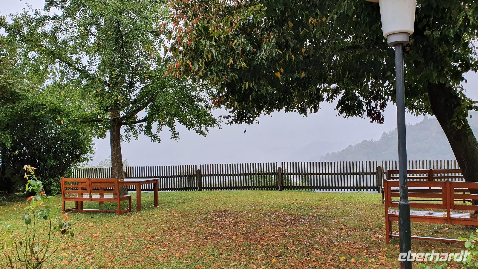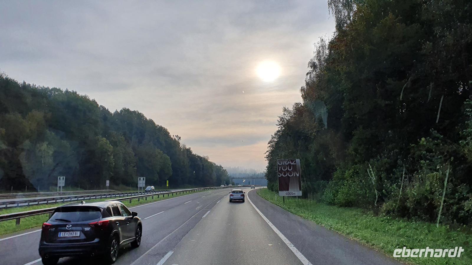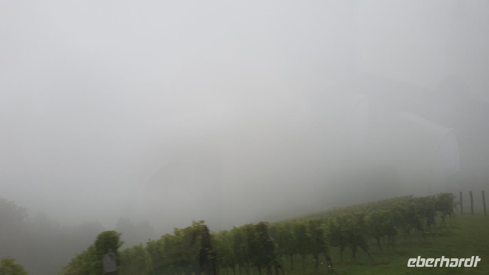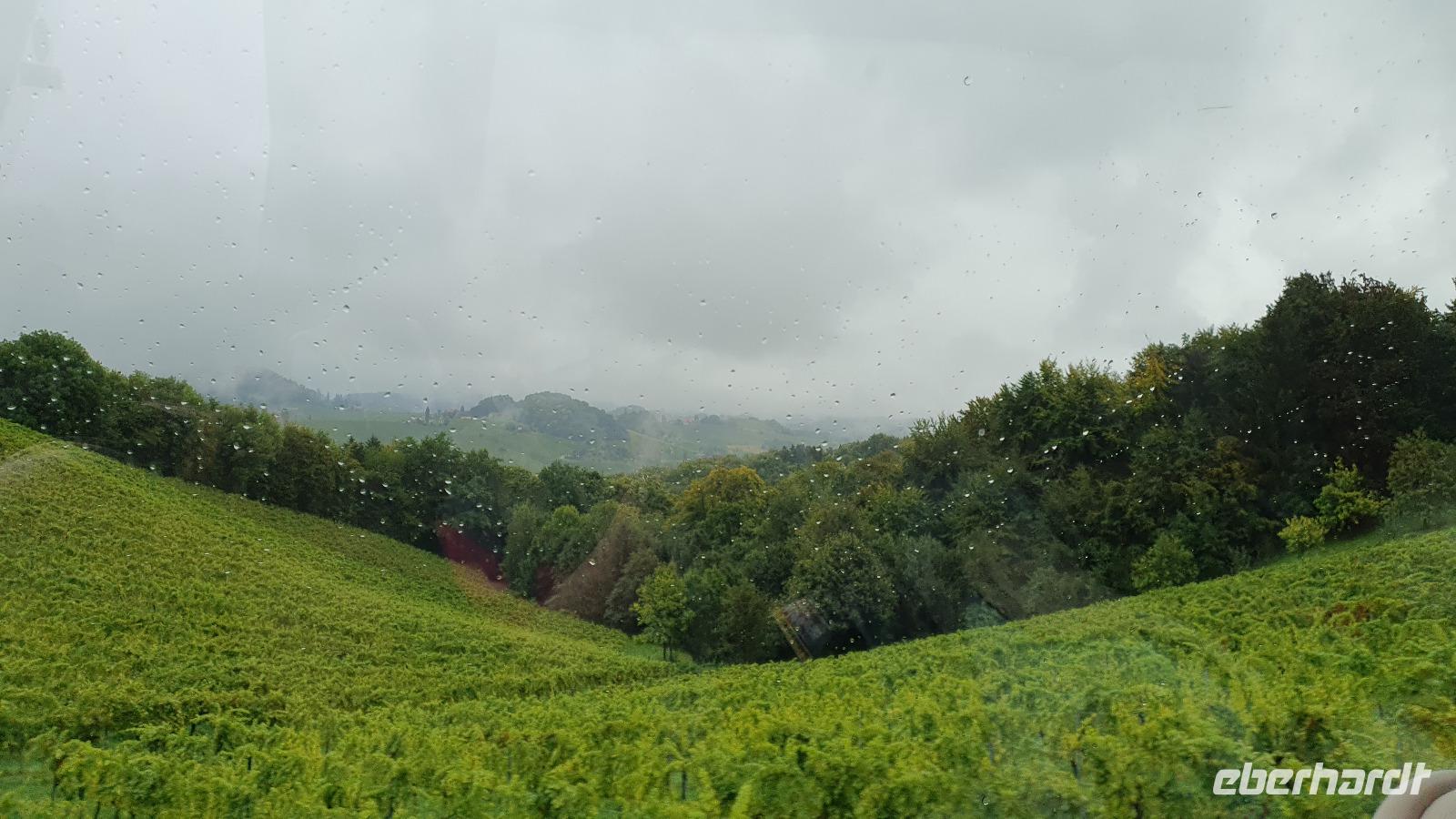 war unser Stichwort. Im Weinkeller konnten wir den hauseigenen Wein nämlich auch probieren. Auf 8 ha bauen sie hier im Sausal Wein an, es gibt eine Weinschule, eine Ausbildung und die jungen Weinbauern sind experimentierfreudig. Wir probieren einen 2019er Weißburgunder, trocken und frisch, dann einen Sauvignon Blanc und schließlich einen Meßwein- ja es gibt auch weißen Meßwein. Ein Cuvee aus verschiedenen Sorten von hier. Das Schiefergestein, auf dem die Weinberge sind, gibt den Weinen eine unverwechselbare Note. Beim Thema Wein bleiben wir. Es ist zwar immer noch nieselig und neblig, wir wagen aber eine Fahrt auf der