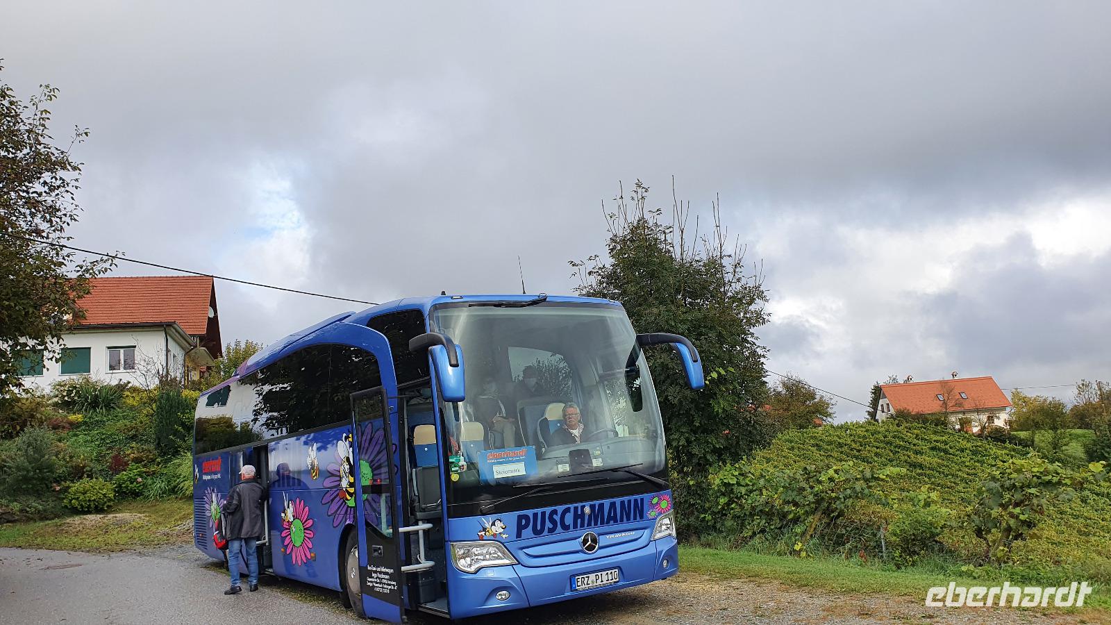 Und siehe da, mehr und mehr rissen die Wolken auf und gaben den Blick auf steile Weinhänge und Berge frei. Dann- Eberhardt machts möglich- hatten wir eine Überraschung vorbereitet: Natürlich kann man keine Weinstraße besuchen, ohne in einen Buschenschank einzukehren. Dies taten wir nun in St. Johann im Saggautal. Eine deftige Brotzeit, Weißburgunder und Traubensaft stärkten uns. So erreichten wir schließlich unser letztes Ziel für heute: