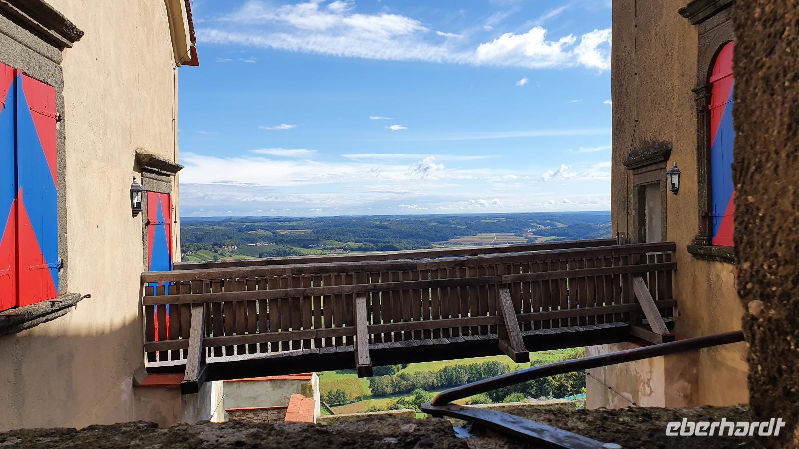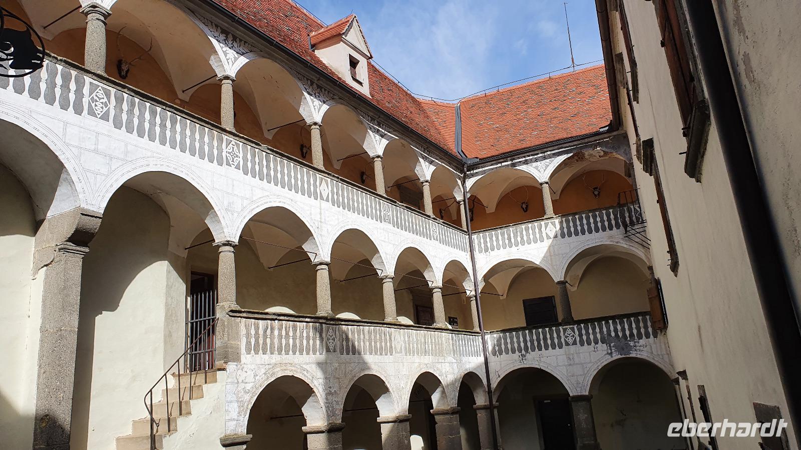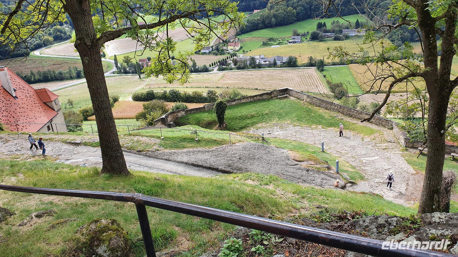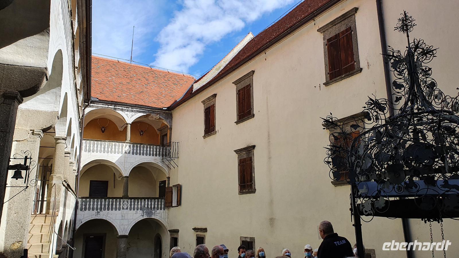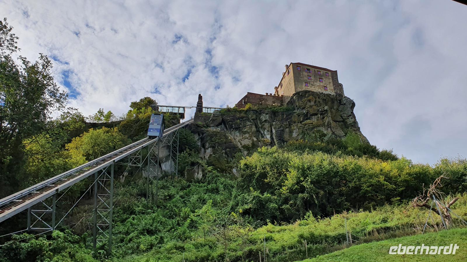 thront hoch oben auf einem Vulkanfelsen. Pünktlich erreichen wir den Fuss der Burg und ein Schrägaufzug bringt uns hinauf. Weiter hinauf geht es durch das Burgtor in den Innenhof. Hier schauen wir uns schon einmal um bis wir mit einer Führung durch die Burg beginnen. Hier haben sie auch ein Hexenmuseum und ich habe mich hinreißen lassen zu sagen: hoffentlich behalten sie mich nicht hier... Unsere Führung beginnt dann im hinteren Innenhof an der großen Zisterne. Eine Bohrung bis zum Grundwasser ist aufgrund des Vulkangesteins undenkbar, so fing man das Regenwasser auf. Die nächsten Räume zeigten das Leben der Bauern hier, der Boden gehörte ihnen nicht, ihre Pacht bezahlten sie mit Abgaben und Steuern. Im 17. Jahrhundert dann eine dunkle Zeit: Mißernten und Hagel wurden Hexen und Zauberern zugeschrieben, die Jagd auf die Hexen beginnt. Wir erfahren von der Blumenhexe Katharina Paldauf, dem Hexenpfarrer Georg Agricola...Die herrschaftlichen Räume sind der "Gallerin" gewidmet, auch als "Schlimme Liesl" bekannt. Immerhin war sie drei mal verheiratet und ließ sich sogar vom letzten scheiden, setzte ihren Kopf mit Prozessen durch, wenn es sein mußte, ließ aber viel bauen und das heutige Aussehen der Burg ist im wesentlichen auf sie zurückzuführen. Dann der Rittersaal: Prachtvoll ausgestattet ist er, hier wurde gezecht und getafelt, was das Zeug hielt. Und wer nicht mehr konnte, der ging auf die Speibrücke. Dann konnte es weiter gehen. Krönender Abschluß unseres Rundganges waren der weiße Barocksaal und die Kapelle, die heute jedoch nicht mehr genutzt wird. Nun war Zeit für einen individuellen Rundgang. Wer wollte sah sich wie ich das