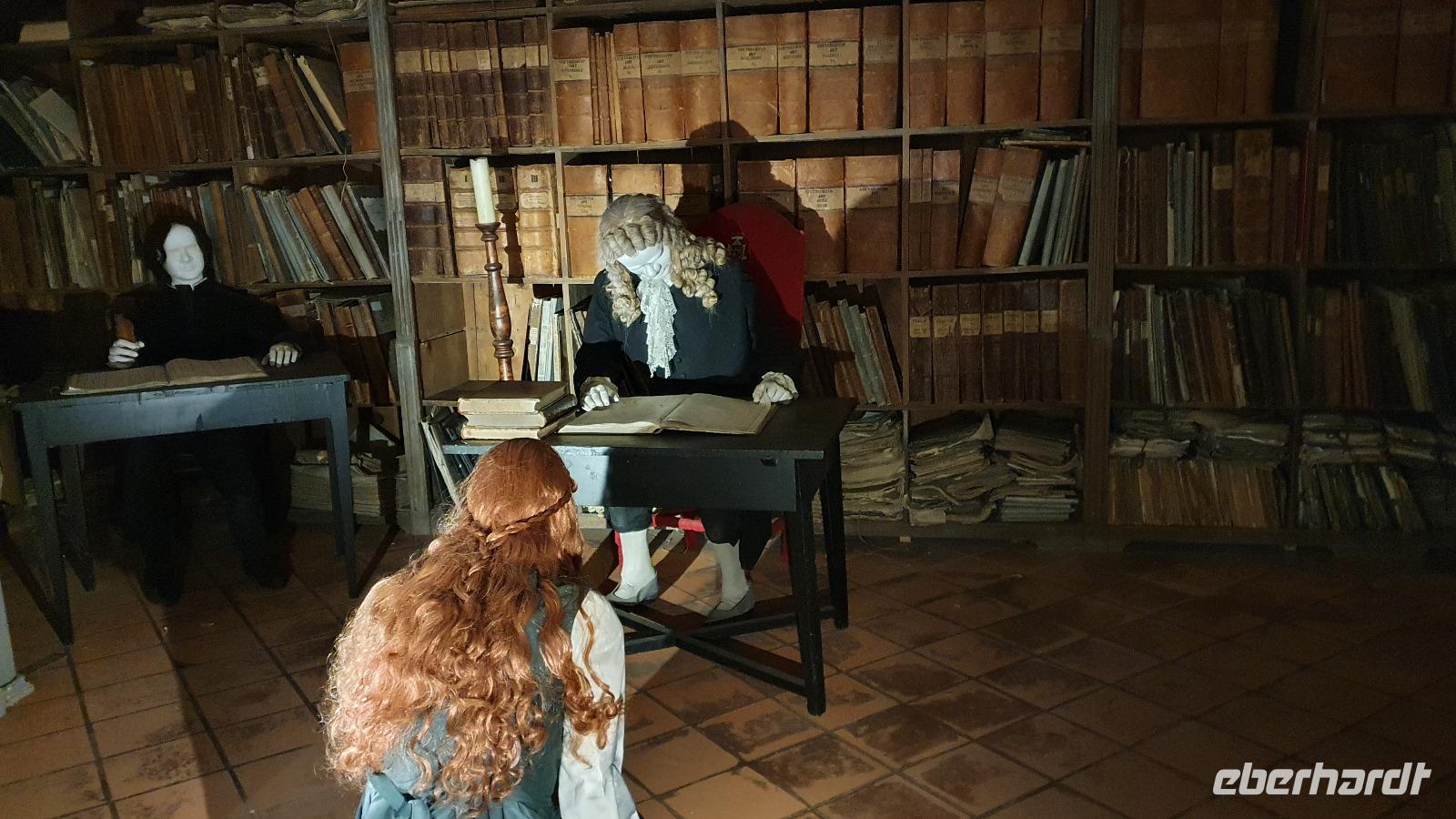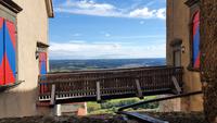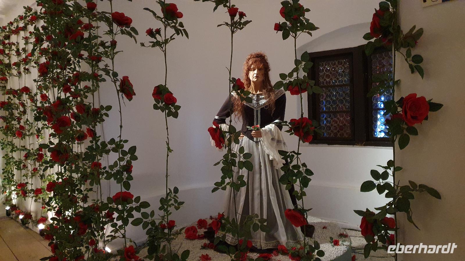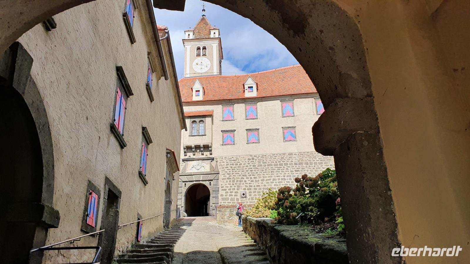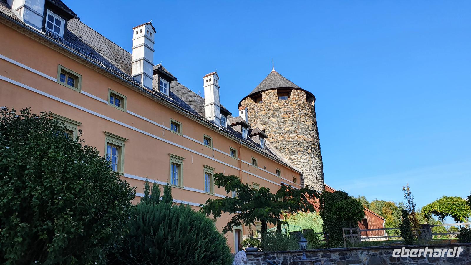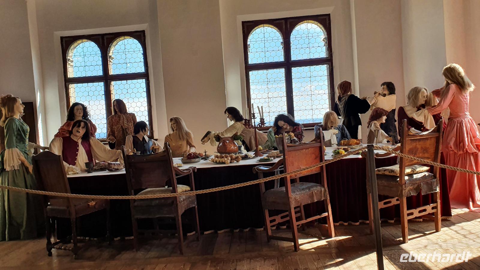 thront hoch oben auf einem Vulkanfelsen. Pünktlich erreichen wir den Fuss der Burg und ein Schrägaufzug bringt uns hinauf. Weiter hinauf geht es durch das Burgtor in den Innenhof. Hier schauen wir uns schon einmal um bis wir mit einer Führung durch die Burg beginnen. Hier haben sie auch ein Hexenmuseum und ich habe mich hinreißen lassen zu sagen: hoffentlich behalten sie mich nicht hier... Unsere Führung beginnt dann im hinteren Innenhof an der großen Zisterne. Eine Bohrung bis zum Grundwasser ist aufgrund des Vulkangesteins undenkbar, so fing man das Regenwasser auf. Die nächsten Räume zeigten das Leben der Bauern hier, der Boden gehörte ihnen nicht, ihre Pacht bezahlten sie mit Abgaben und Steuern. Im 17. Jahrhundert dann eine dunkle Zeit: Mißernten und Hagel wurden Hexen und Zauberern zugeschrieben, die Jagd auf die Hexen beginnt. Wir erfahren von der Blumenhexe Katharina Paldauf, dem Hexenpfarrer Georg Agricola...Die herrschaftlichen Räume sind der "Gallerin" gewidmet, auch als "Schlimme Liesl" bekannt. Immerhin war sie drei mal verheiratet und ließ sich sogar vom letzten scheiden, setzte ihren Kopf mit Prozessen durch, wenn es sein mußte, ließ aber viel bauen und das heutige Aussehen der Burg ist im wesentlichen auf sie zurückzuführen. Dann der Rittersaal: Prachtvoll ausgestattet ist er, hier wurde gezecht und getafelt, was das Zeug hielt. Und wer nicht mehr konnte, der ging auf die Speibrücke. Dann konnte es weiter gehen. Krönender Abschluß unseres Rundganges waren der weiße Barocksaal und die Kapelle, die heute jedoch nicht mehr genutzt wird. Nun war Zeit für einen individuellen Rundgang. Wer wollte sah sich wie ich das