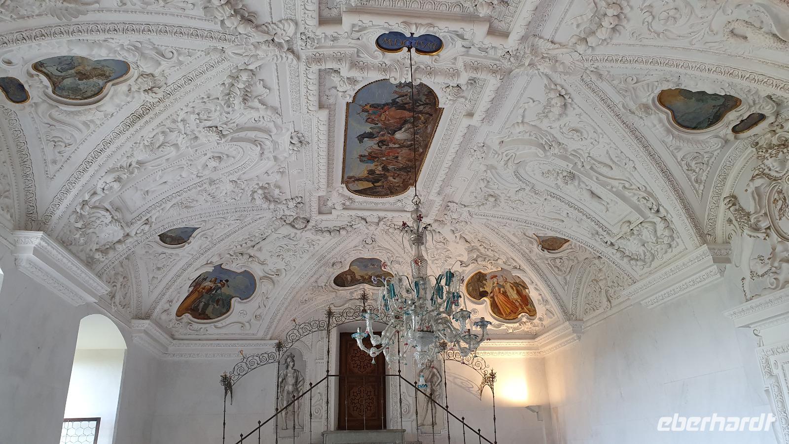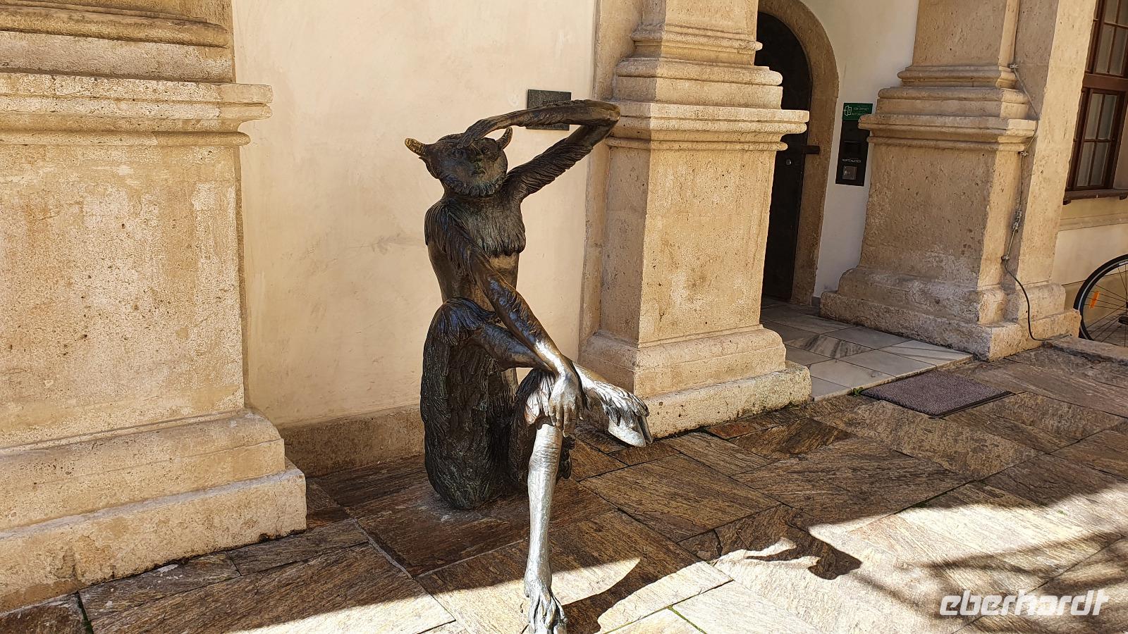 Gleich daneben das alte Schloss, heute Sitz der Landesregierung. Hier können wir eine architektonische Kostbarkeit erleben- die Doppelwendeltreppe. Die müssen wir natürlich auch gleich ausprobieren. An der Fassade sind noch einige wenige originale Stücke erhalten, wie es früher einmal ausgesehen hat. Leider wurde im Zuge der Modernisierung vieles abgerissen bzw. verbaut. Unser Spaziergang führt uns weiter, am Mausoleum vorbei mir seinem imposanten Eingangsportal zum Glockenspiel. Wir kommen punktgenau- das