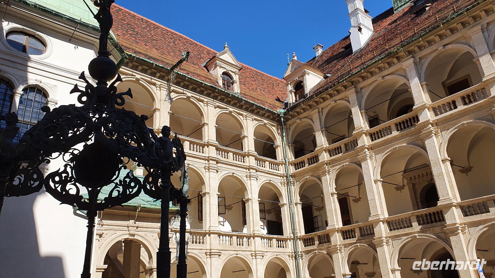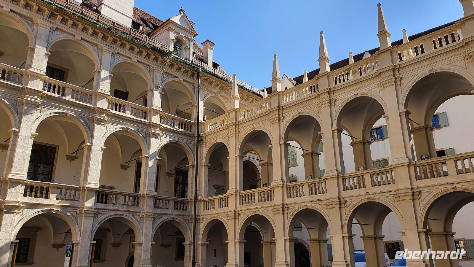 hat gerade angefangen. Also schauen wir zu und genießen den Blick auf charmante Häuser und Gassen. Die gehen wir aber nicht entlang sondern laufen in den Bogengängen. Hier erfahren wir, dass man so auch bei Regen trockenen Fusses durch die Stadt kommt, es gibt unzählige dieser Höfe, Arcaden und Verbindungen. Wir passieren den Generalihof und erreichen das