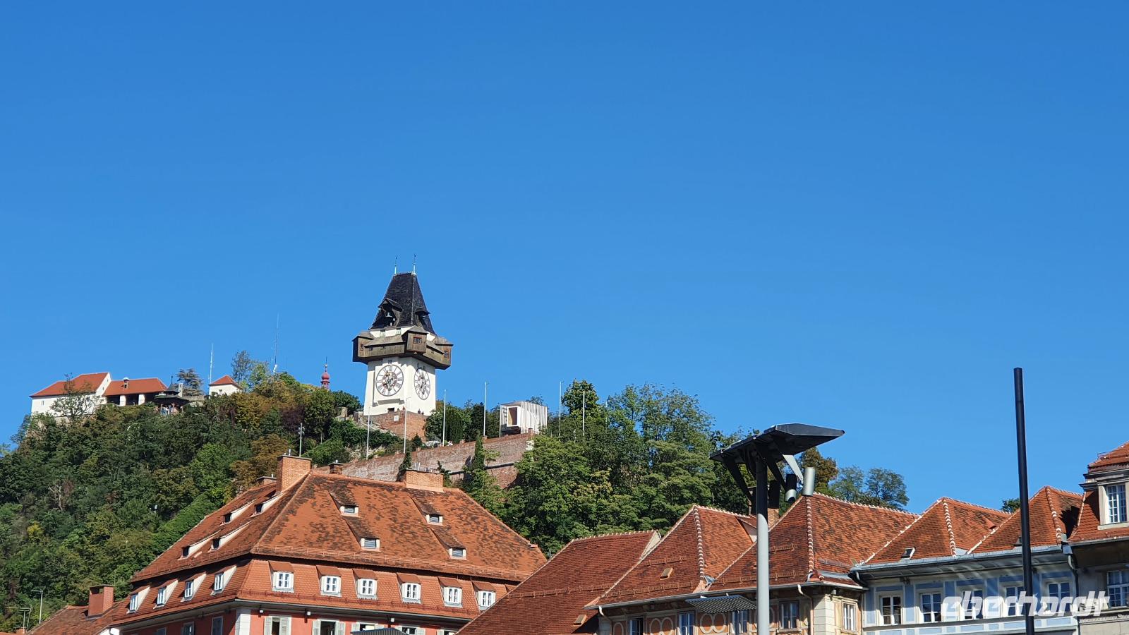 Bei genauerem Hinsehen entdeckt man auch, dass die Zeiger hier "vertauscht" sind. Der kleine zeigt nämlich die Minuten und der große die Stunden. Früher hatte man nur einen Zeiger für die Stunden, erst viel später kam der Zeiger für die Minuten dazu. Gar nicht so einfach, hier die Zeit abzulesen. Nun ist Freizeit- den ganzen Nachmittag haben wir zum Spazieren, Bummeln und Entdecken. Und das bei bestem Kaiserwetter. Viele laufen noch hinauf zur Burg, schauen sich die Kasematten an, wo heute eine Bühne steht und den Hackher-Löwen. Immer wieder hat man tolle Aussichten auf die Stadt, entdeckt die Murinsel und das Kunsthaus- die "blaue Blase" wie es genannt wird. Mit unseren Tickets können wir mit dem Lift wieder hinabfahren, die vielen Cafes und Restaurants in der Stadt locken zu einer Mittagspause und die Parks zum Entspannen. So vergeht die Zeit wie im Flug und an der Talstation der Schloßbergbahn schließlich holt uns unser Bus wieder ab. So machen wir uns auf den Weg nach Semriach zum Hotel, treffen uns zum Abendessen wieder und genießen unser leckeres 3-Gänge-Menü.
