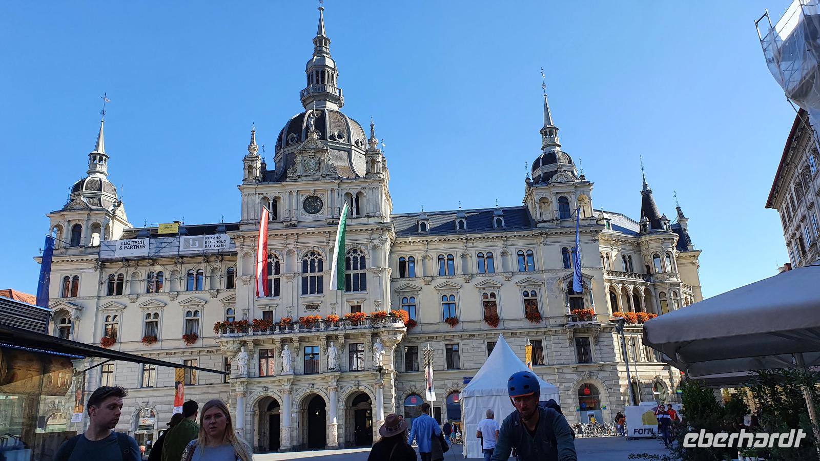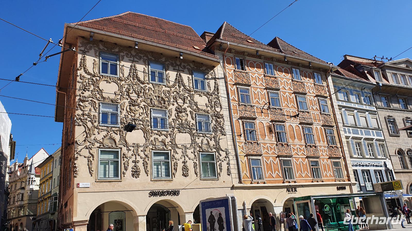 Die Landstube - ehemals Versammlungssaal der Landstände- ist heute Sitzungssaal des Grazer Parlamentes. Ab dem frühen 16. Jahrhundert wurde das Landhaus errichtet und immer wieder um- und angebaut. Heute ist es ein beeindruckender Renaissancebau. Am Landhausbrunnen lauschen wir den Erklärungen und sind von der Pracht hier beeindruckt. Dann erreichen wir den Hauptplatz mit dem Rathaus und sehen bei strahlendem Sonnenschein den Grazer Uhrturm. Wie eine Postkarte. Wir werfen noch einen Blick auf die ältesten Häuser von Graz (hier wird in Jahrhunderten gemessen) und erreichen schließlich die