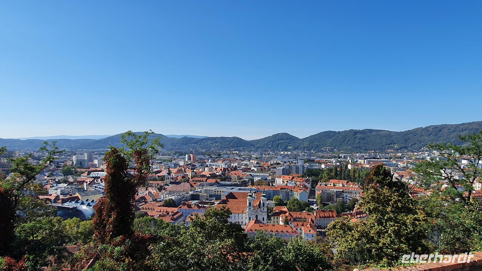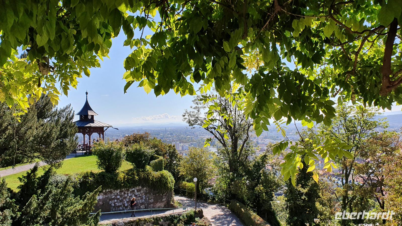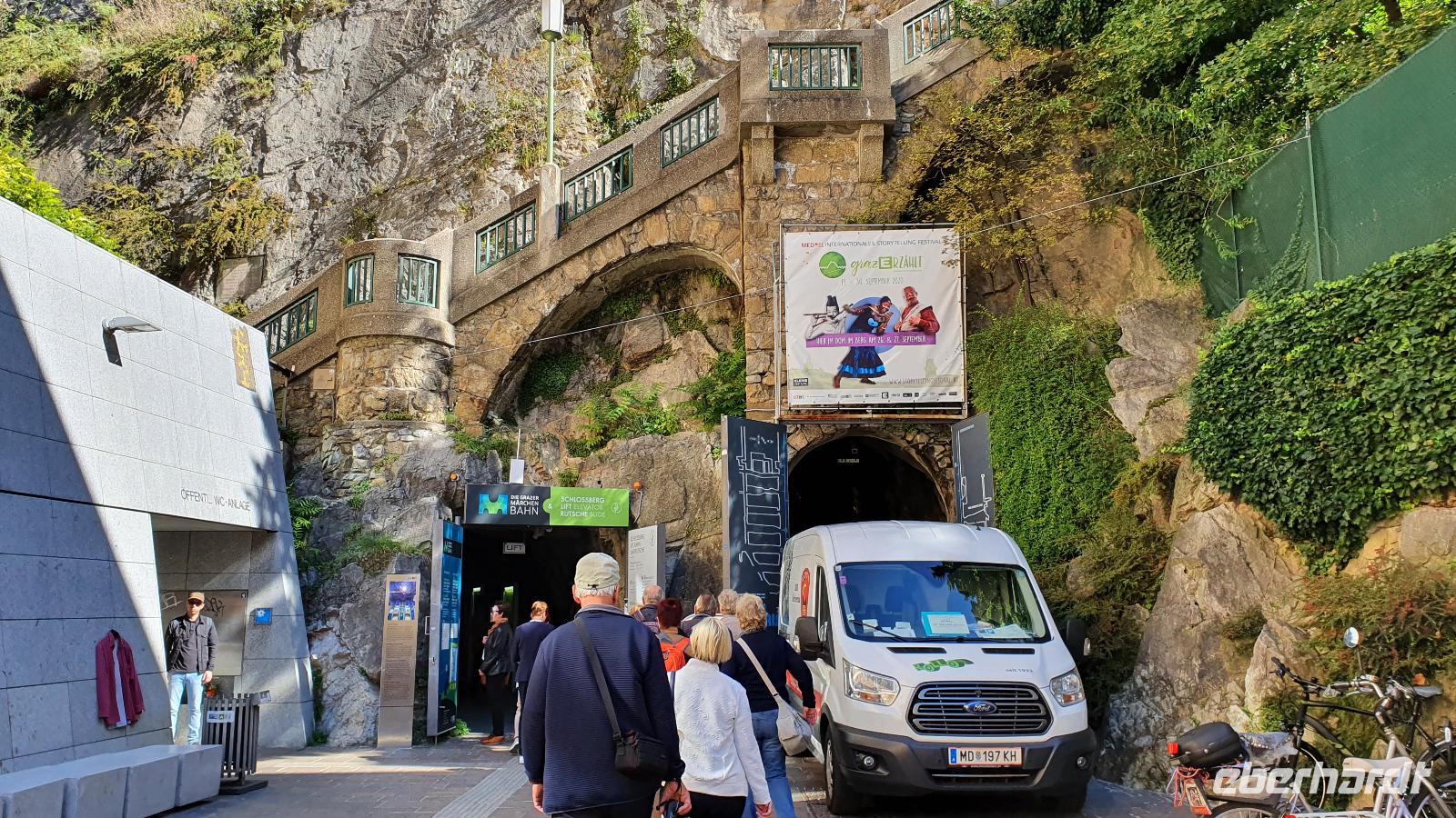 mit ihren 260 Stufen. Im Zick-Zack verläuft sie nach oben und auf Aussichtsplattformen kann man ein wenig verschnaufen. Wir aber nehmen lieber der gläsernen Lift im Berg und fahren damit nach oben. Vorher schauen wir uns noch an, wo der Bus uns wieder abholt. Auf dem Schloßberg angekommen verabschieden wir uns von unseren Stadtführern- so schnell war die Zeit verflogen! Bei einem Glas Wein genießen wir die Aussicht auf die Stadt und den