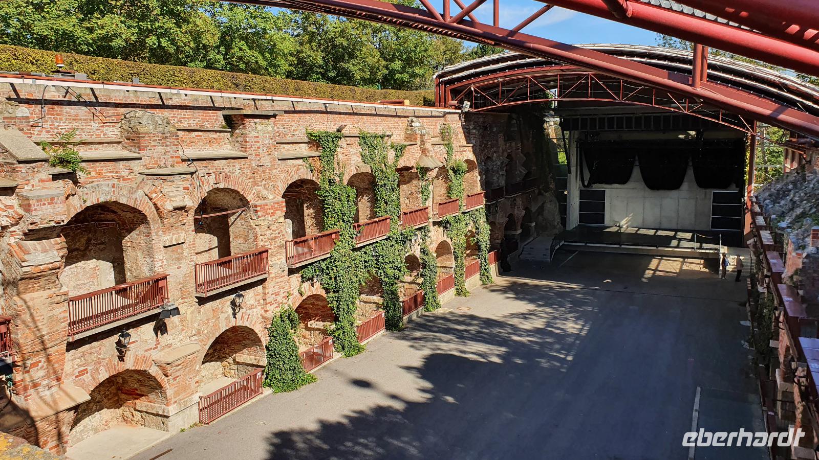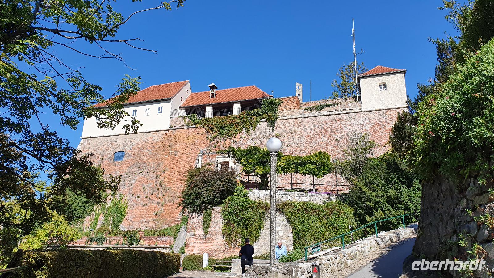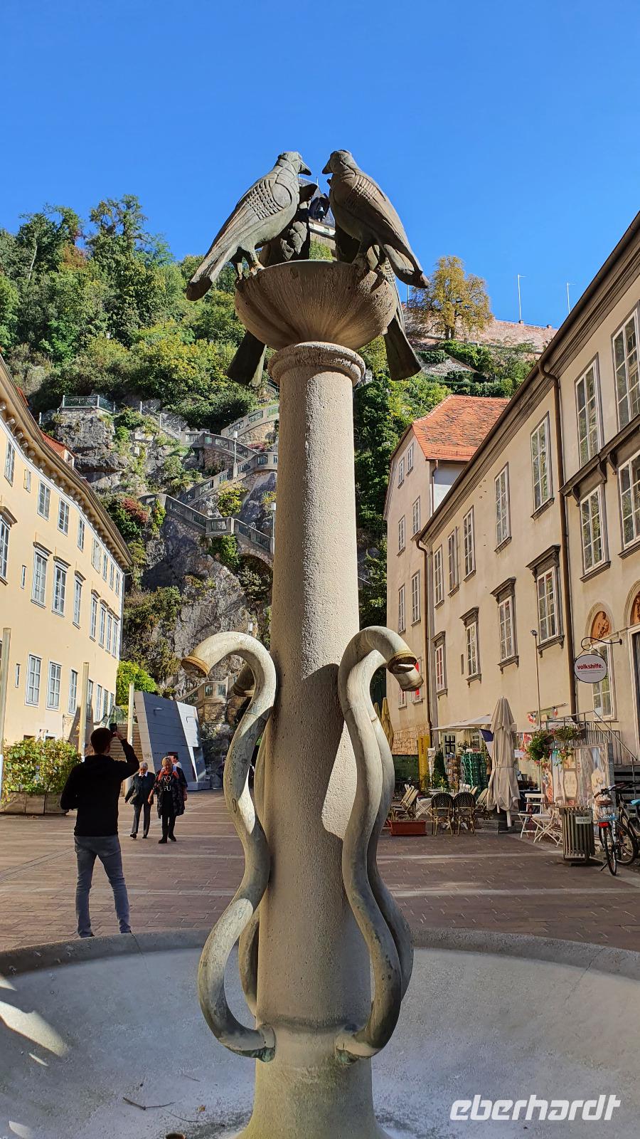 mit ihren 260 Stufen. Im Zick-Zack verläuft sie nach oben und auf Aussichtsplattformen kann man ein wenig verschnaufen. Wir aber nehmen lieber der gläsernen Lift im Berg und fahren damit nach oben. Vorher schauen wir uns noch an, wo der Bus uns wieder abholt. Auf dem Schloßberg angekommen verabschieden wir uns von unseren Stadtführern- so schnell war die Zeit verflogen! Bei einem Glas Wein genießen wir die Aussicht auf die Stadt und den